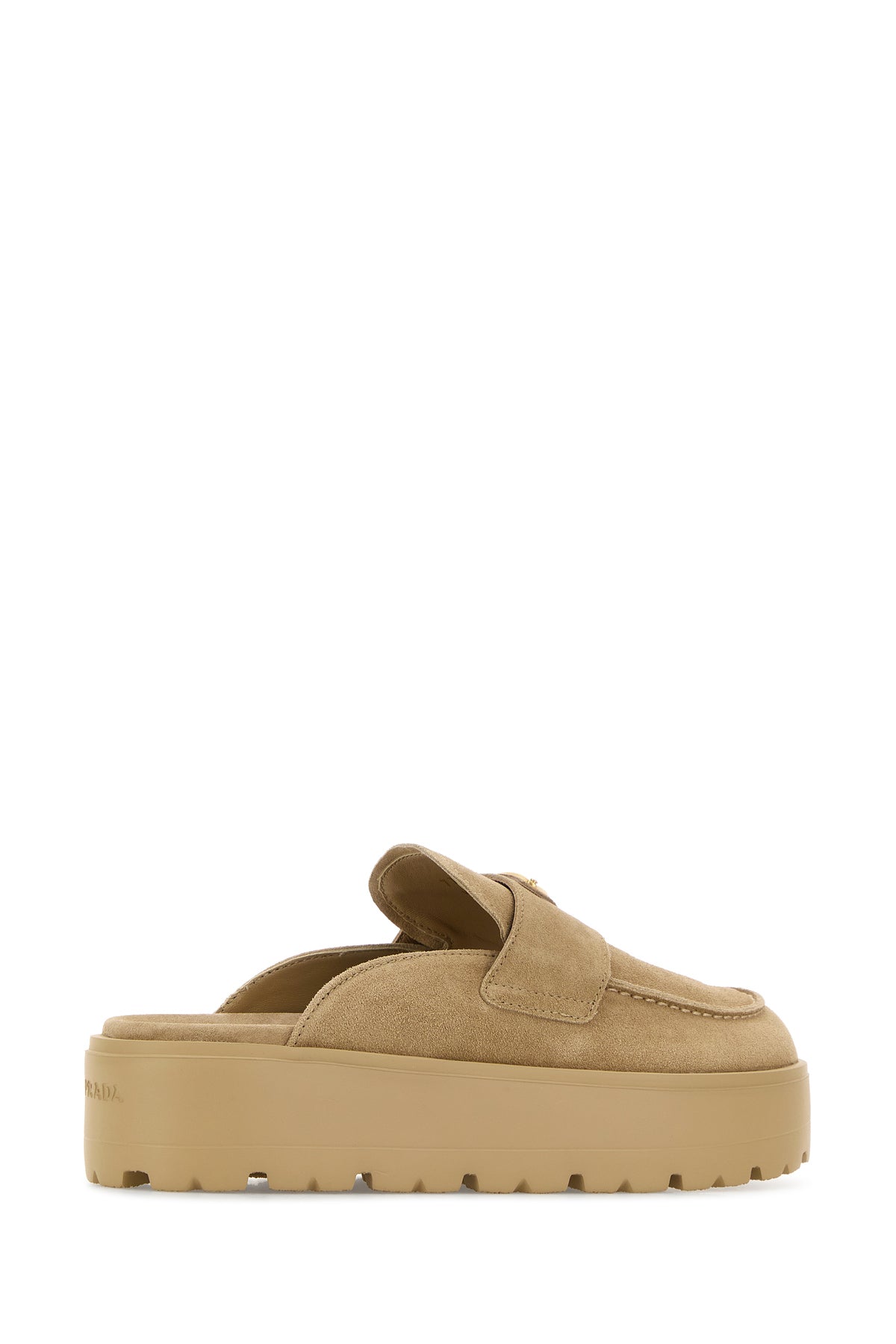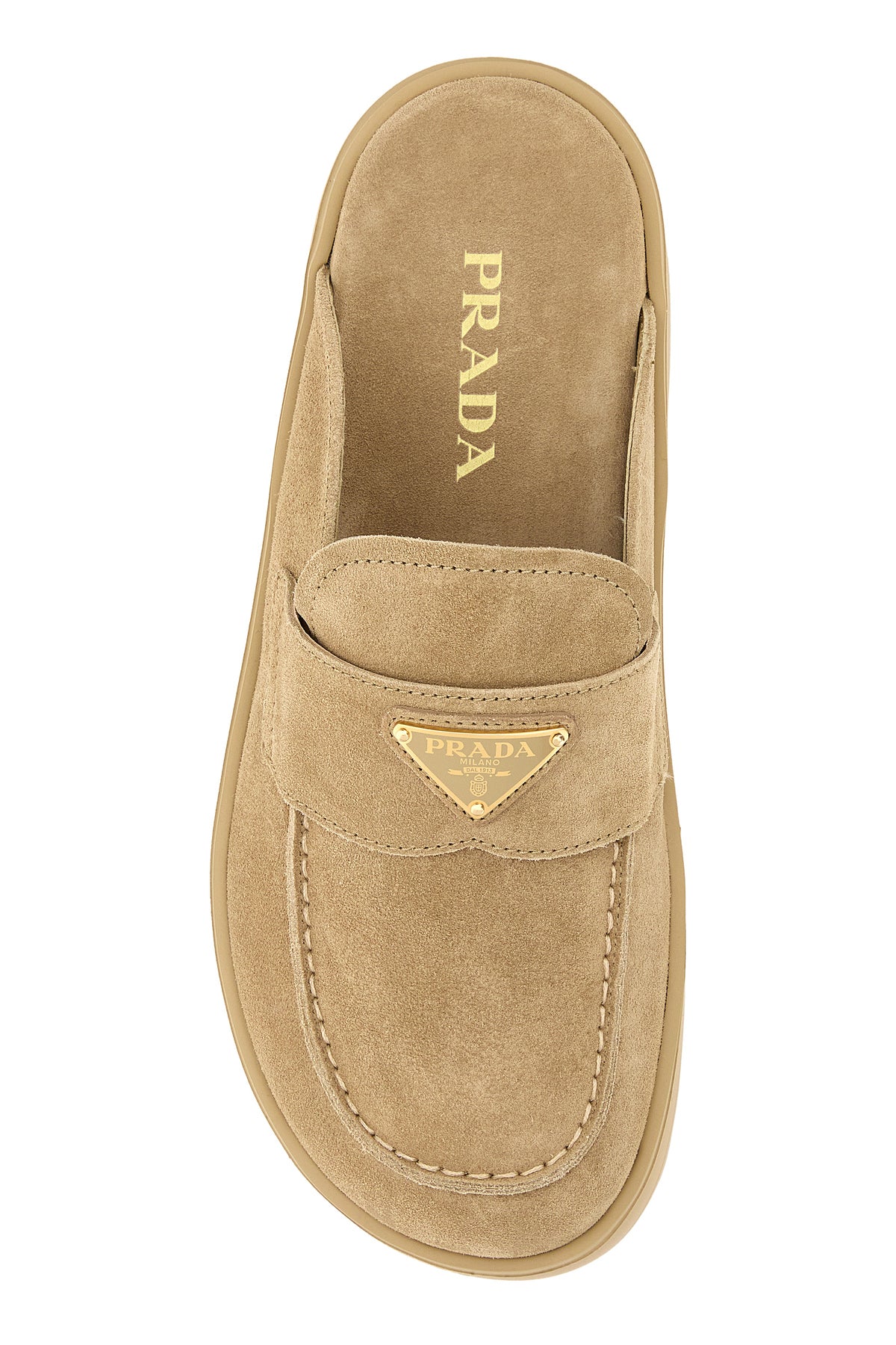 Slippers realized in calf suede enriched by metal iconic logoed triangle on the instep.
