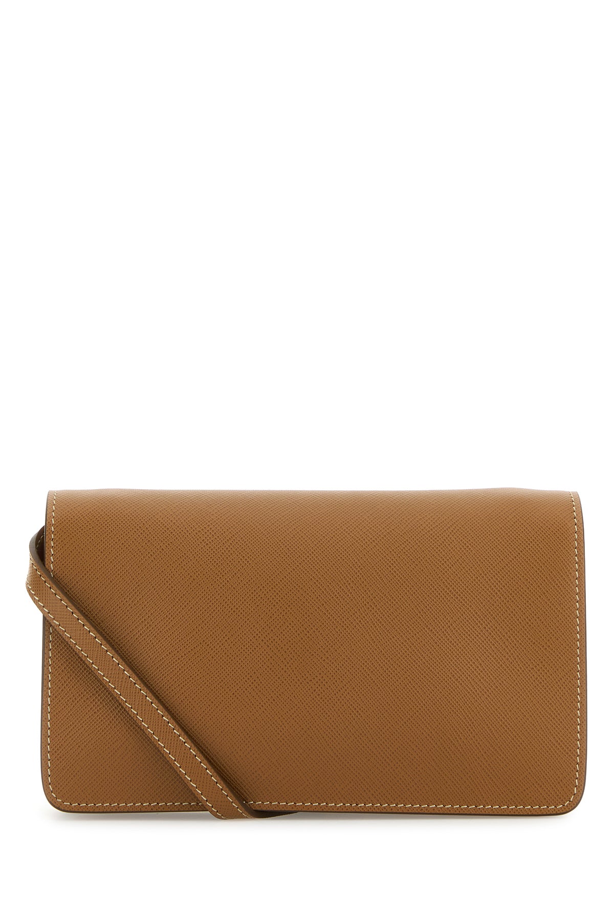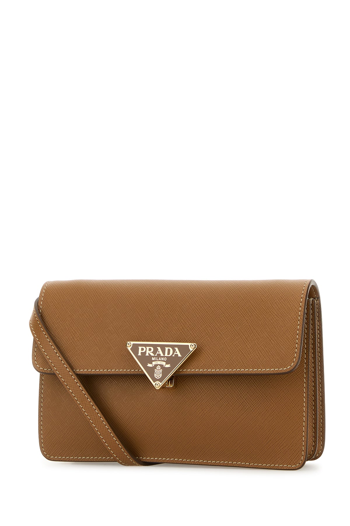 Crossbody bag realized in Saffiano calf leather enriched by metal iconic logoed triangle at the front.