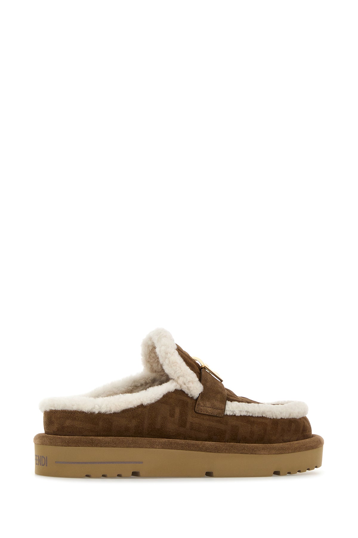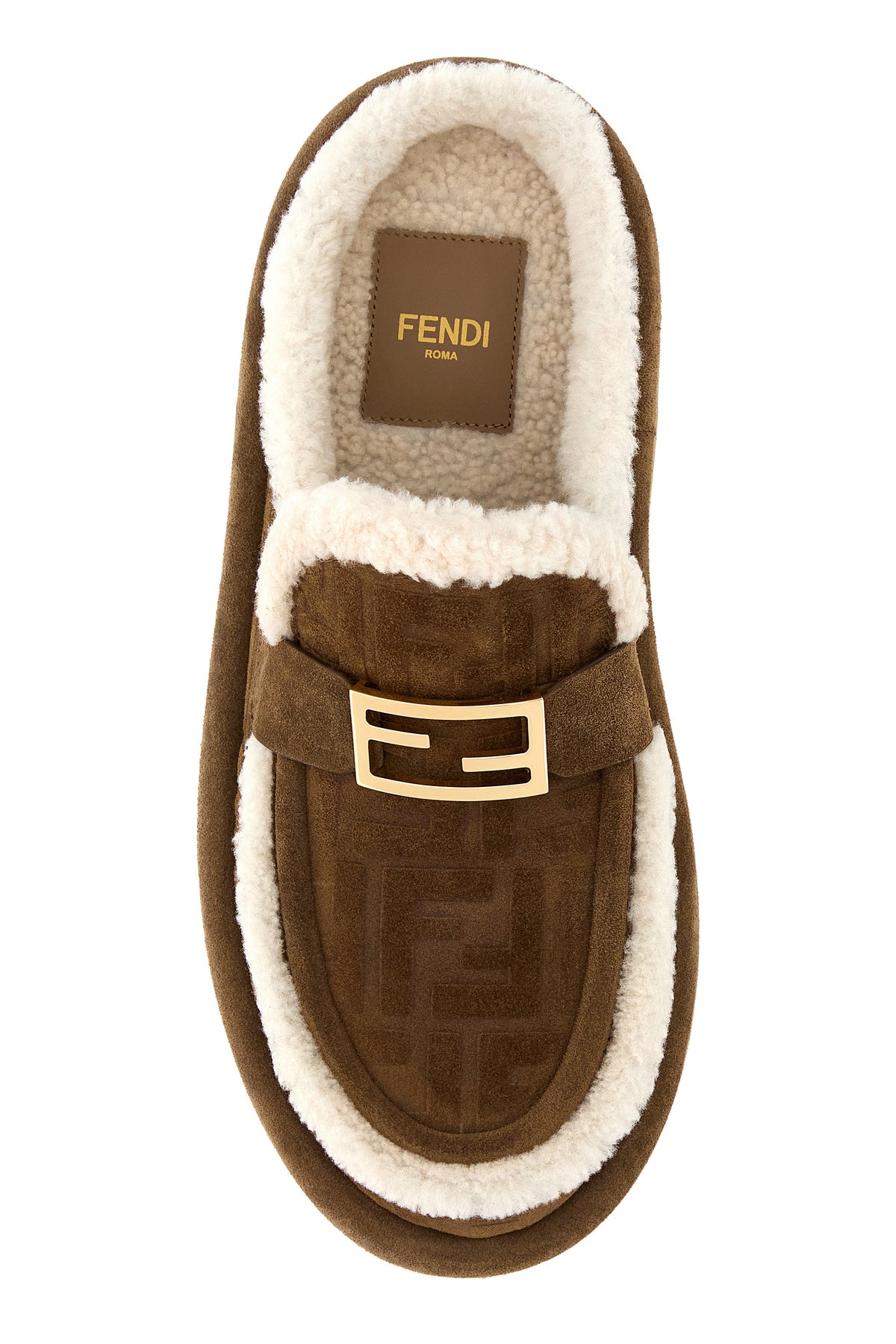 Slippers realized in calf suede characterized by embossed FF motif on the entire surface enriched by metal Baguette detail on the instep.