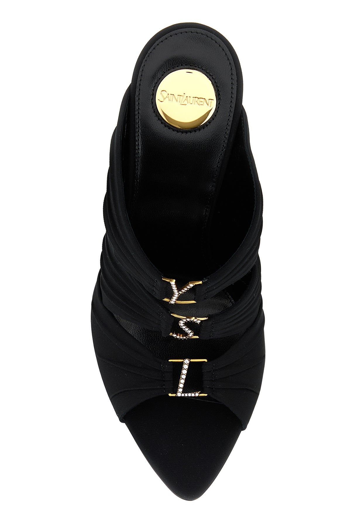 Mules realized in fabric enriched by logoed metal lettering with rhinestones.