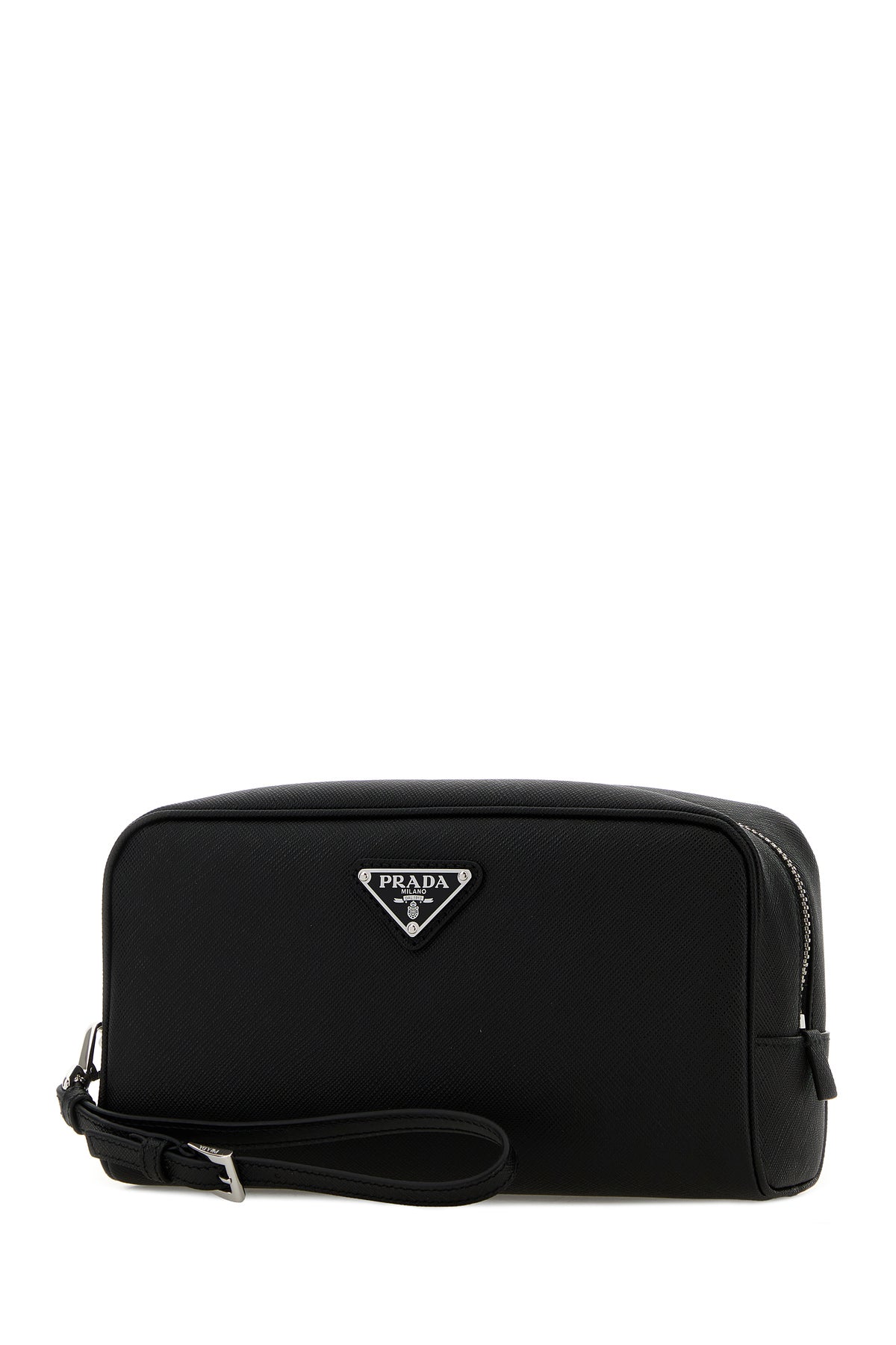 Beauty case realized in Saffiano leather enriched by iconic logoed metal triangle at the front.