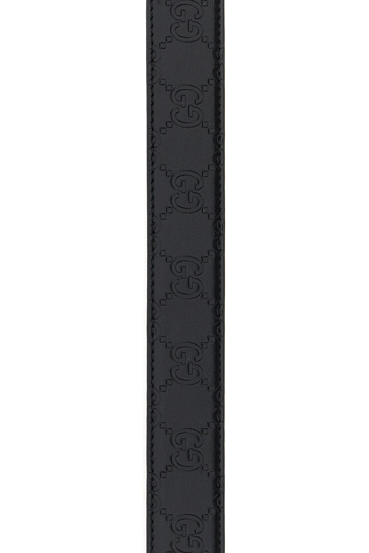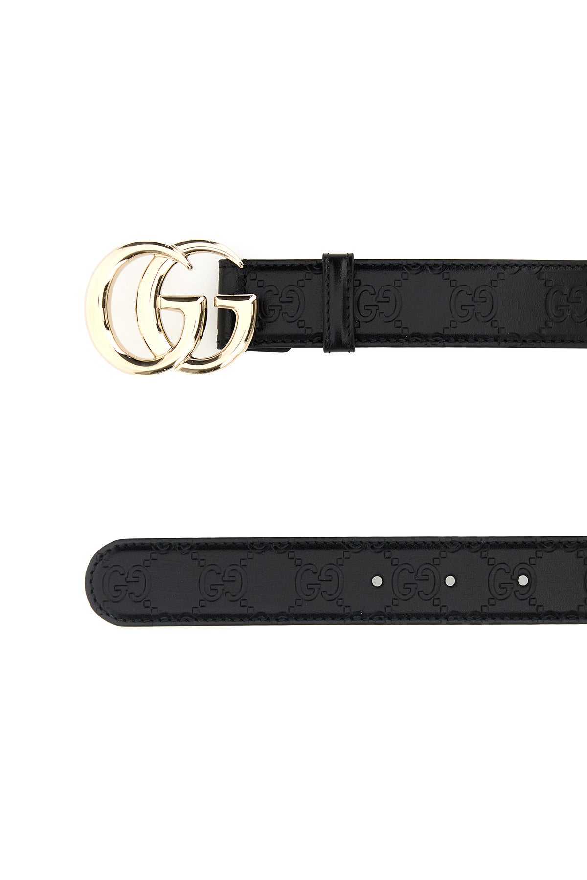 Belt realized in leather characterized by embossed GG motif on the entire surface enriched by GG metal buckle.