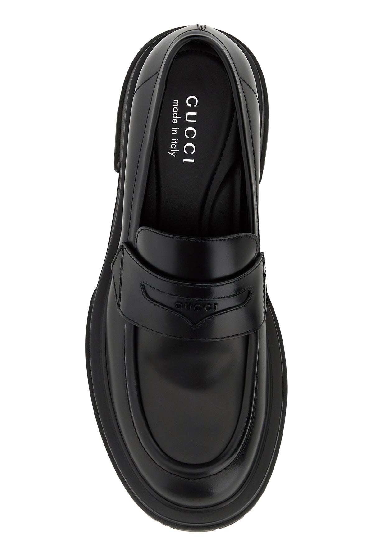 Loafers realized in polished finish smooth leather enriched by metal lettering logo on the vamp.