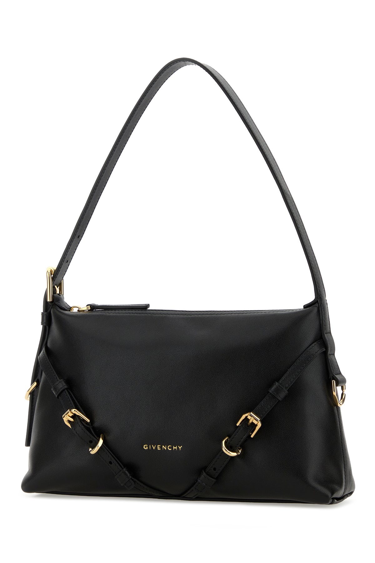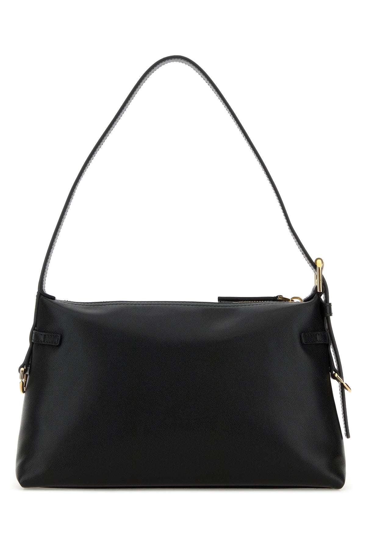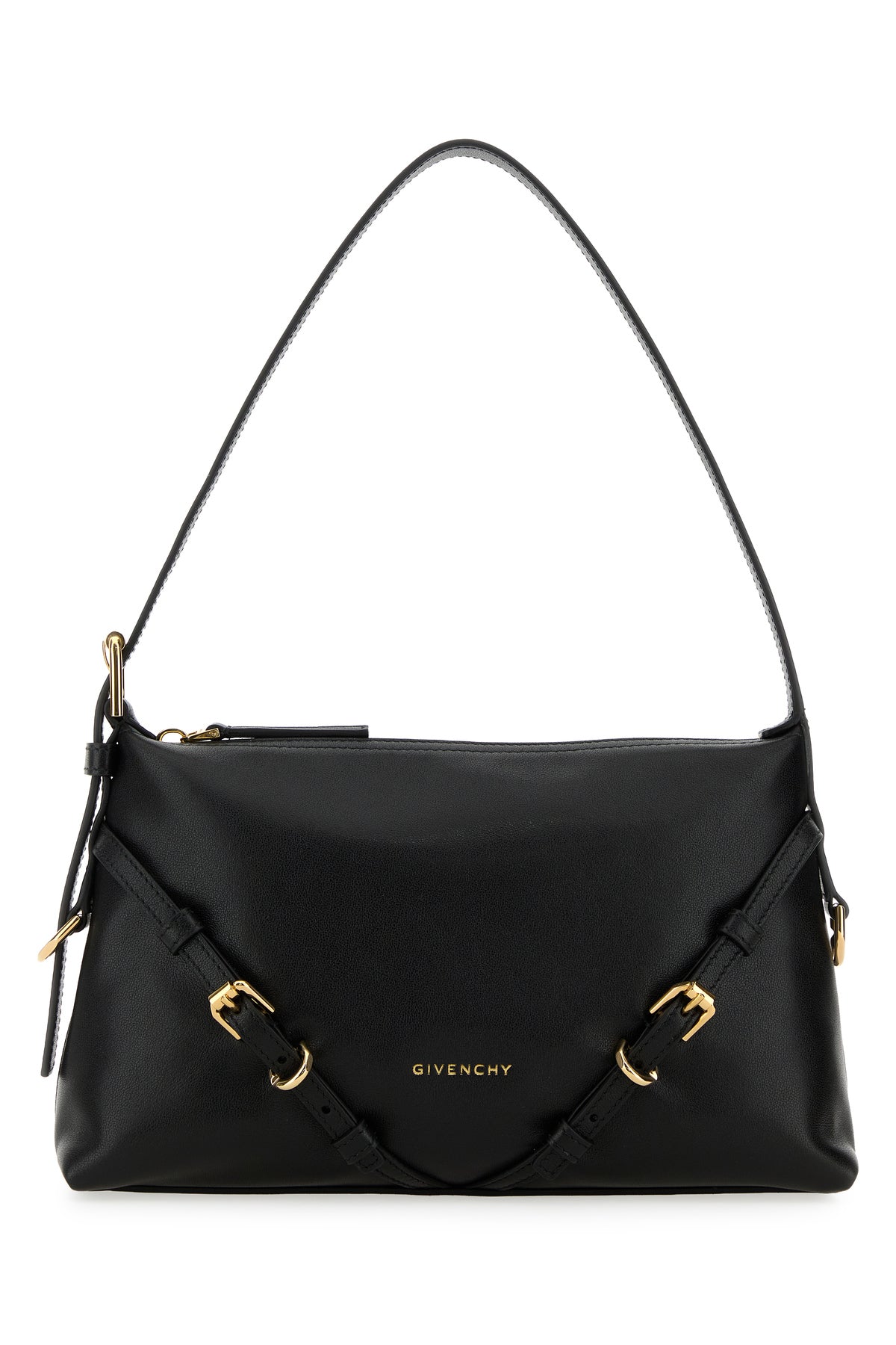 Shoulder bag realized in pebble calf leather characterized by laminated printed logo enriched by straps at the front.