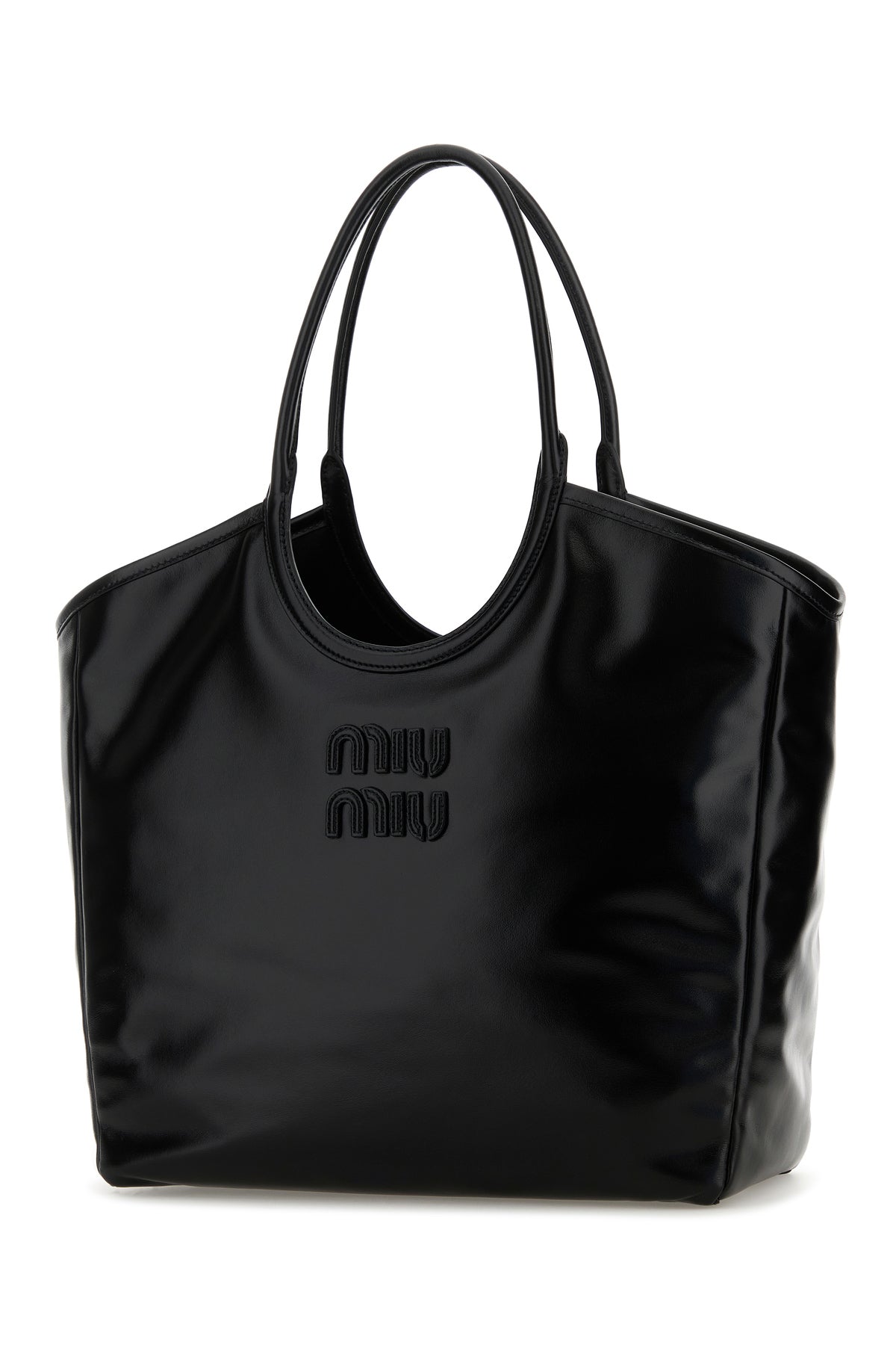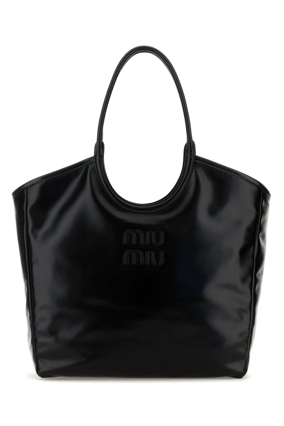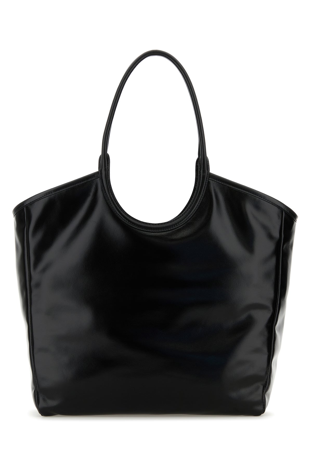 Shopping bag realized in polished finish leather enriched by logoed patch at the front.