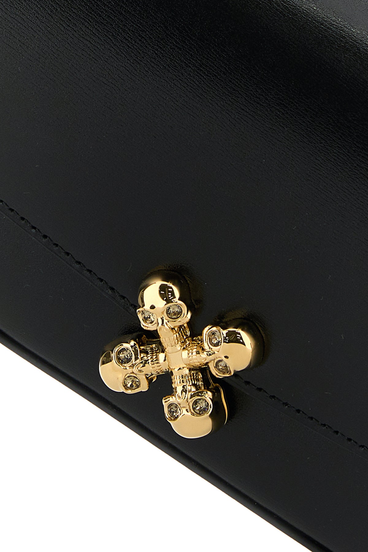 Crossbody bag realized in smooth calf leather characterized by laminated printed logo at the back enriched by Skull Flower McQueen metal detail at the front.