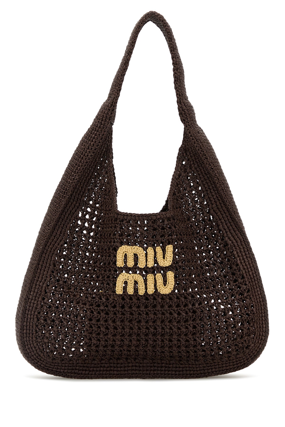 Shopping bag realized in crochet characterized by contrasting embroidered logo at the front.