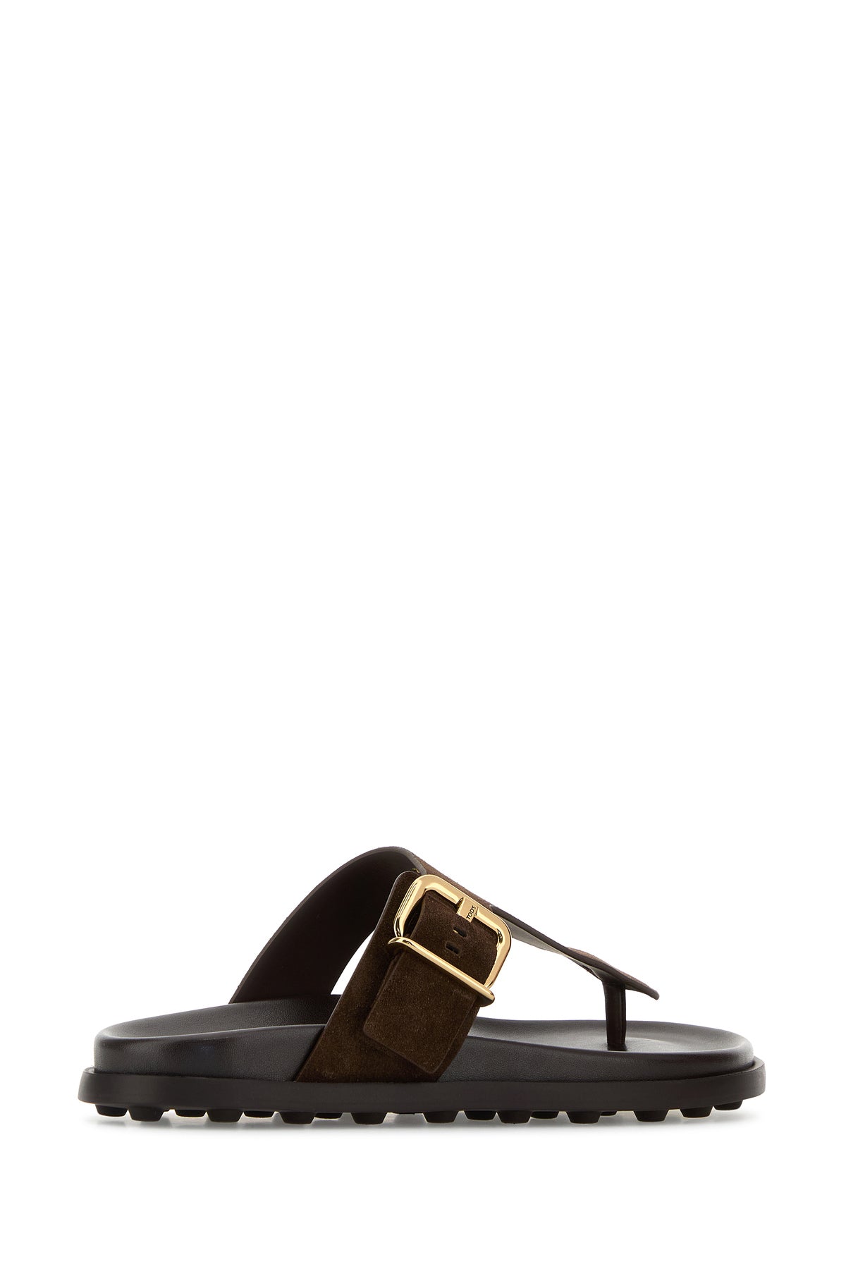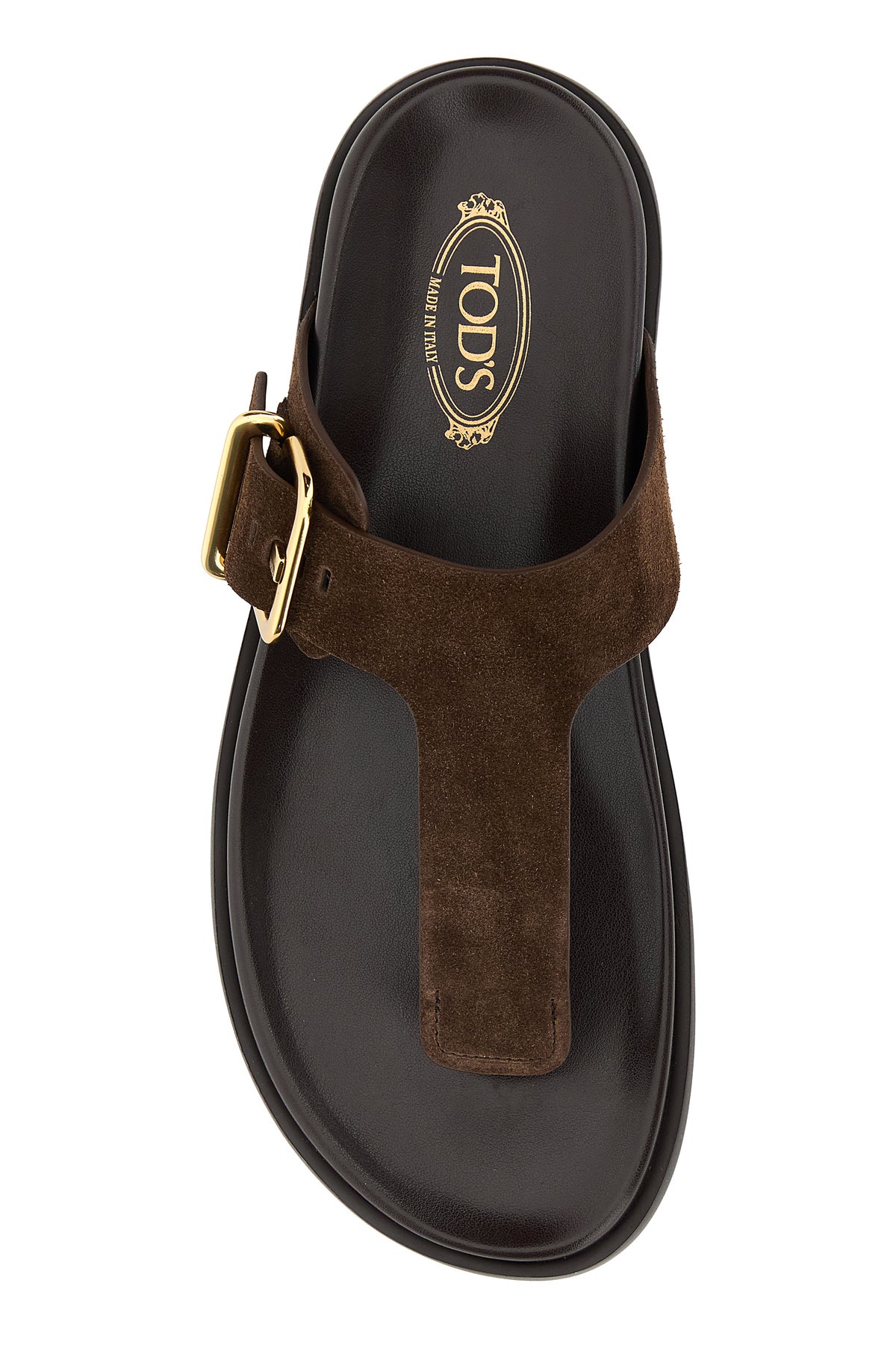 Thong slippers realized in suede characterized by adjustable buckle on the instep.