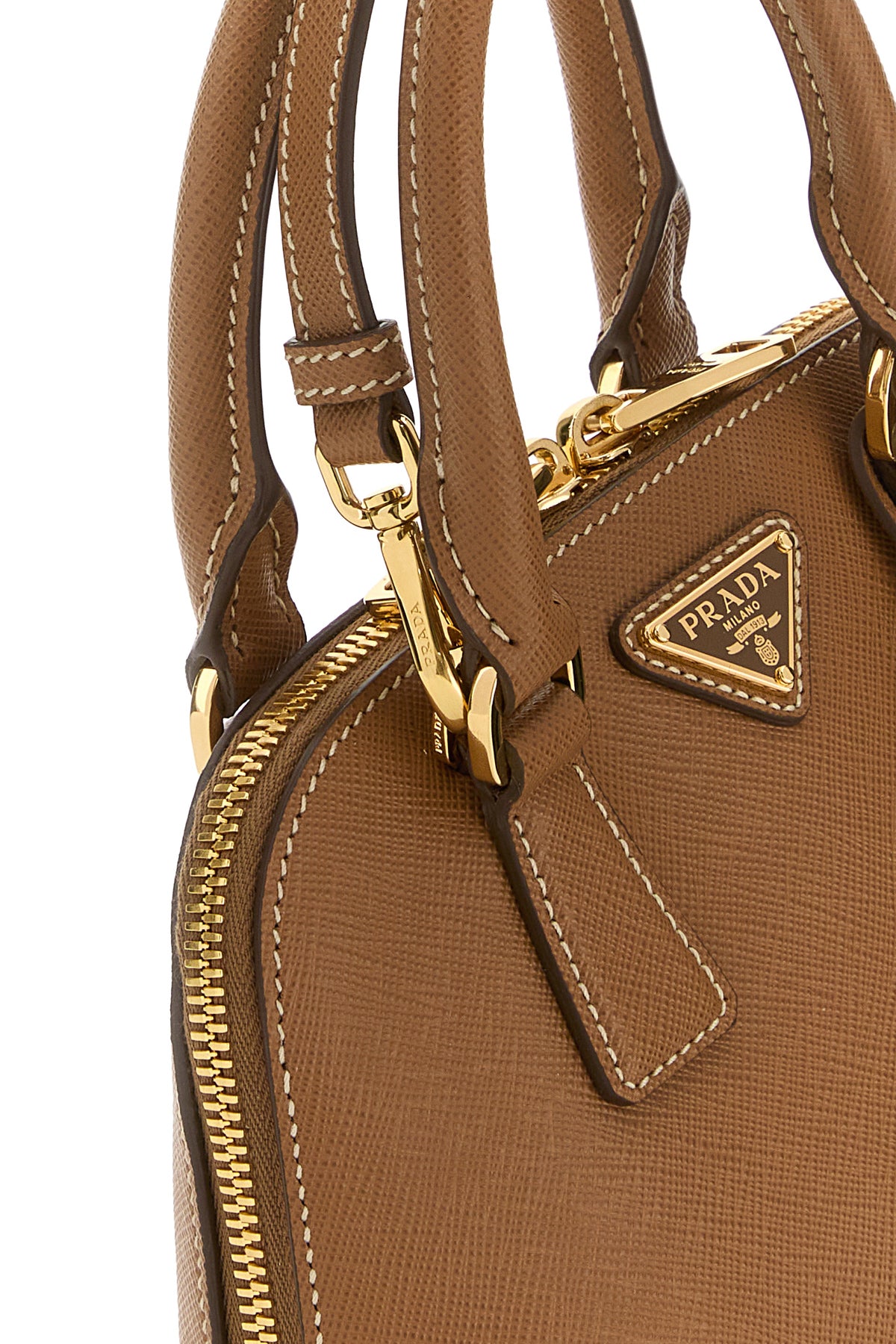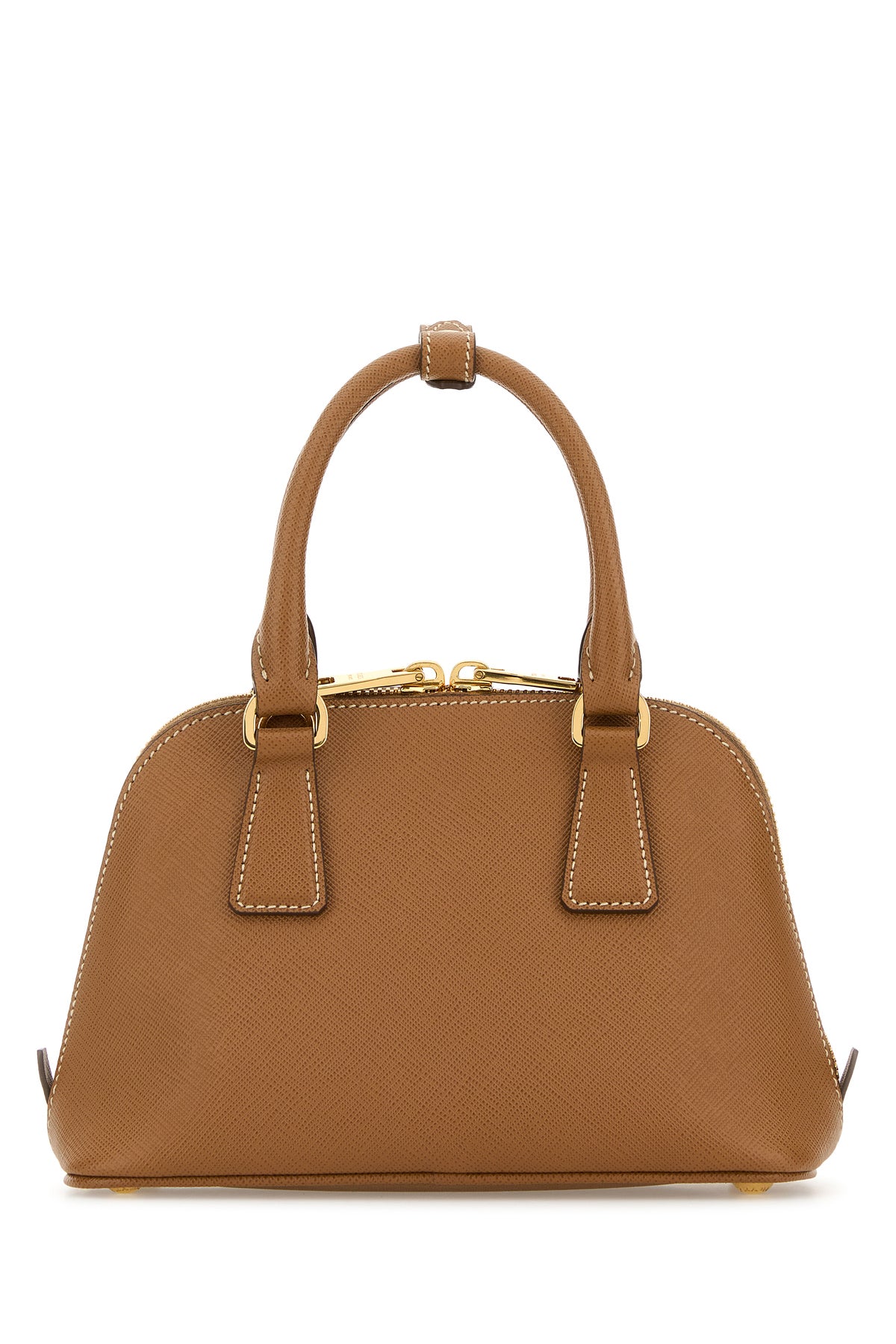 Handbag realized in Saffiano leather enriched by iconic logoed metal triangle at the front.