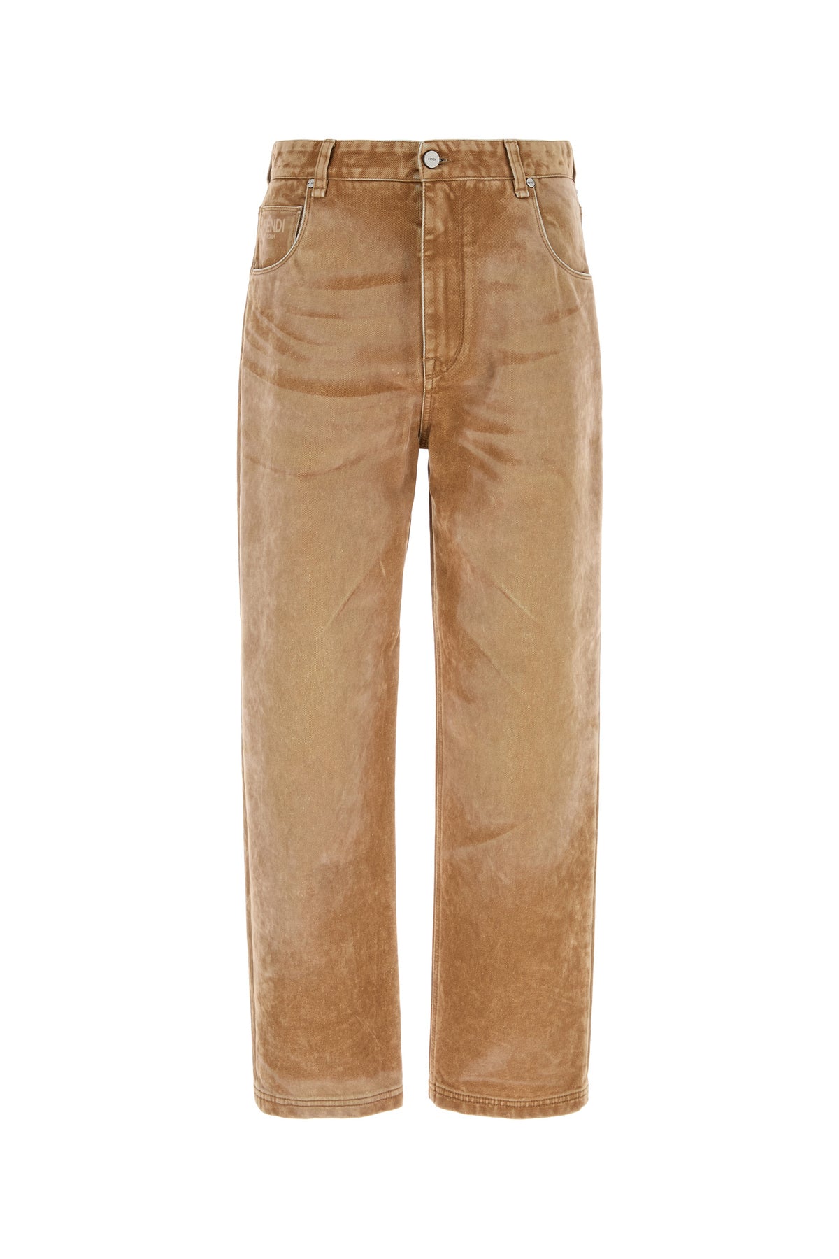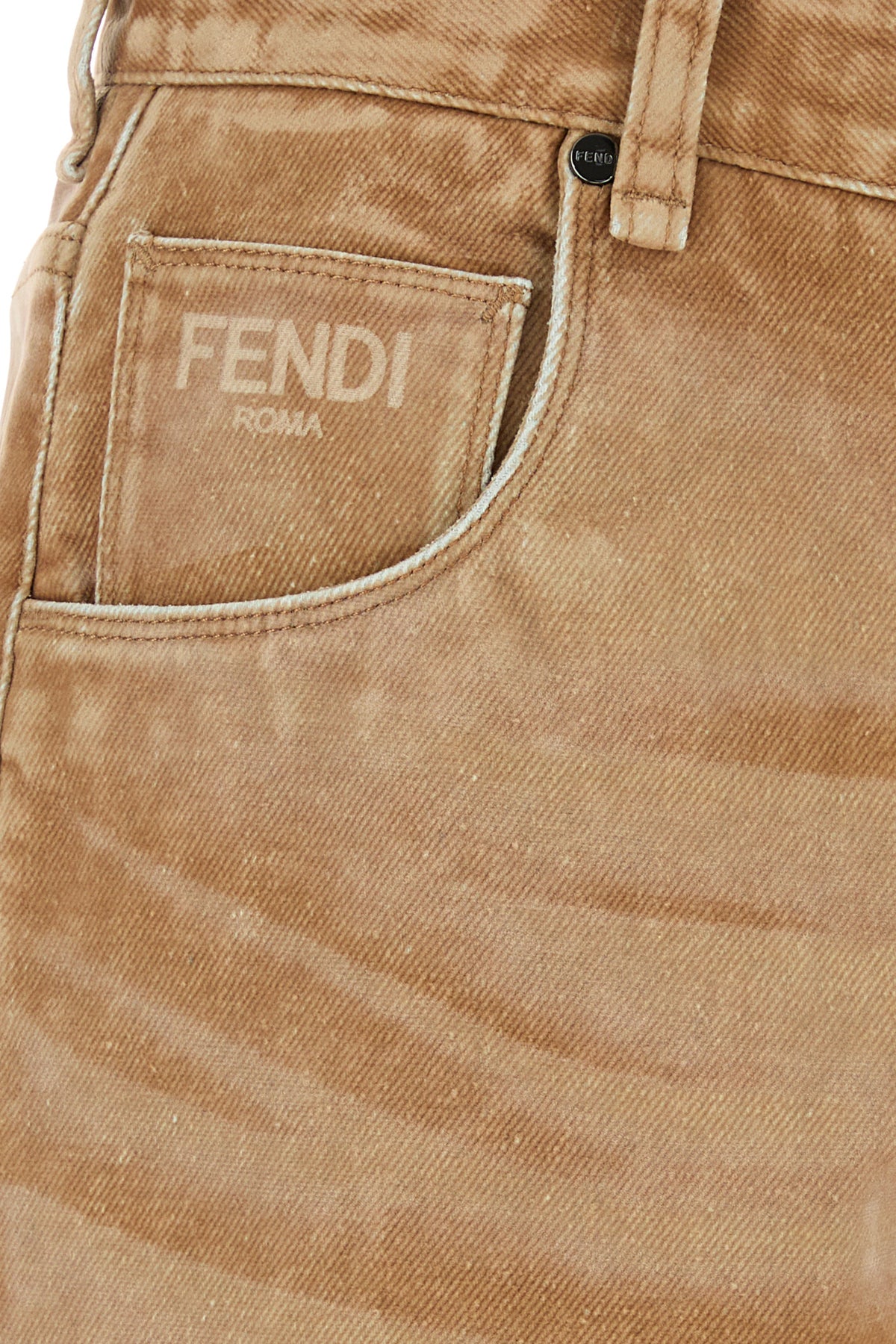 Jeans realized in stonewashed pure cotton velvet characterized by Fendi Roma print at the front.