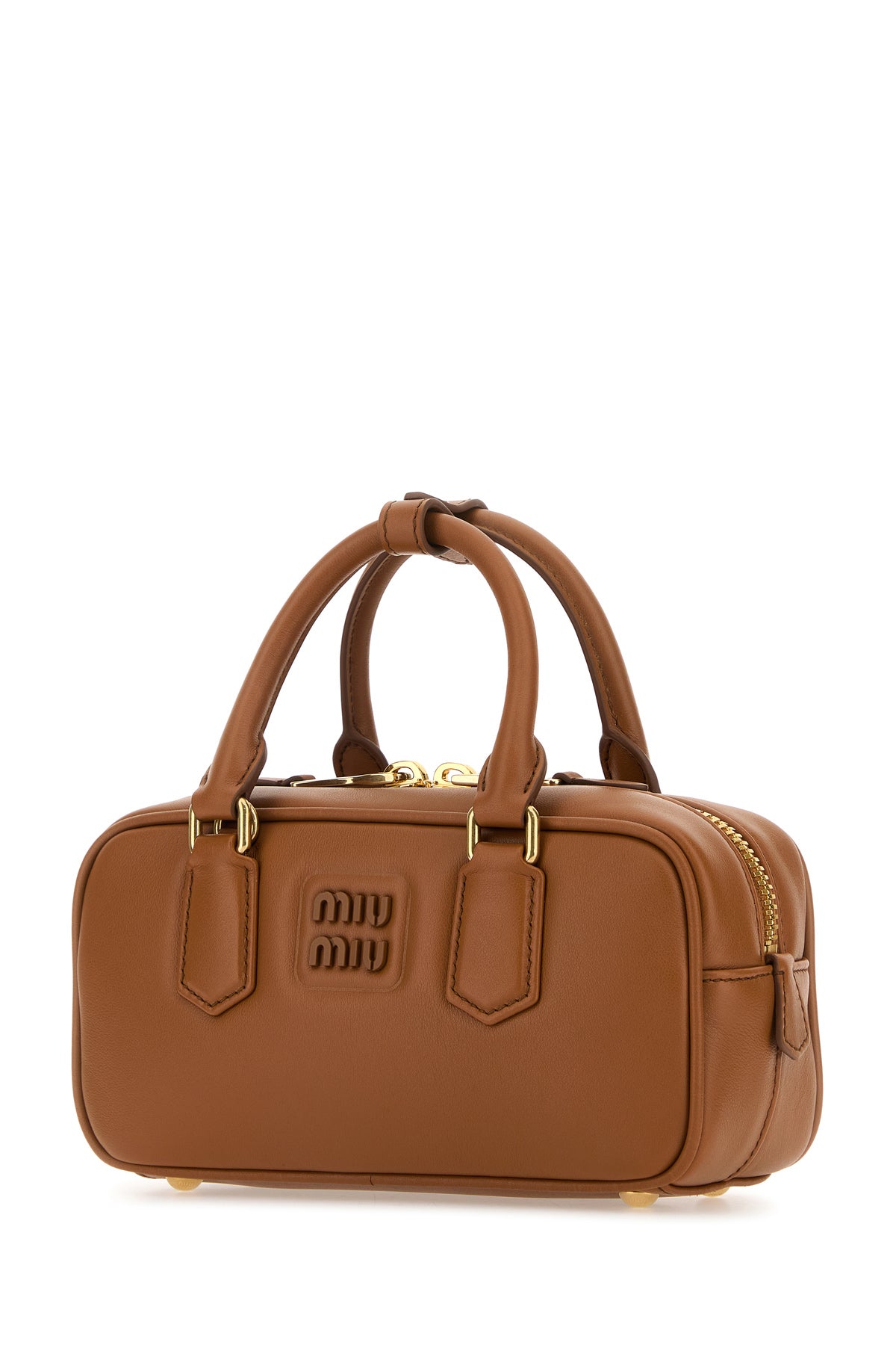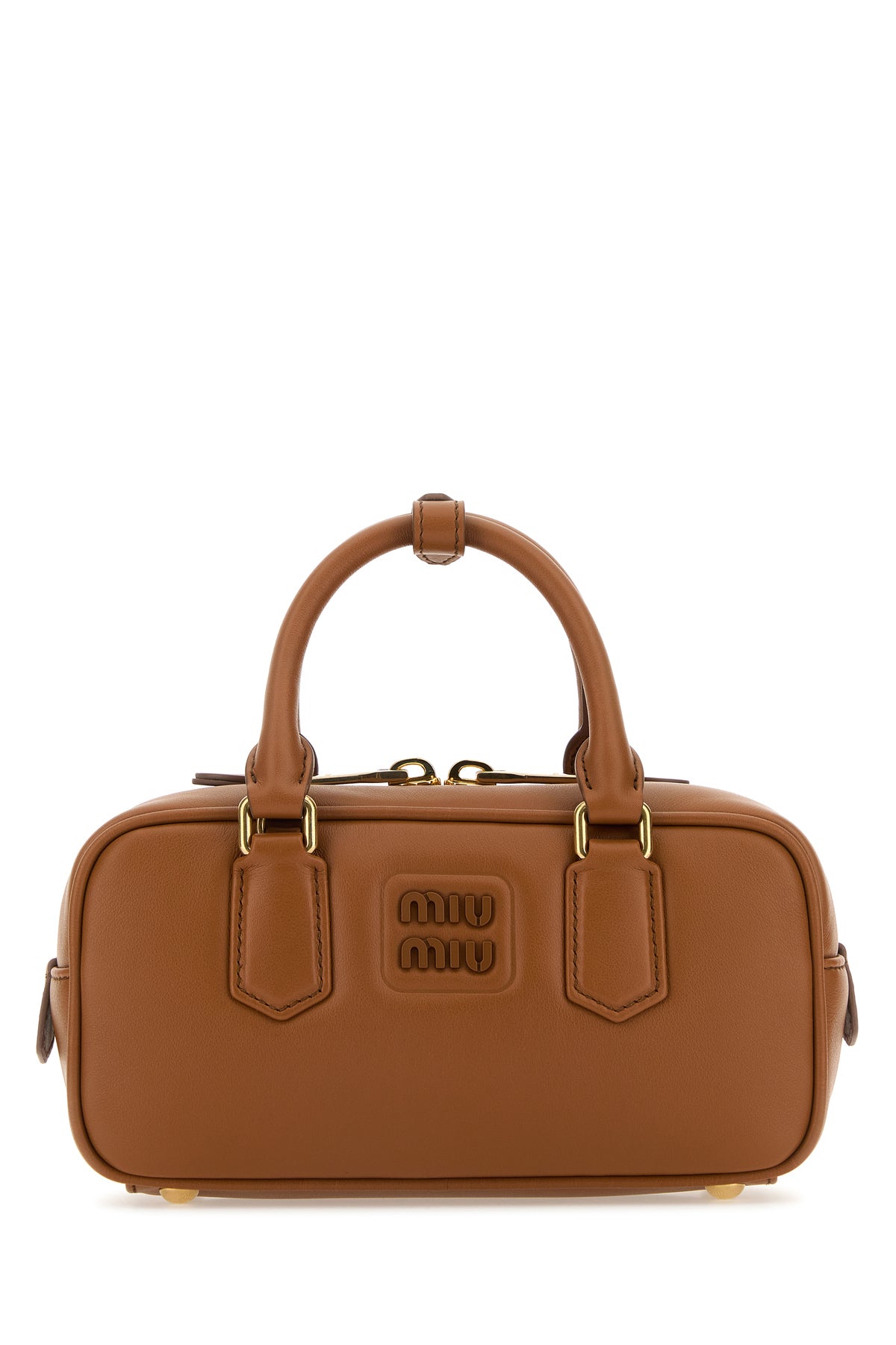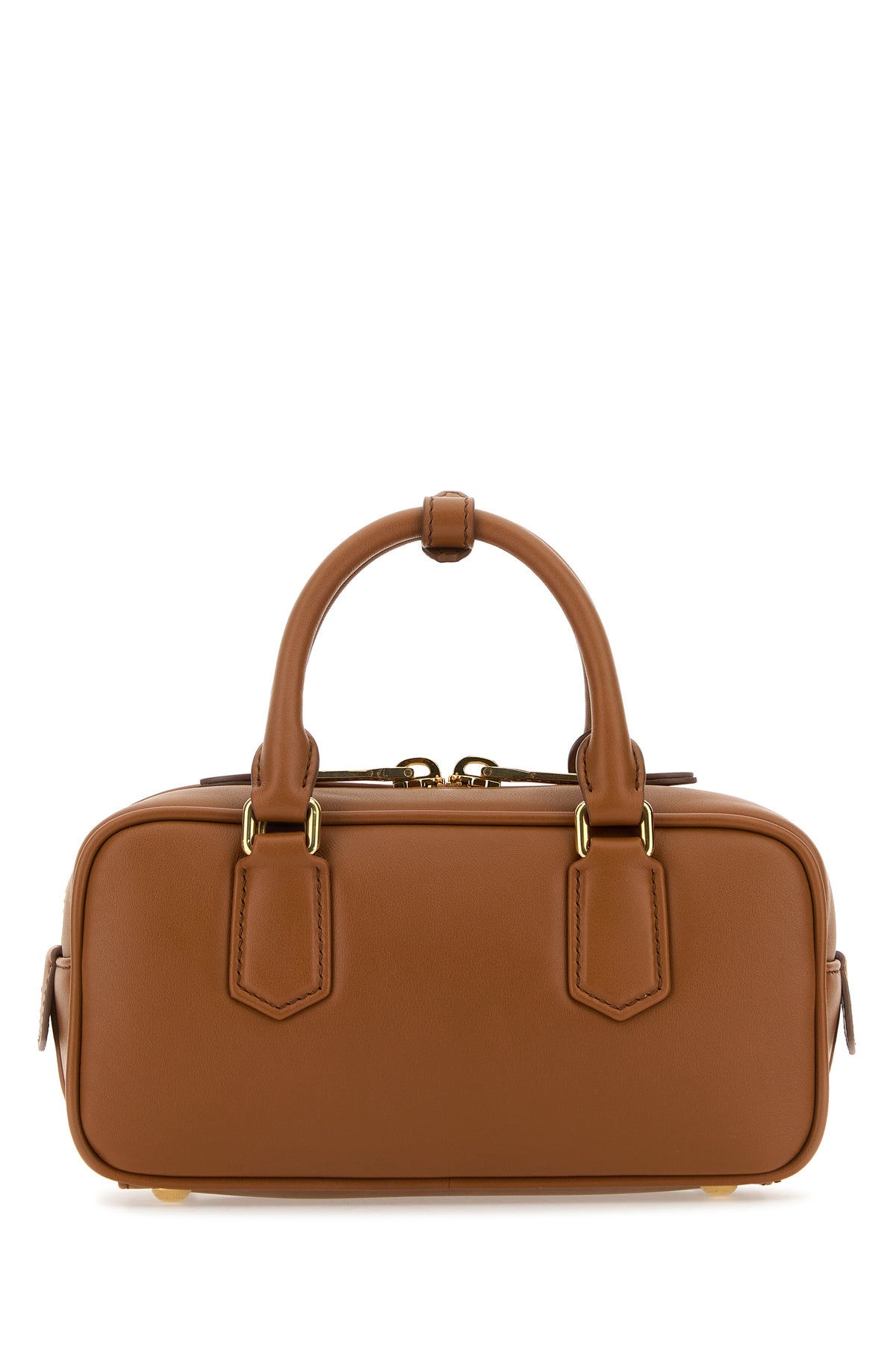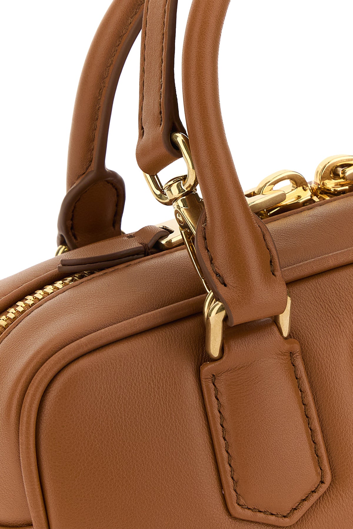 Handbag realized smooth leather enriched by tonal metal lettering logo at the front.