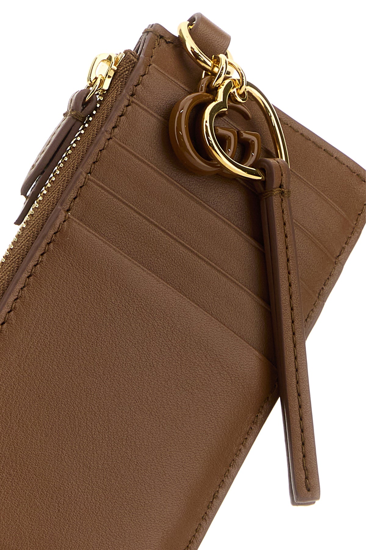 Card holder realized in smooth leather characterized by embossed Gucci motif at the front enriched by metal GG charm on the side.