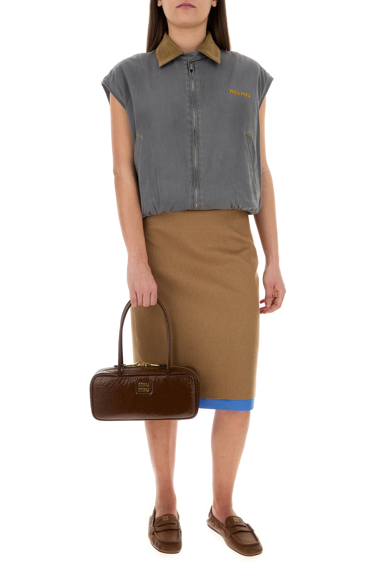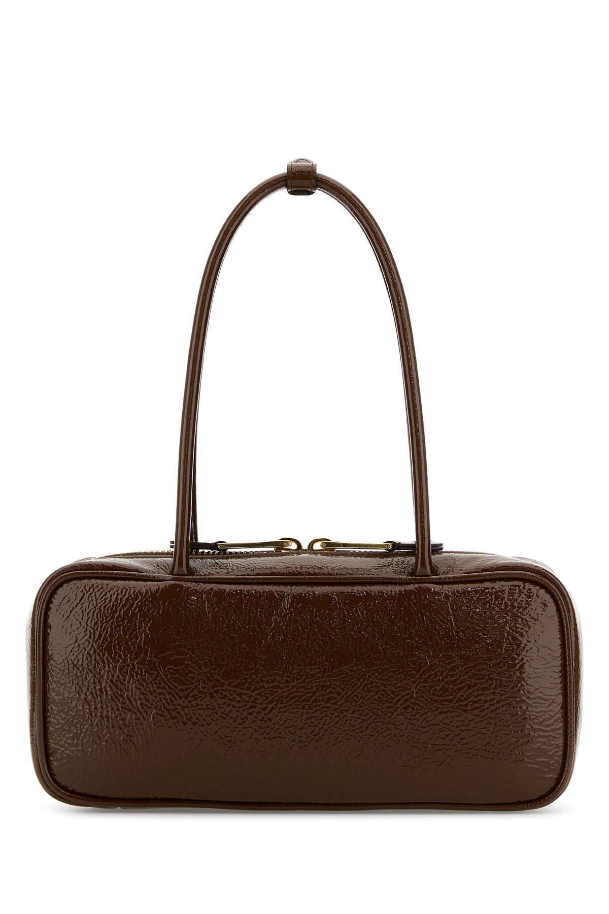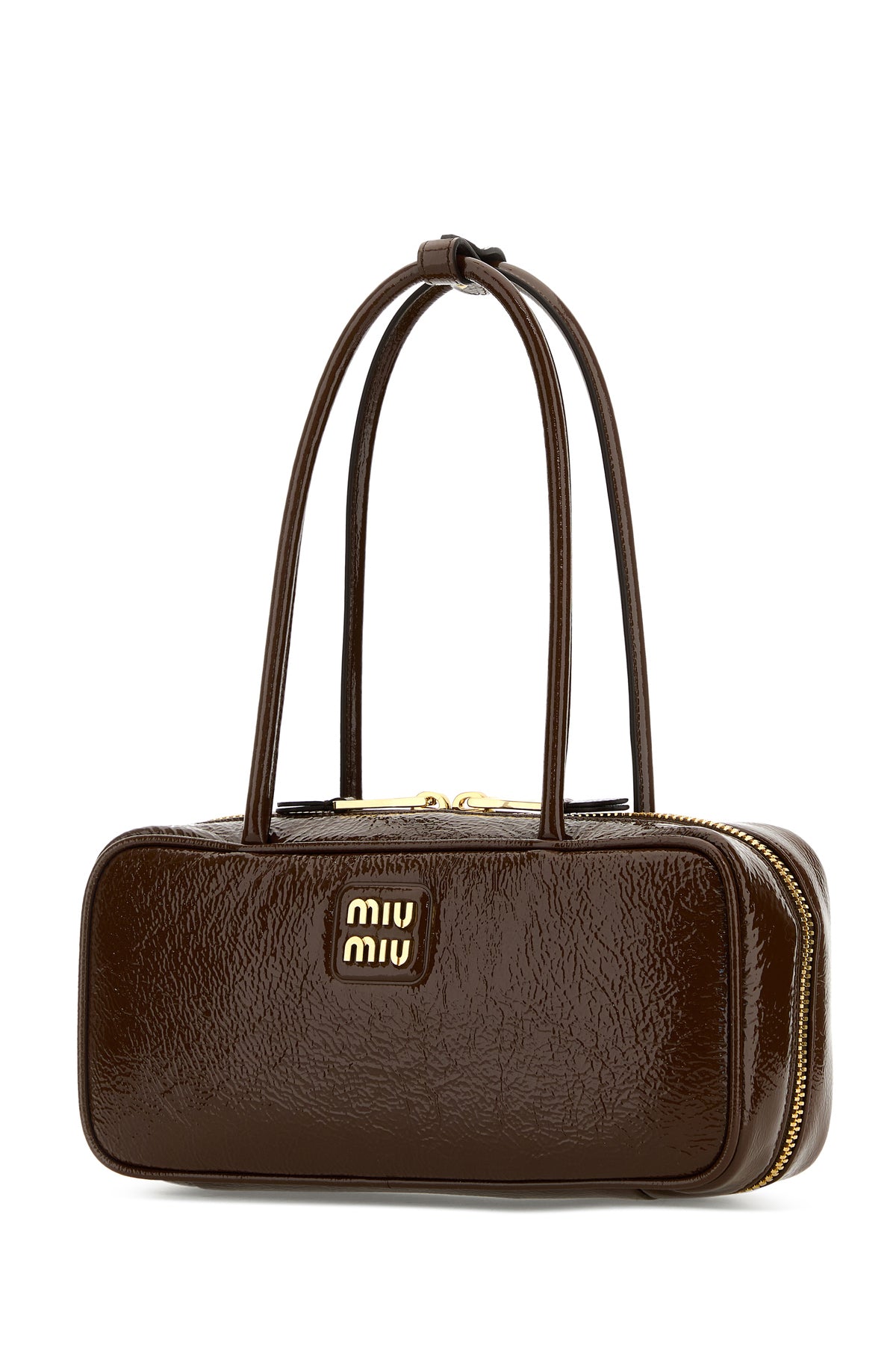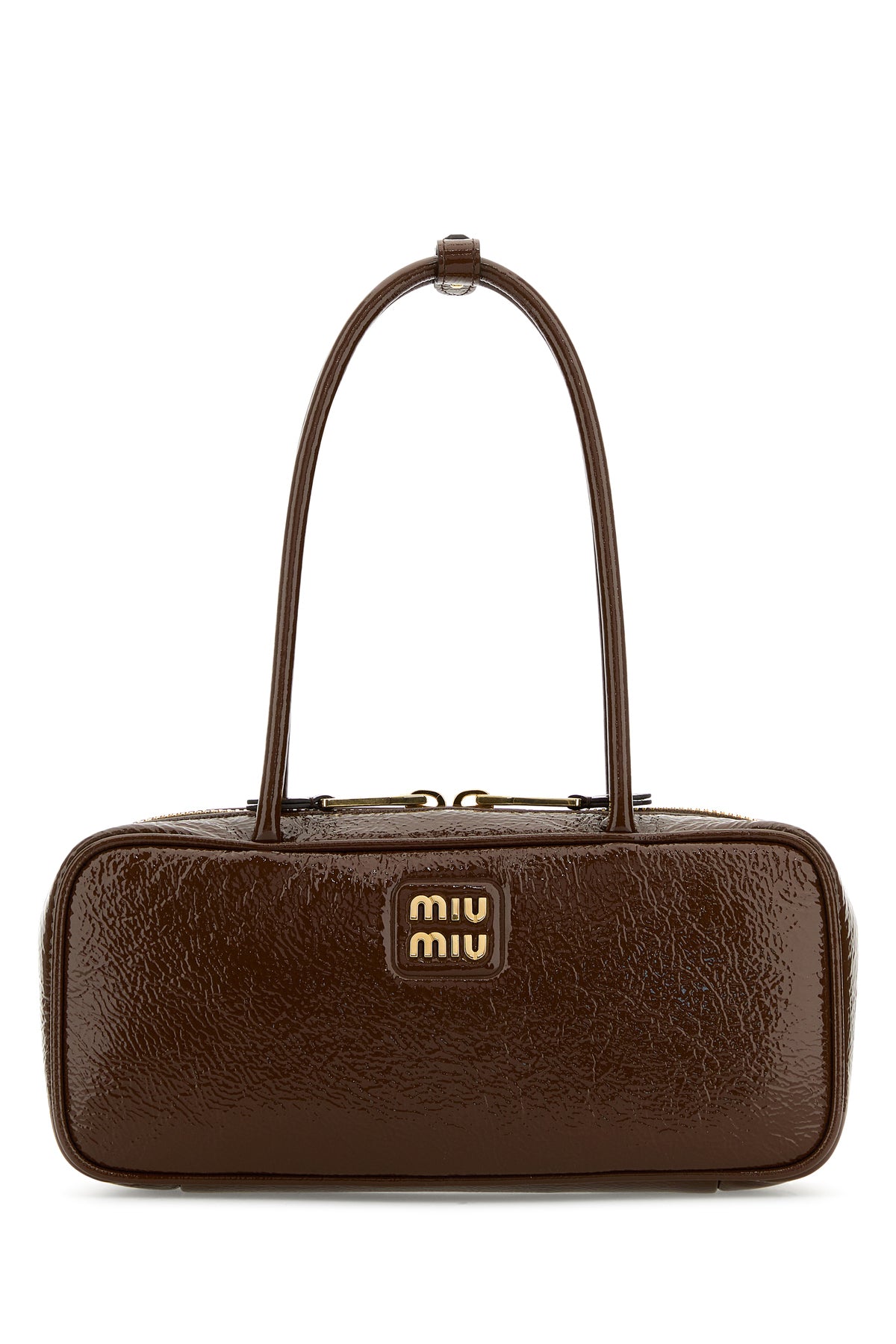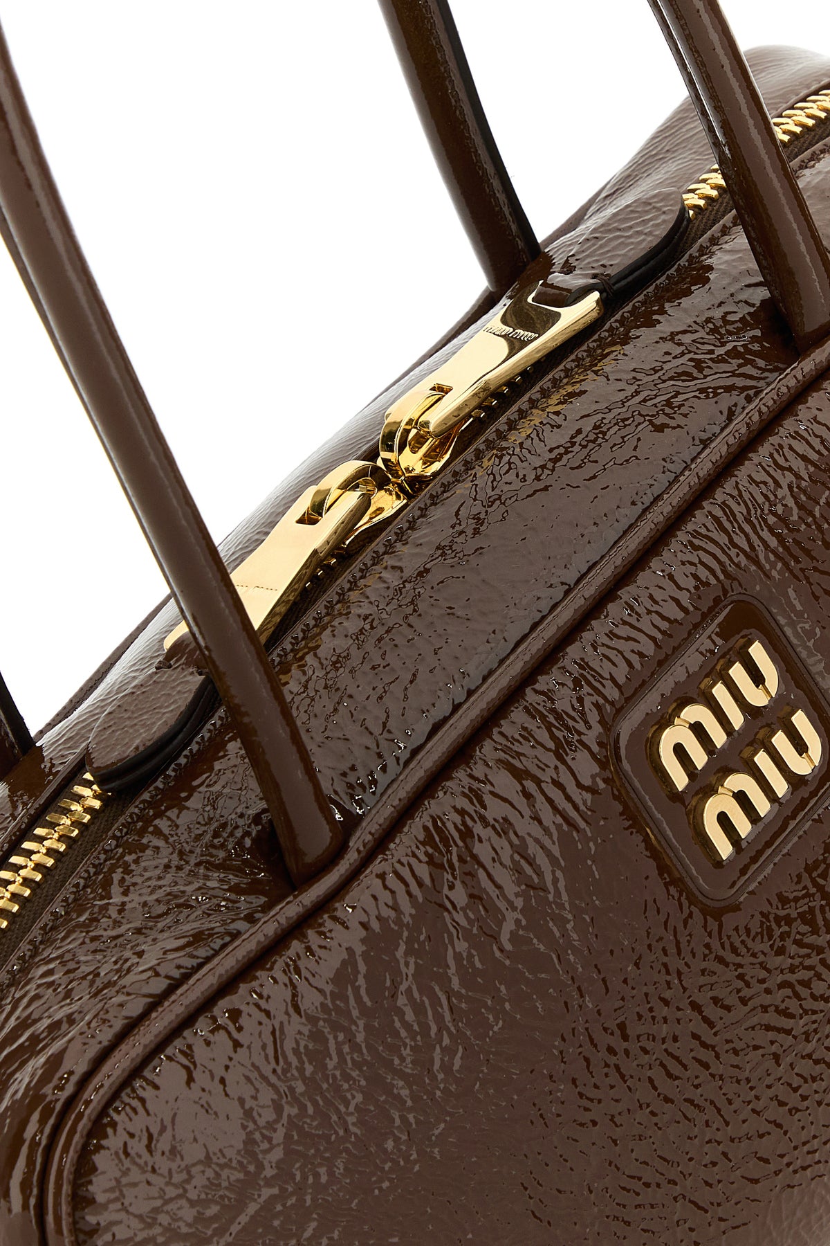 Handbag realized in patent creased-effect leather enriched by metal lettering logo at the front.