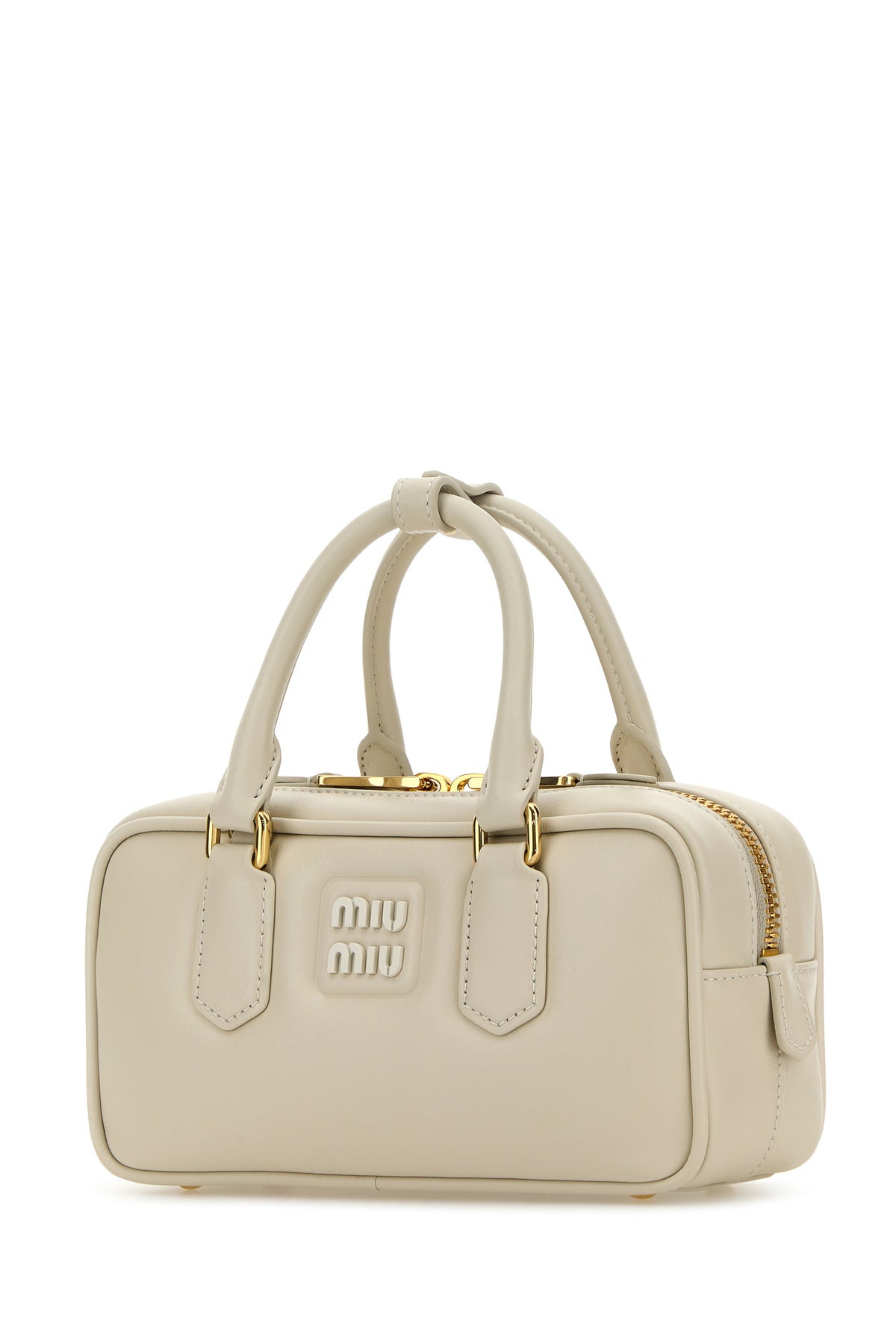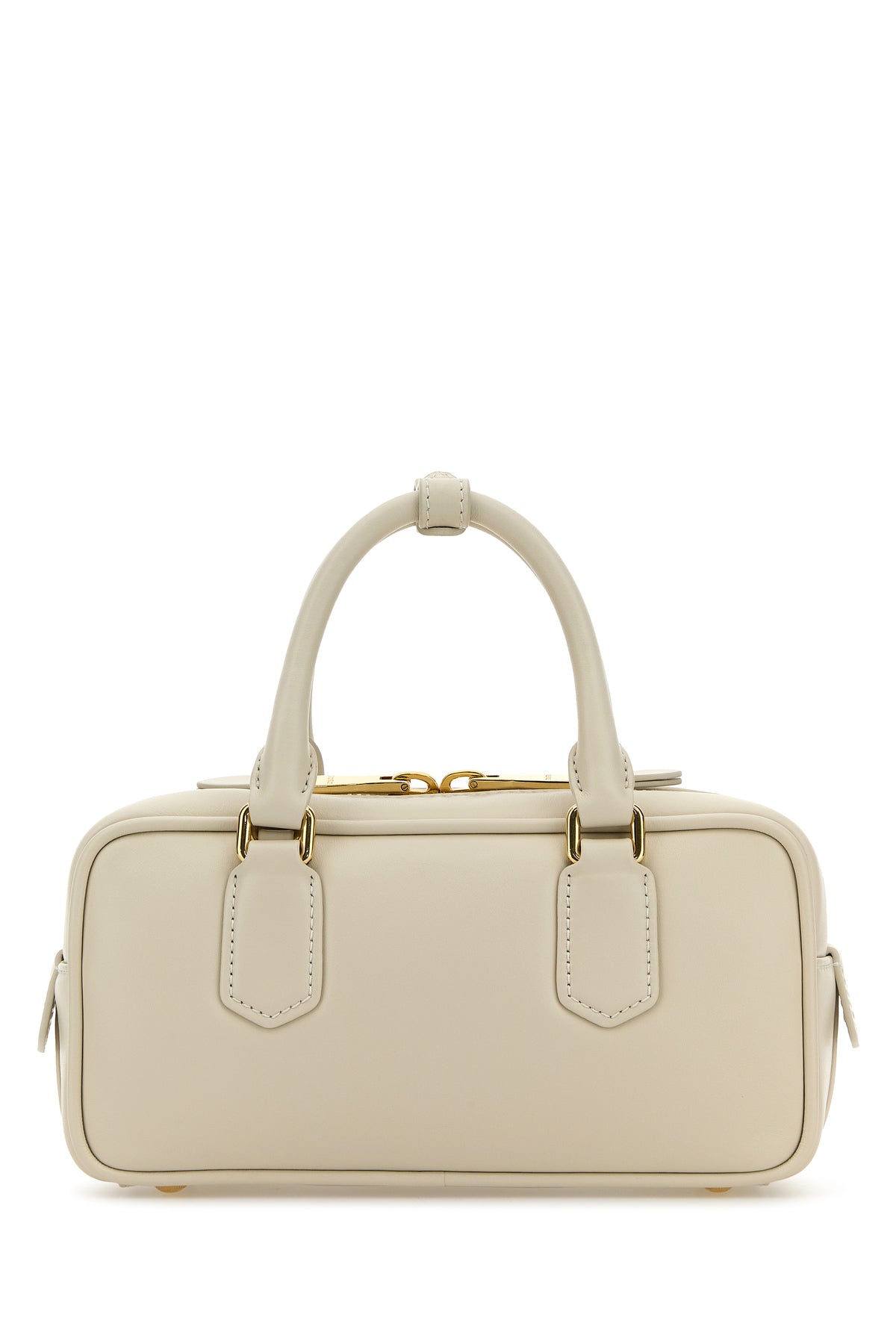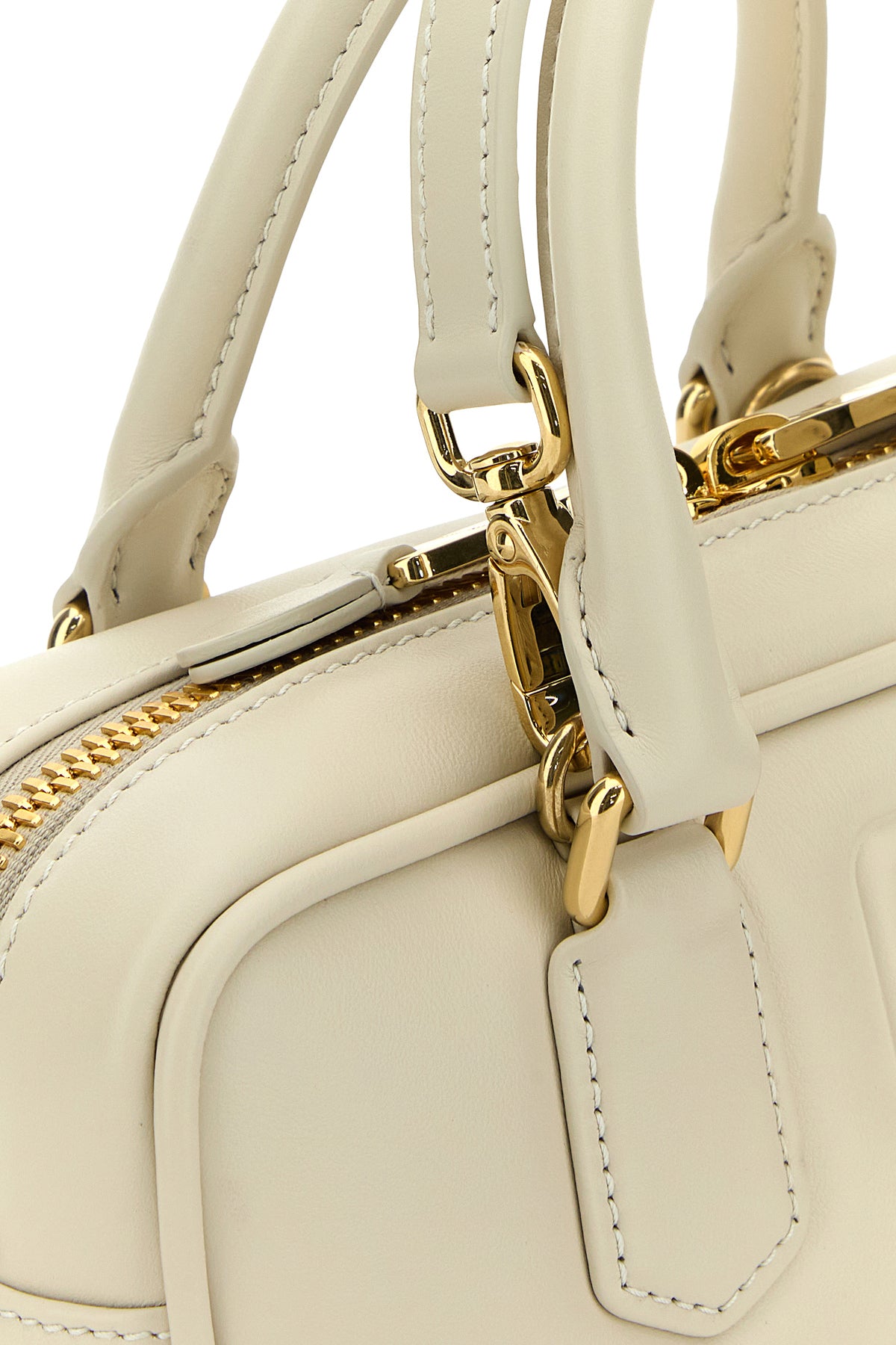 Handbag realized smooth leather enriched by tonal metal lettering logo at the front.