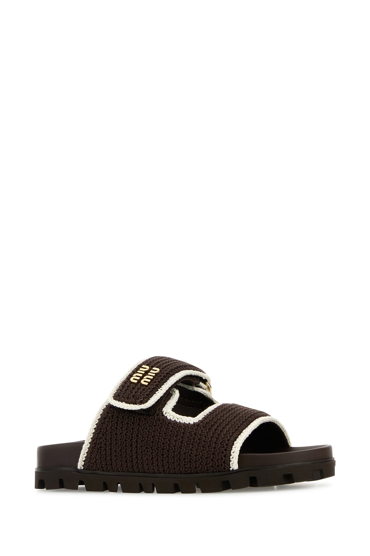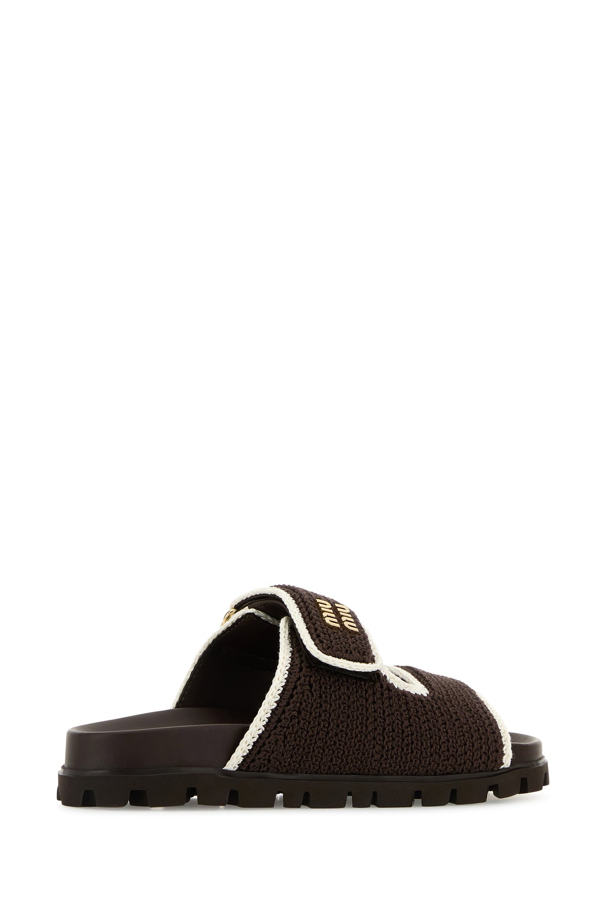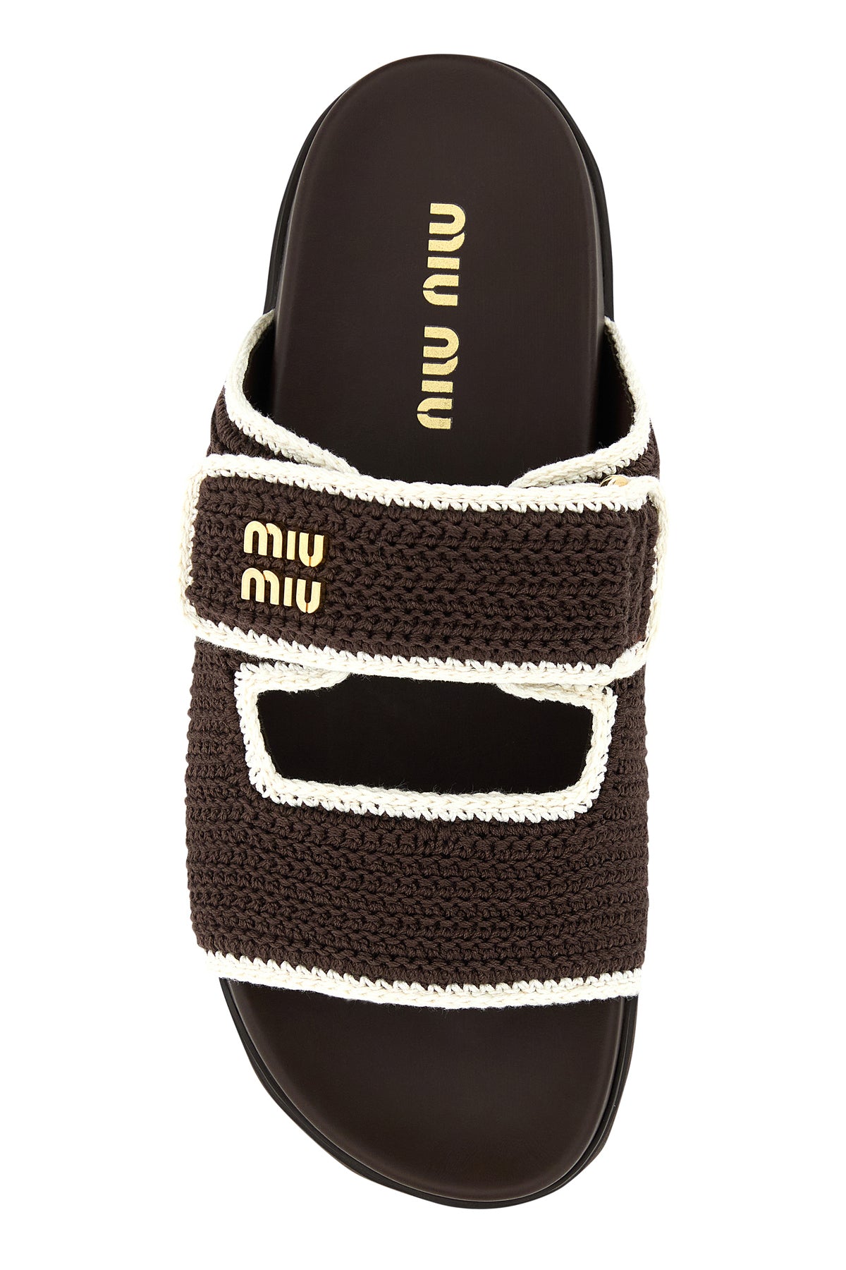 Slippers realized in woven crochet with contrasting trimmings enriched by metal lettering logo on the instep.