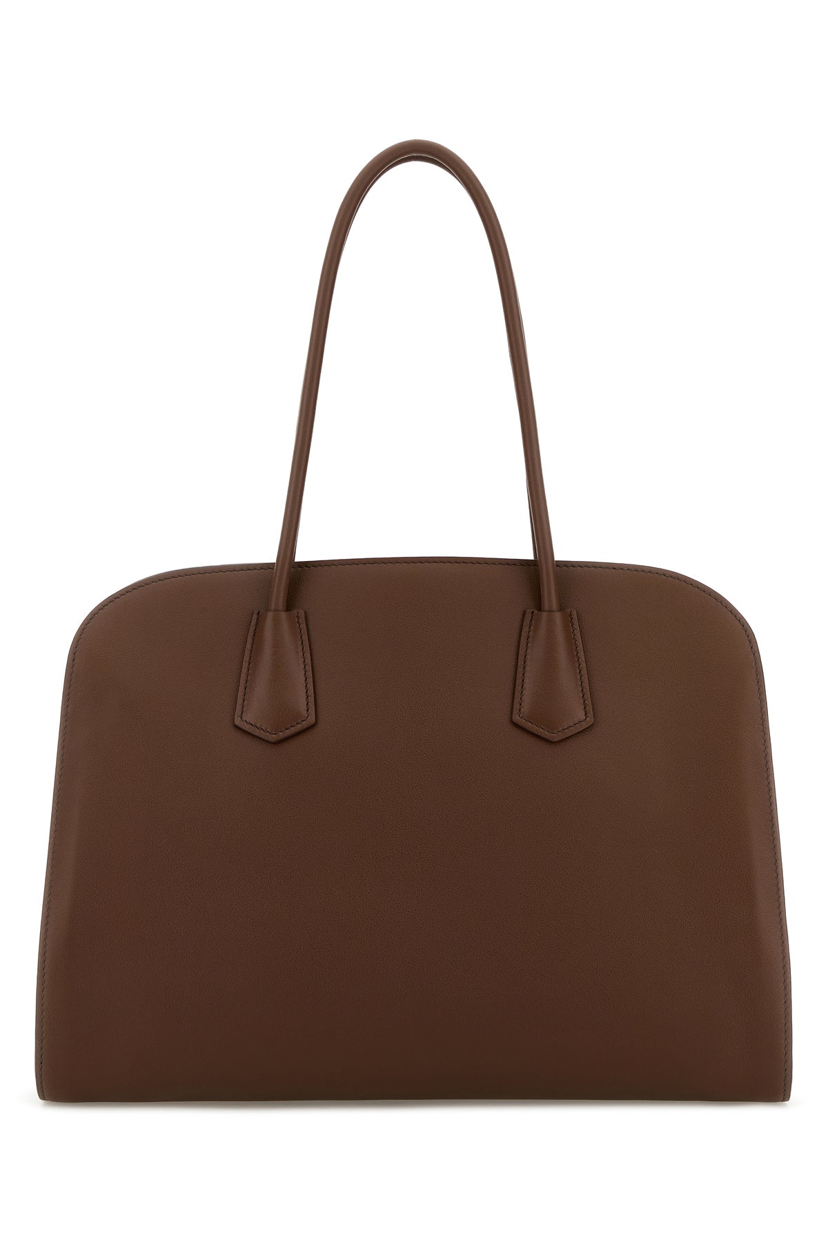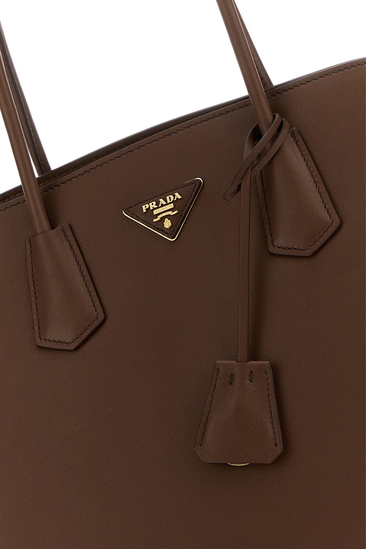 Shopping bag realized in pebble leather enriched by iconic logoed metal triangle at the front.