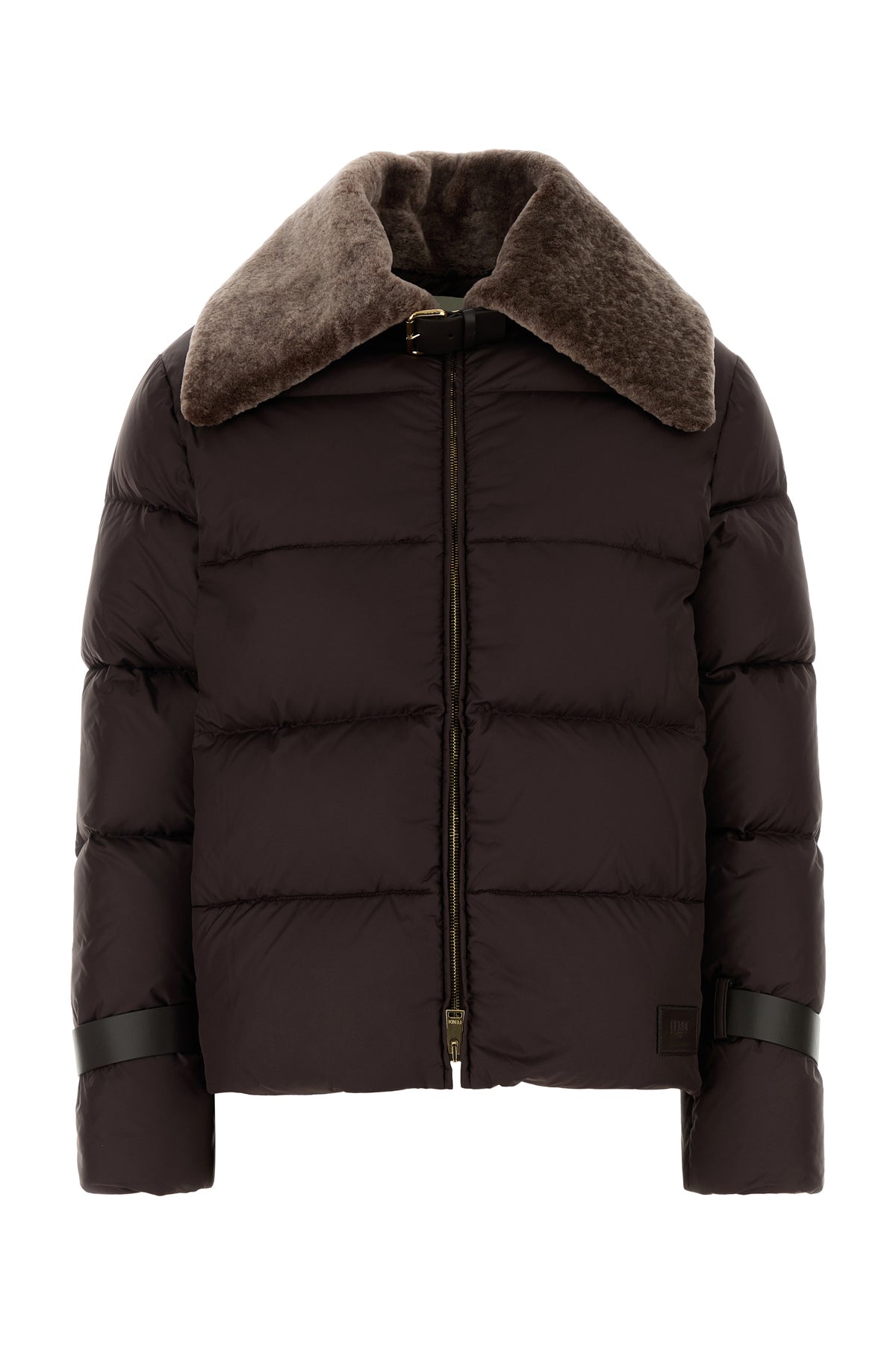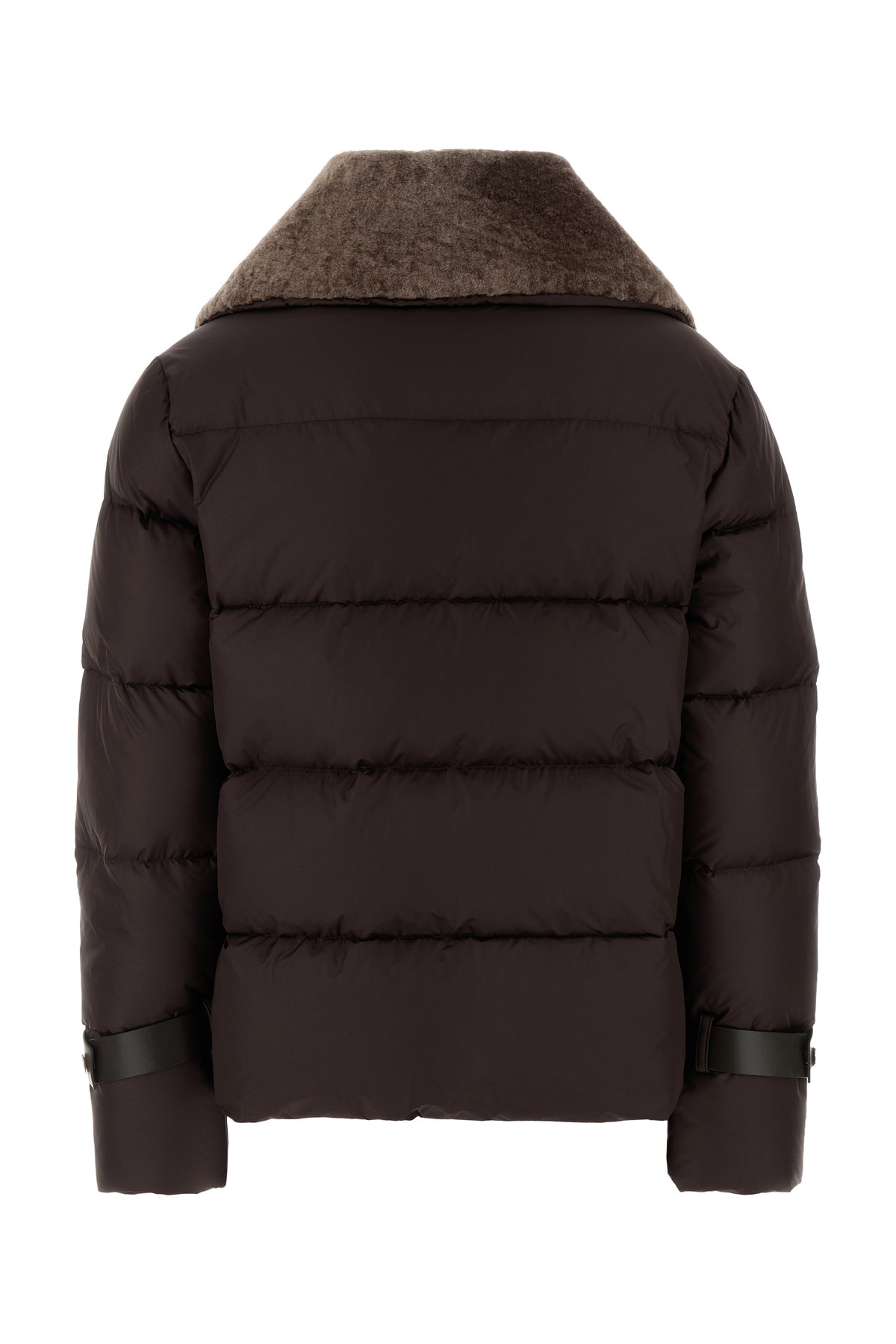 Down jacket realized in quilted polyester enriched by logoed label on the hemline.