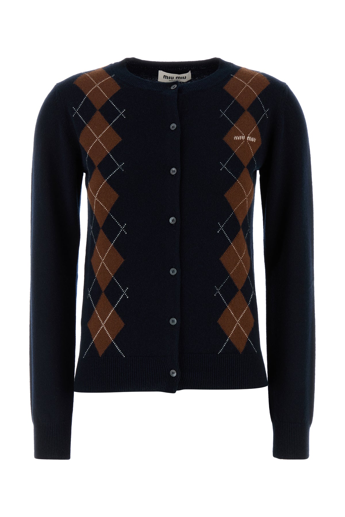 Cardigan realized in pure cashmere characterized by checked embroidery at the front and embroidered logo on the chest.