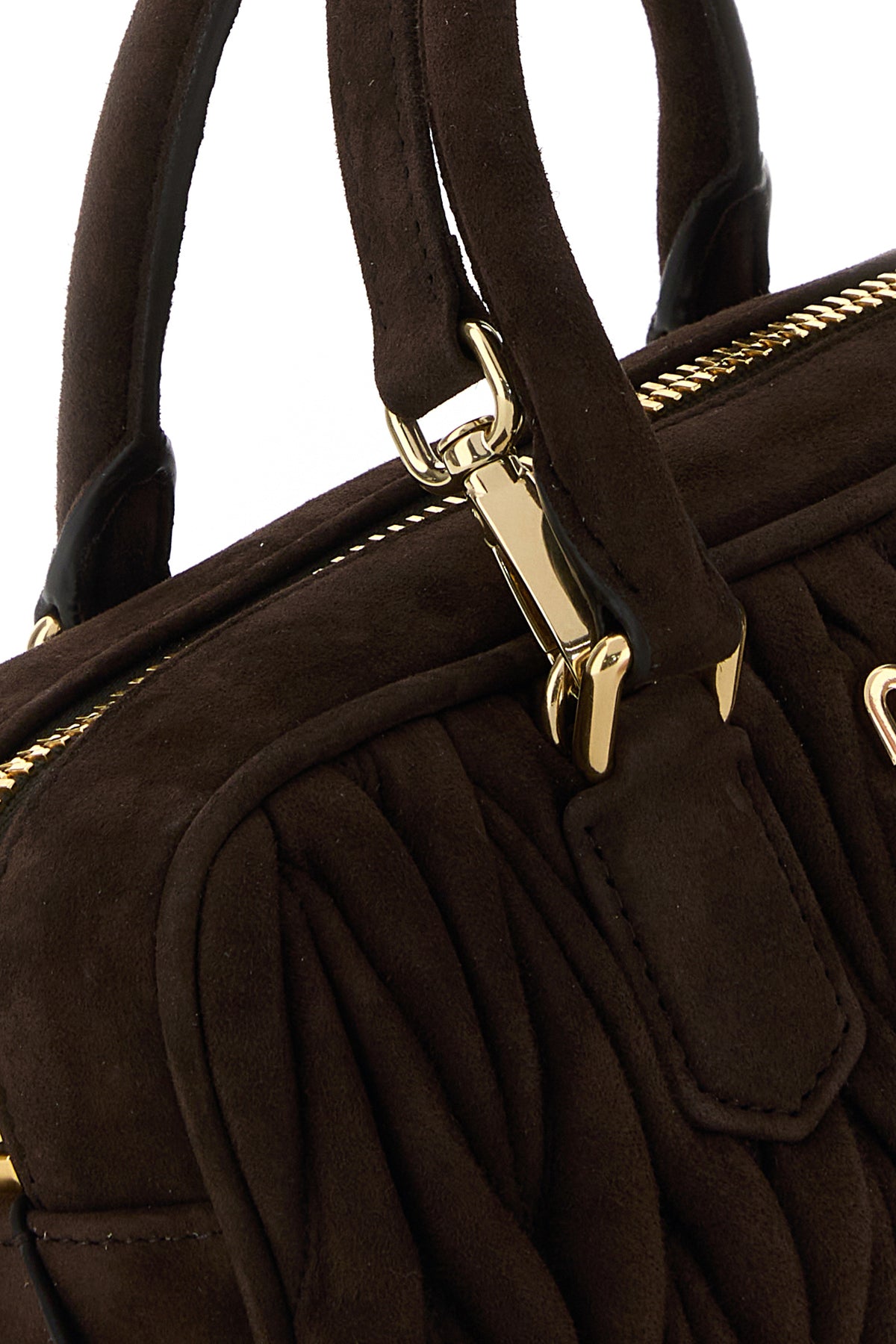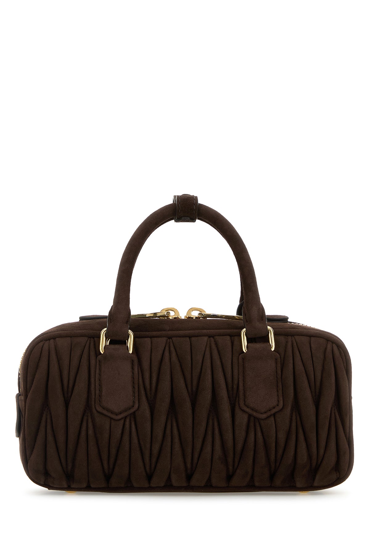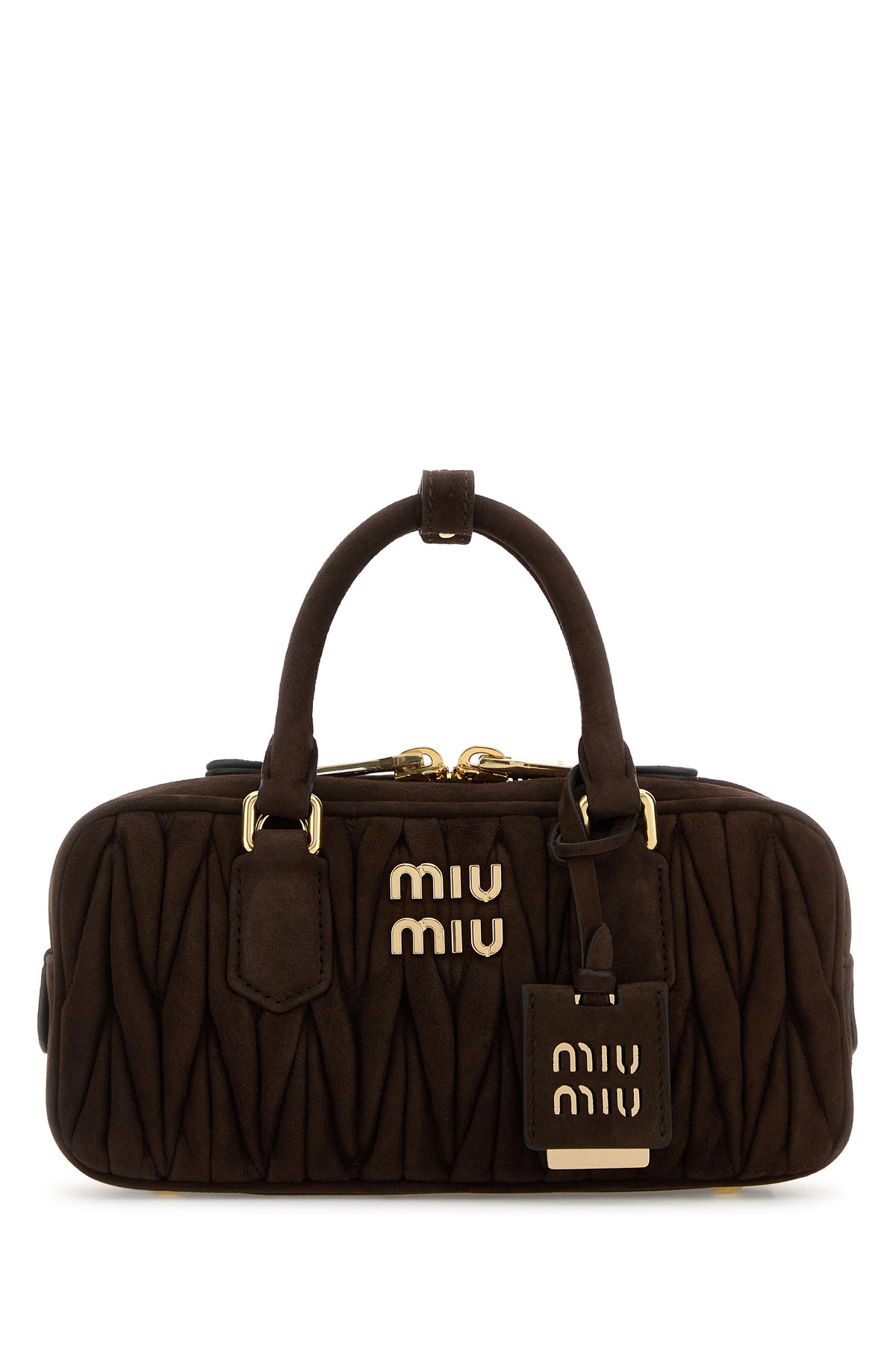 Handbag realized in matelassé suede enriched by tonal metal lettering logo at the front and detachable tonal leather accessory.