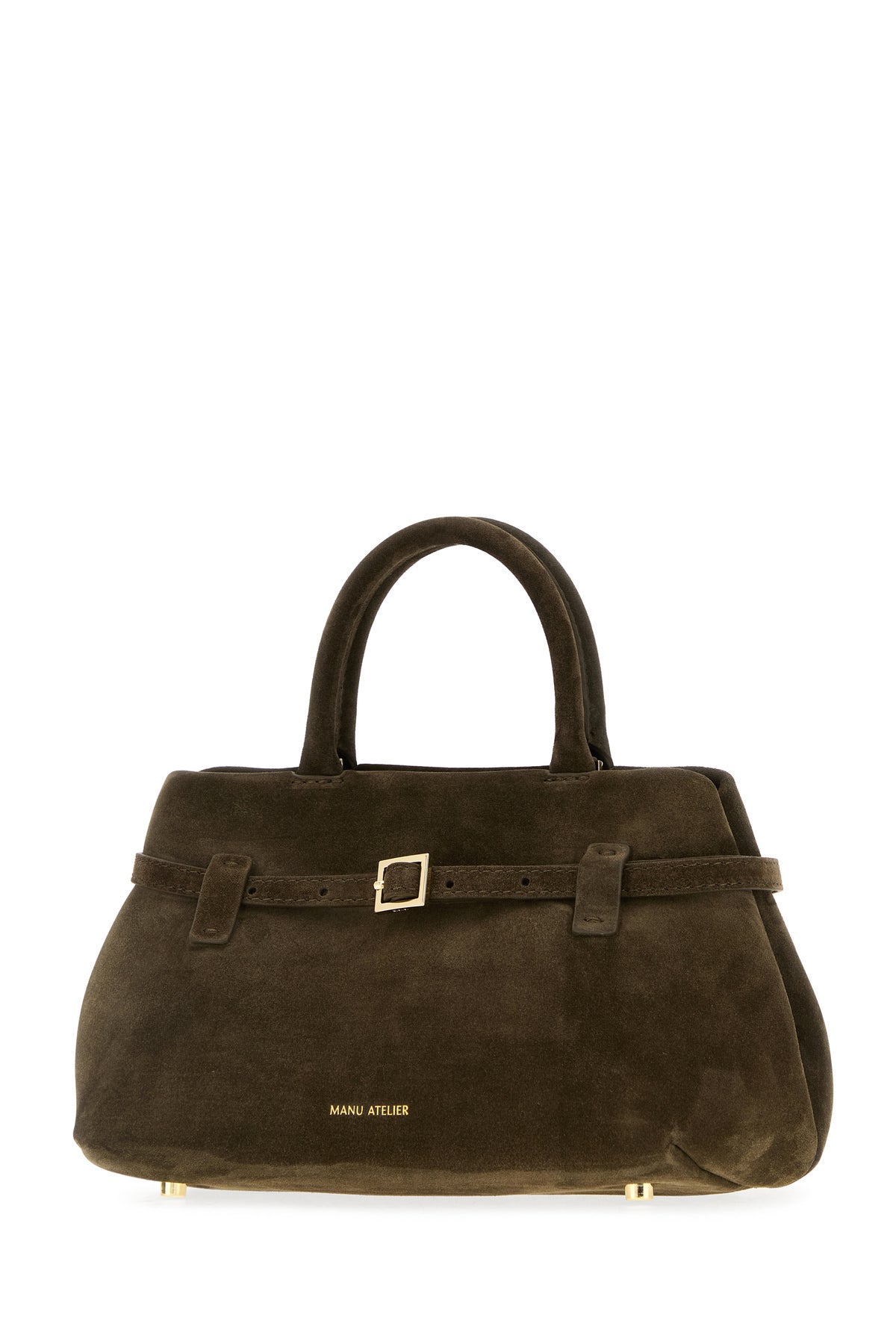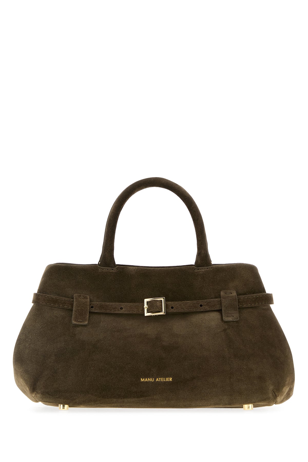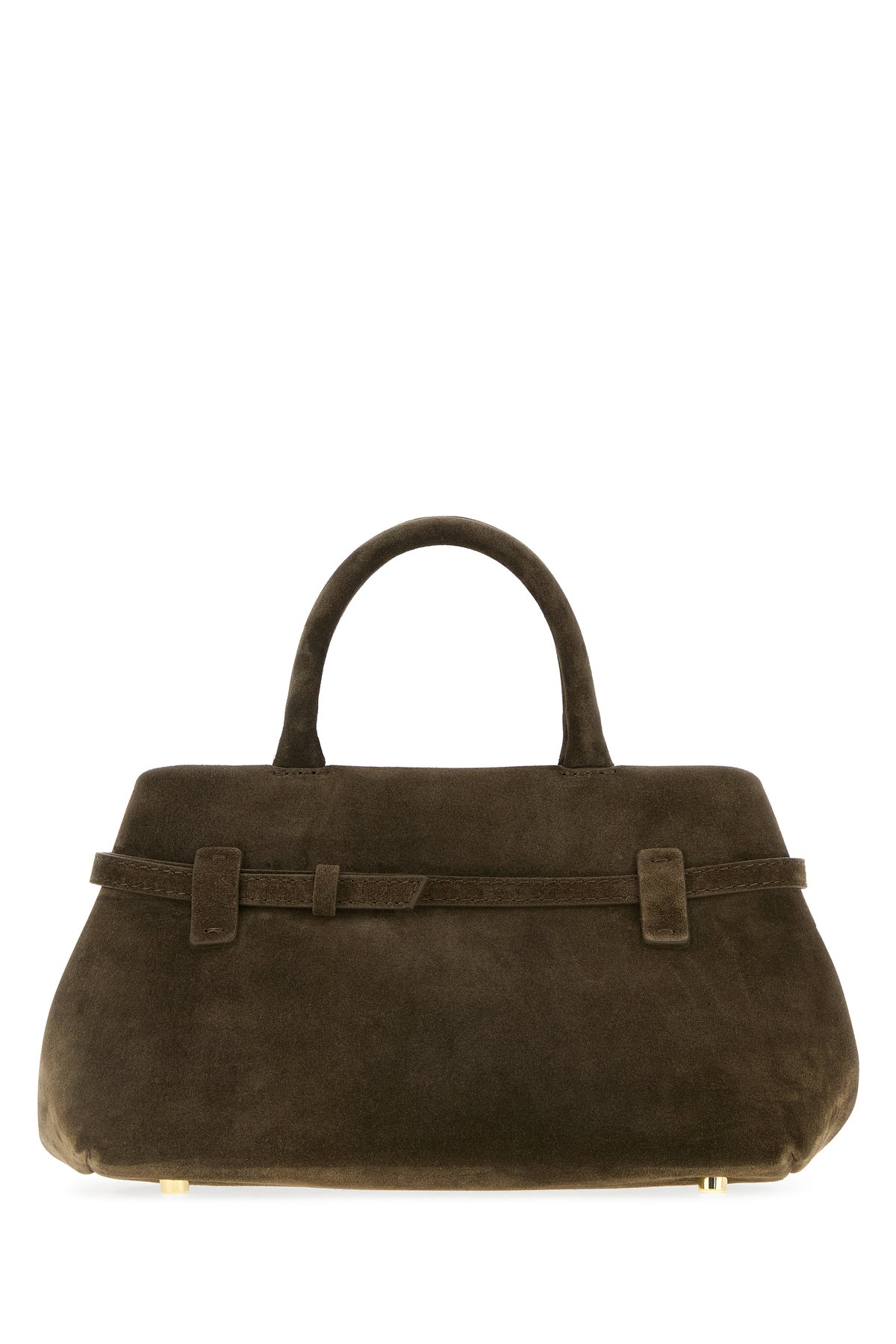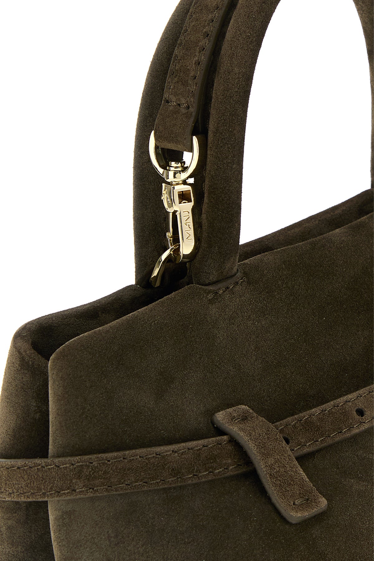 Handbag realized in suede characterized by laminated printed logo at the front.
