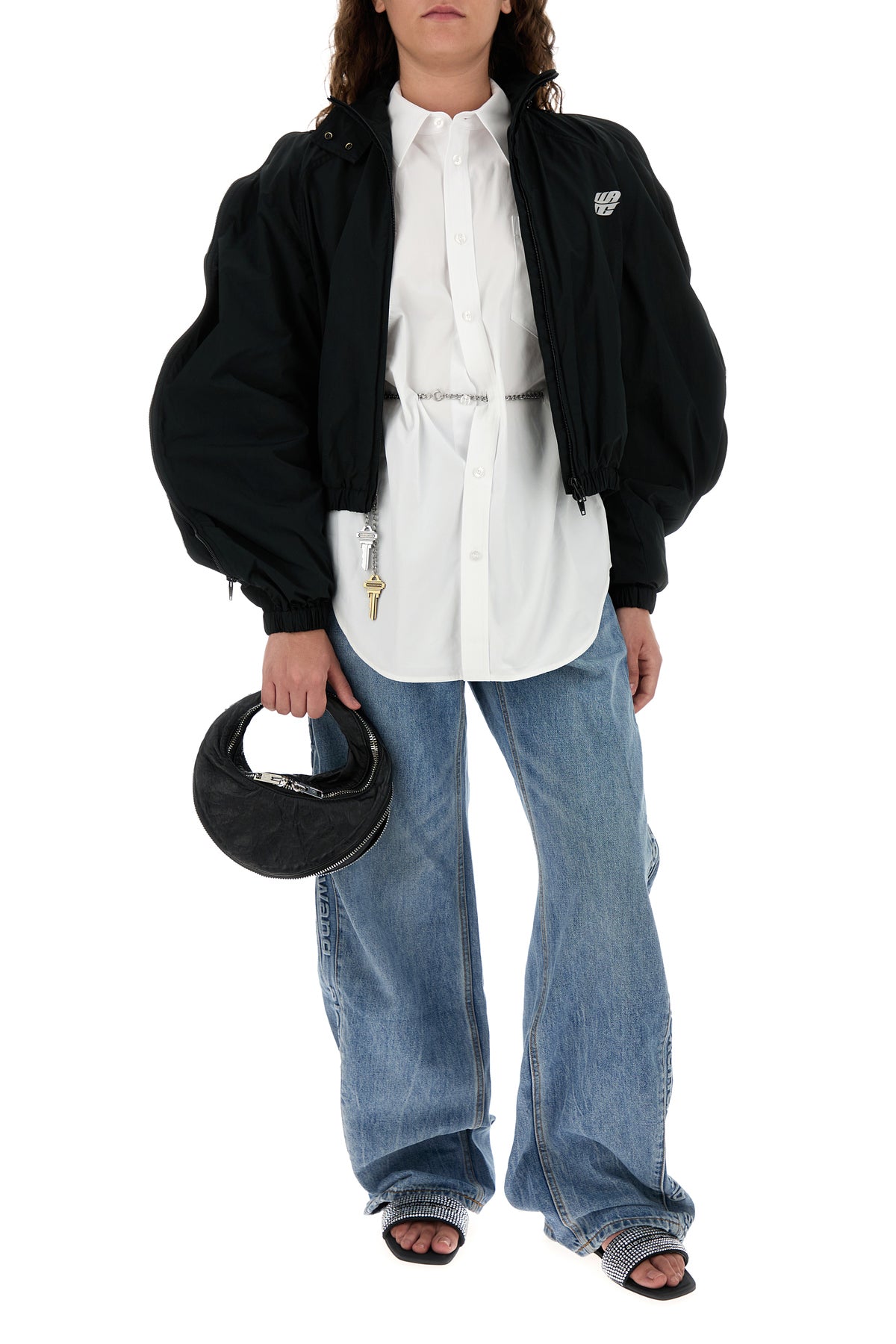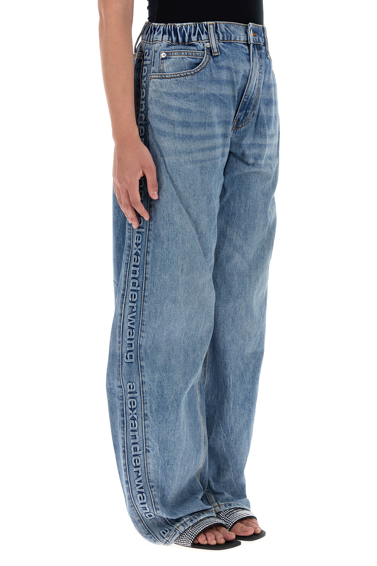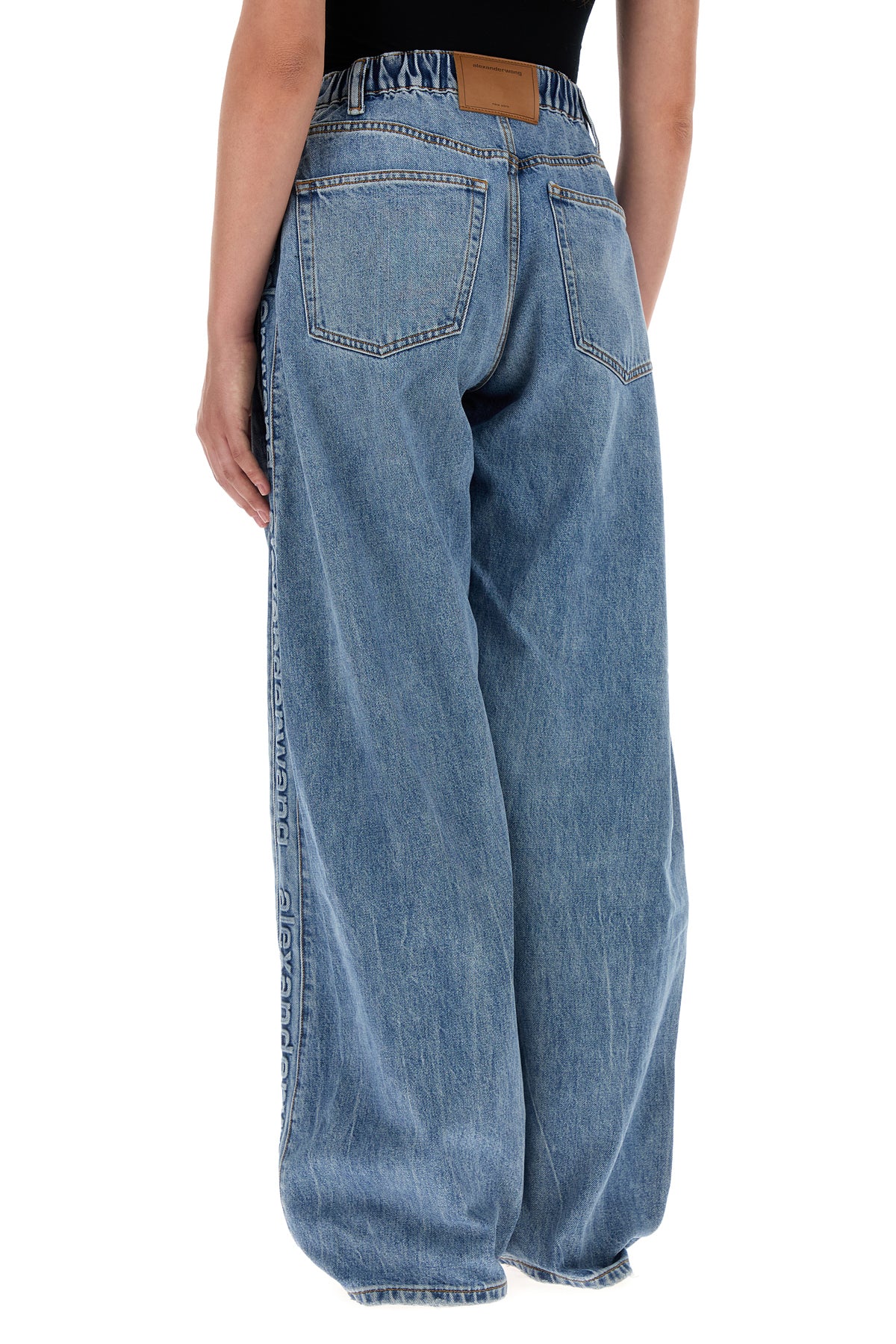 Jeans realized in stonewashed effect denim characterized by logo in relief on the sides.