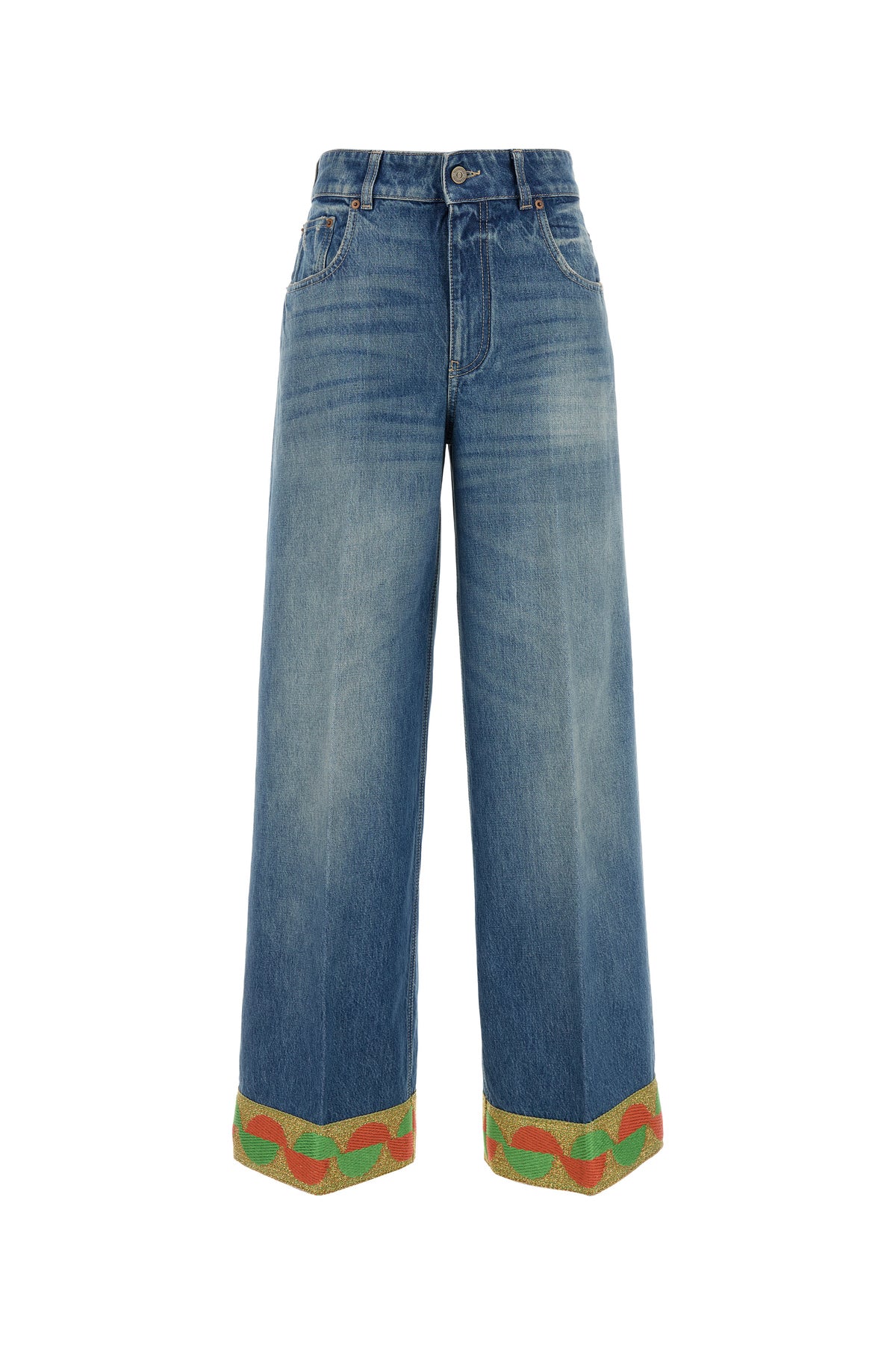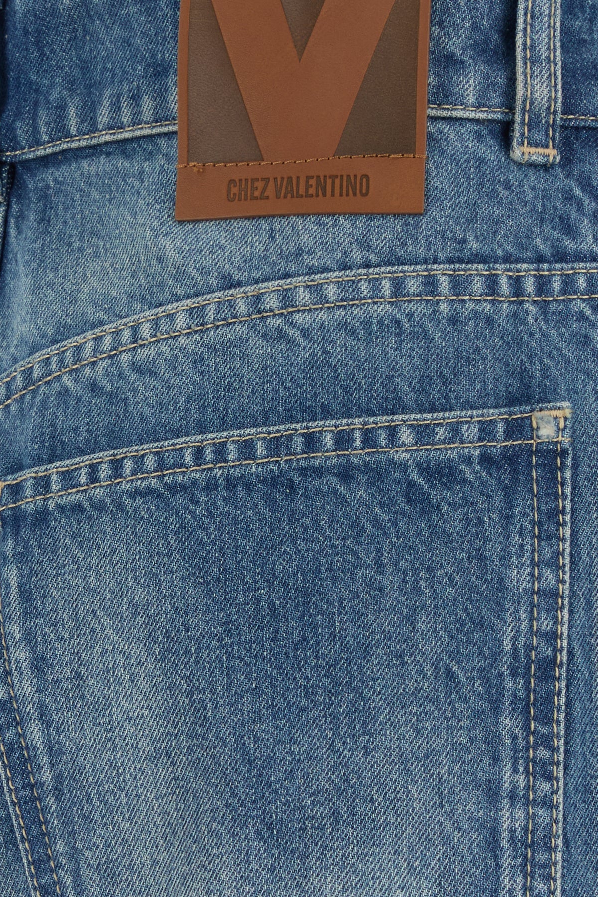Jeans realized in stonewashed pure cotton denim enriched by peculiar embroidery on the hemline.
