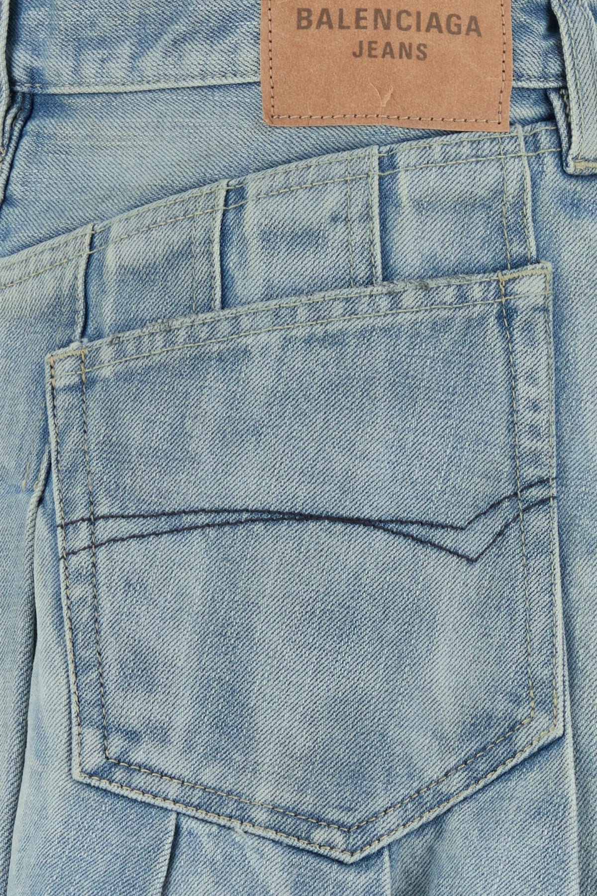 Pleated mini skirt realized in stonewashed and distressed pure cotton denim enriched by Balenciaga label at the back.