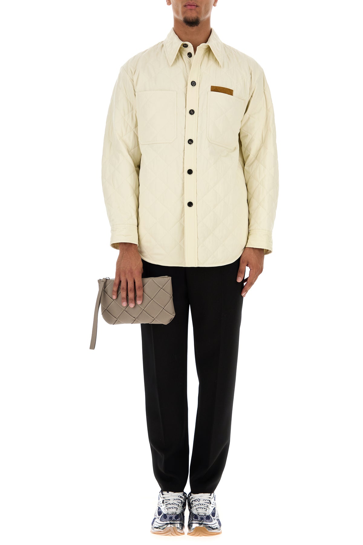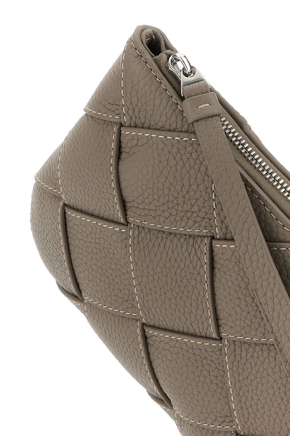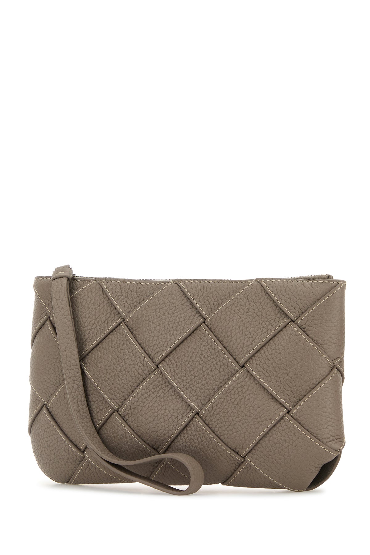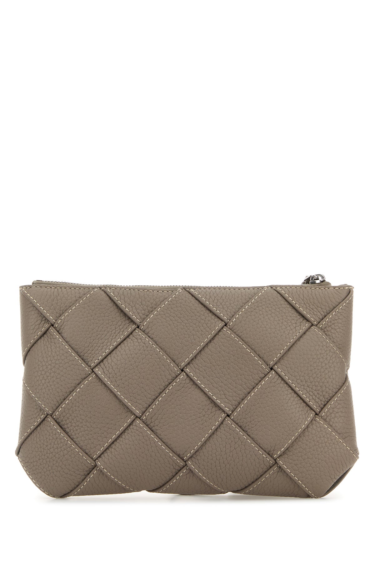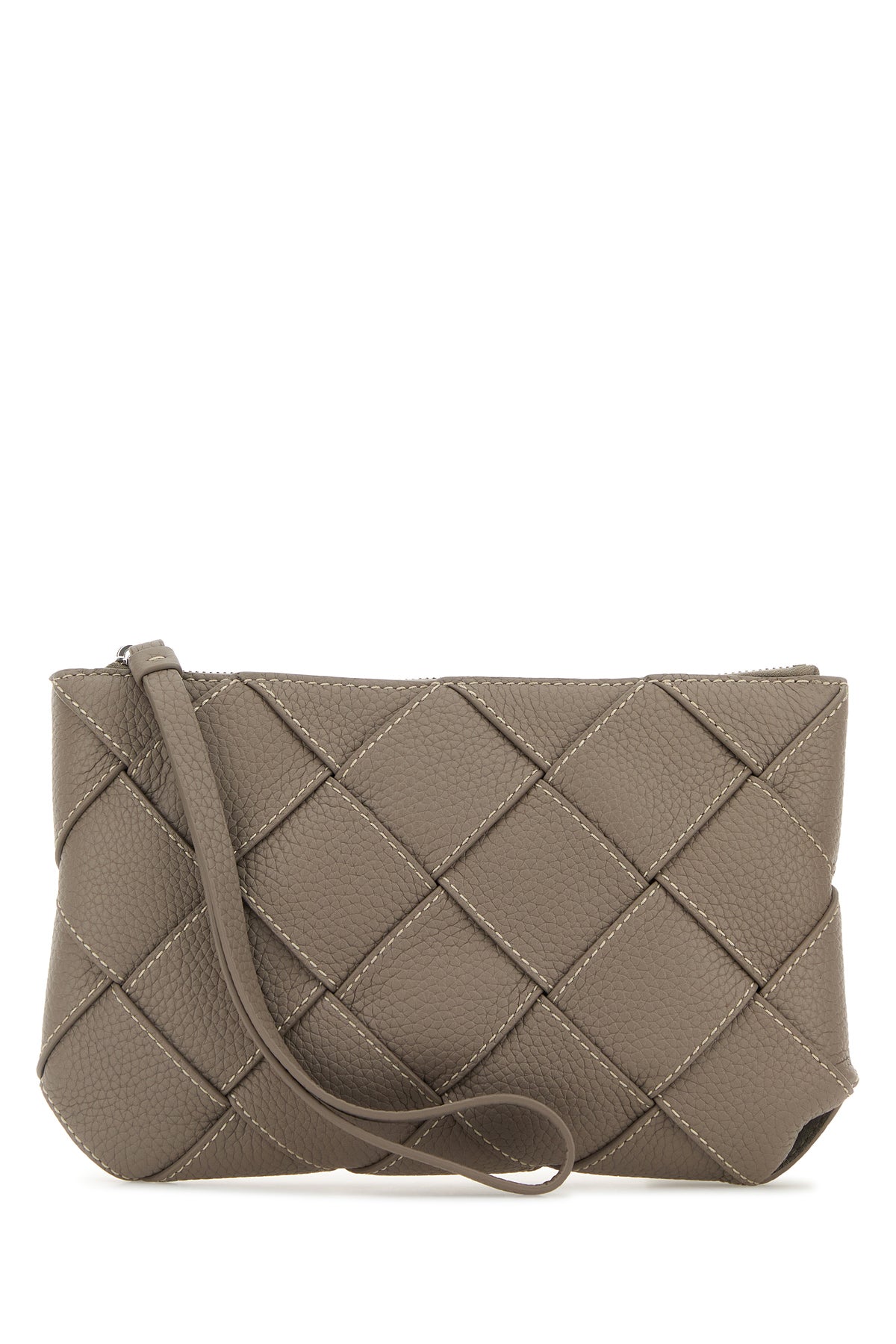 Clutch realized in pebble calf leather characterized by iconic Intrecciato motif on the entire surface.
