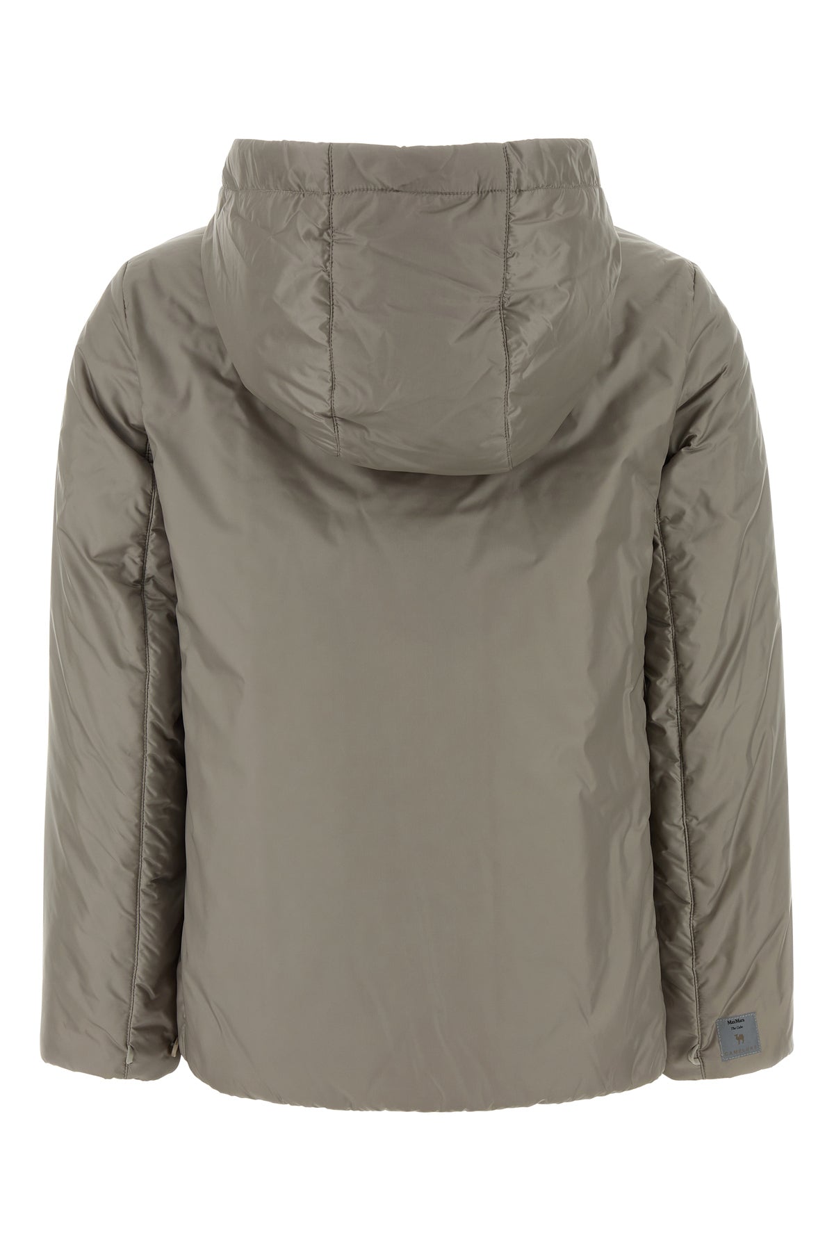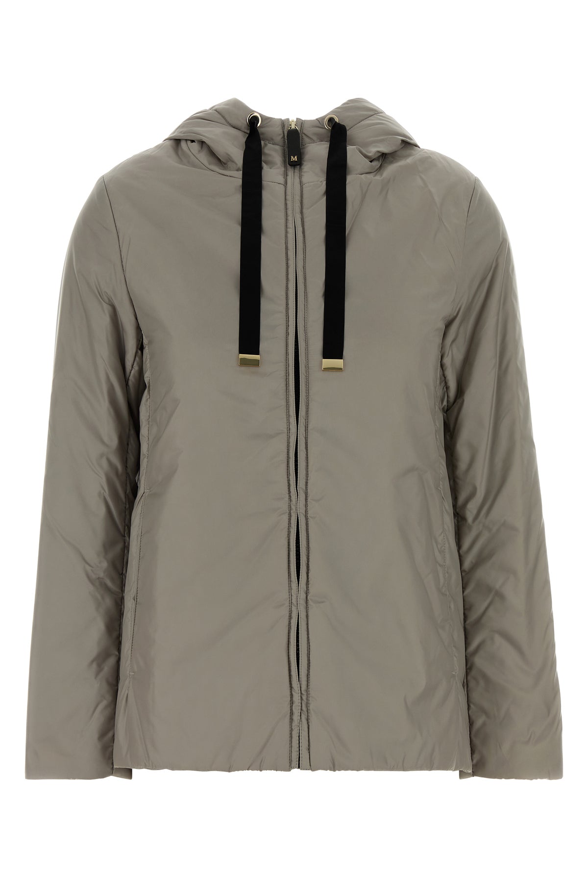 Jacket realized in polyester characterized by maxi drawstring hood.