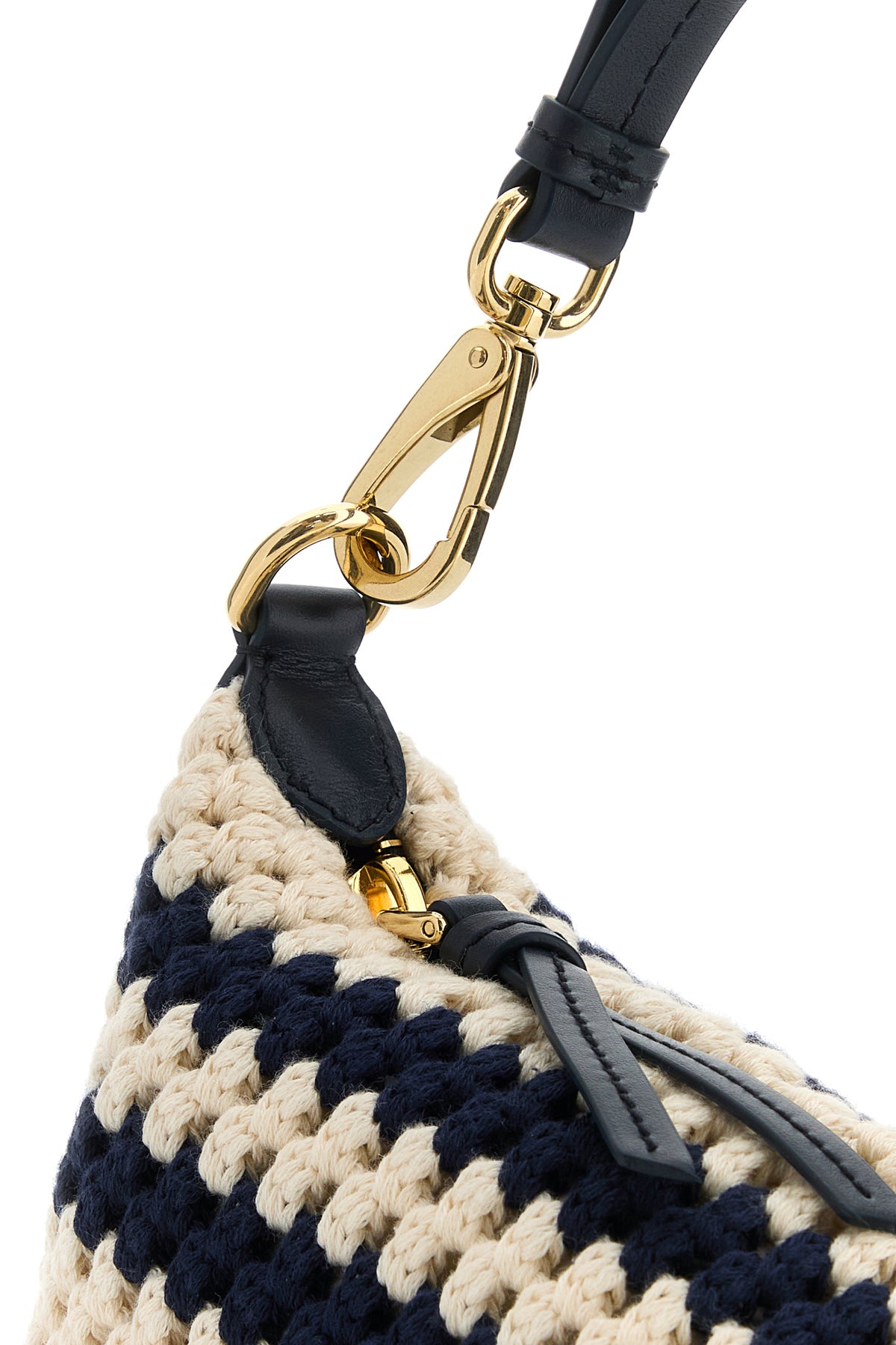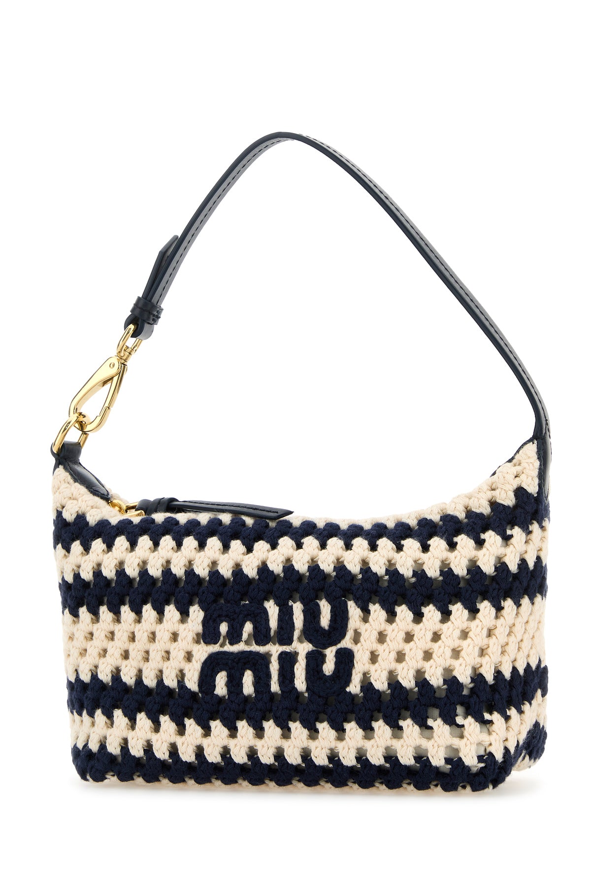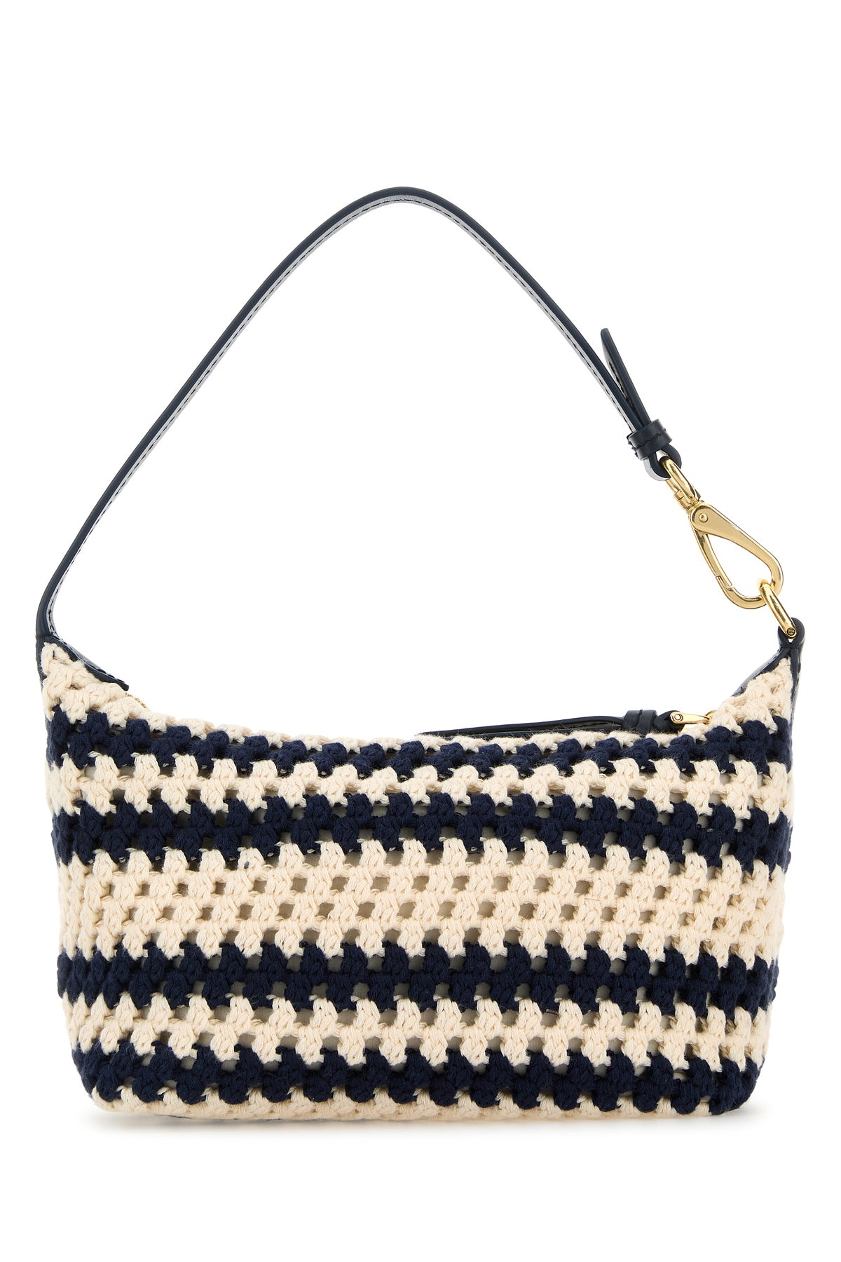 Handbag realized in crochet characterized by striped embroidery on the entire surface and embroidered logo at the front.