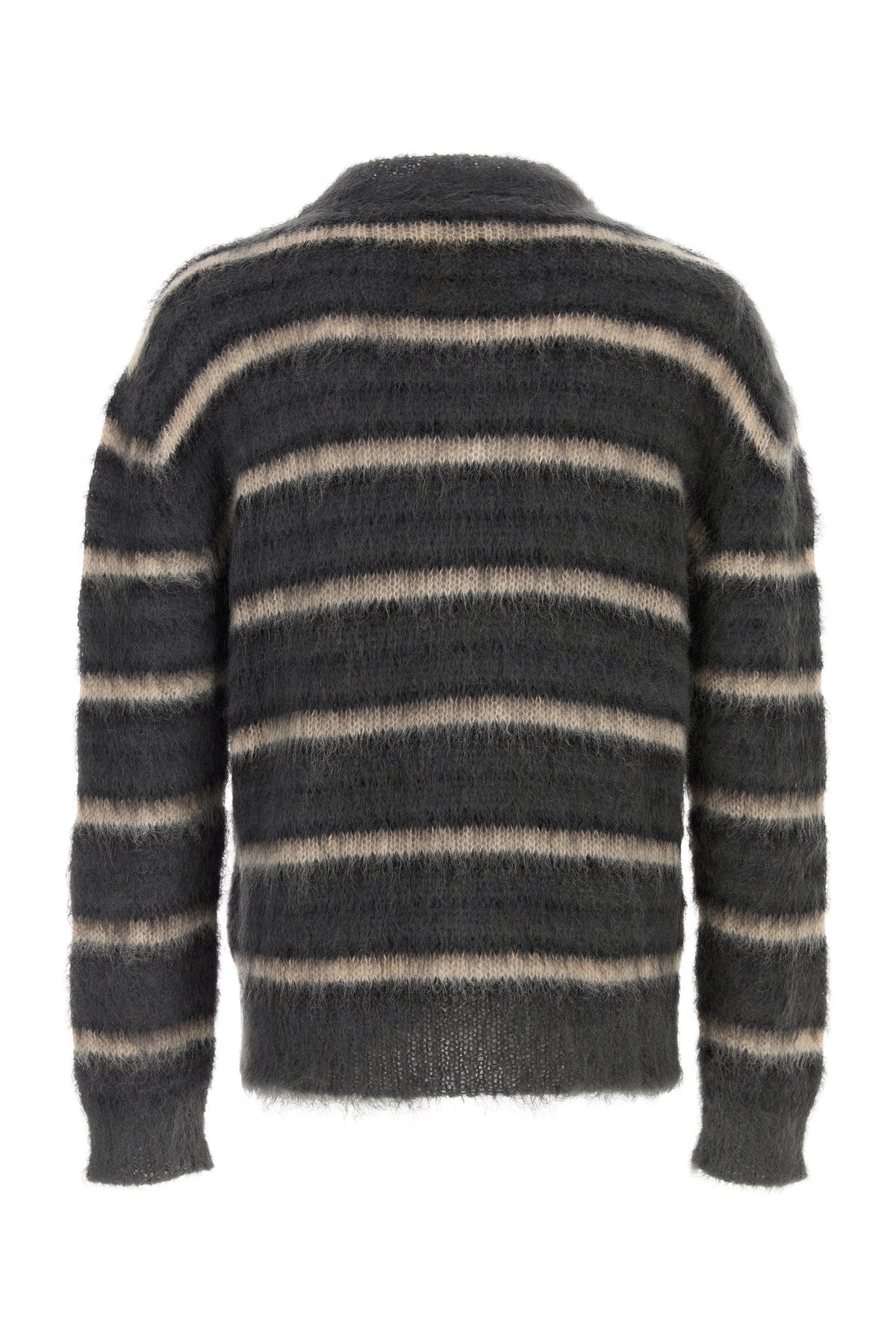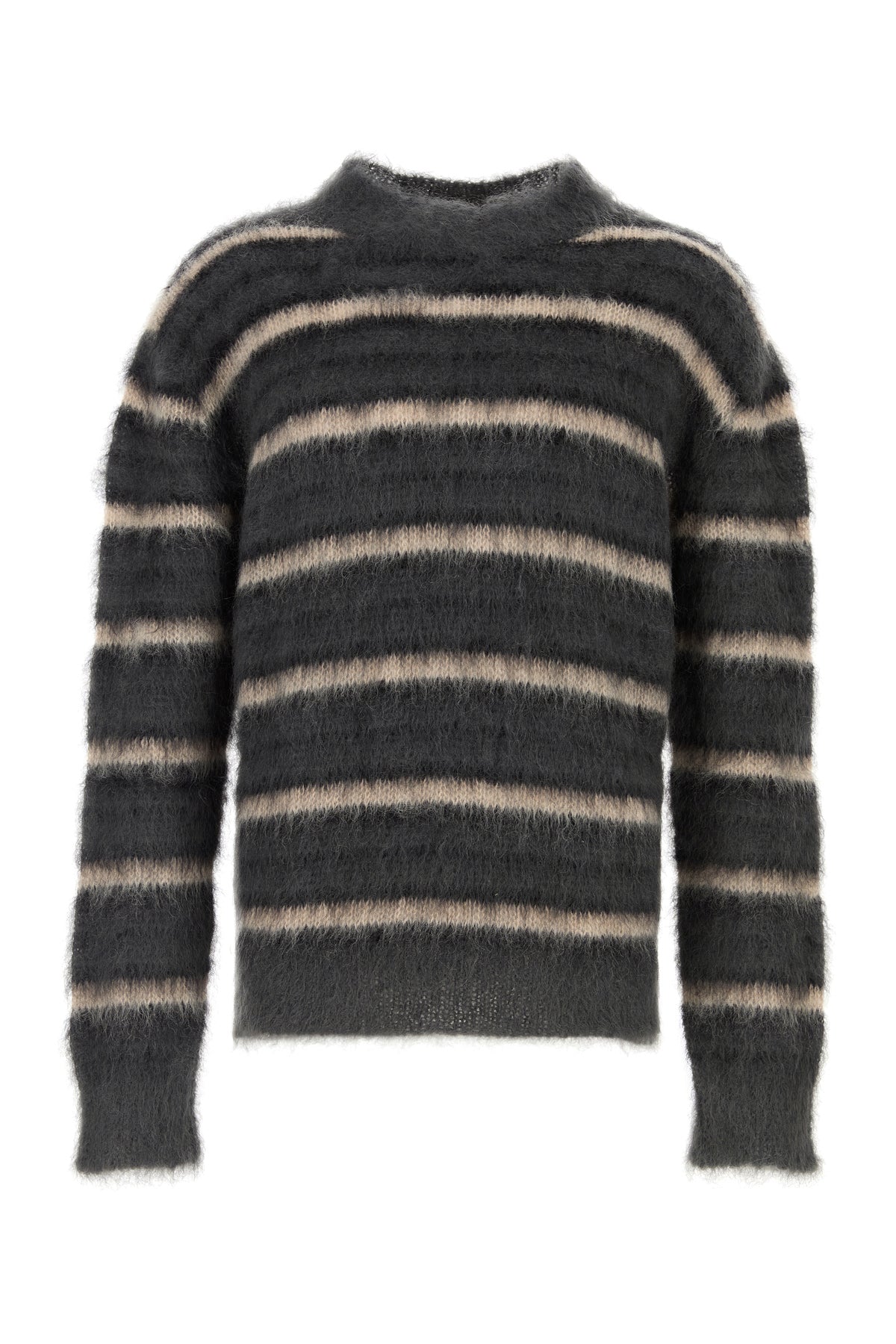 Sweater realized in mohair blend characterized by striped embroidery on the entire surface.