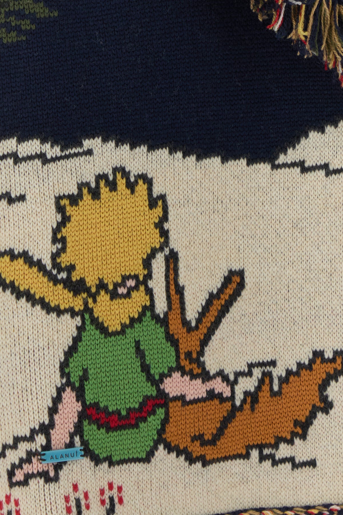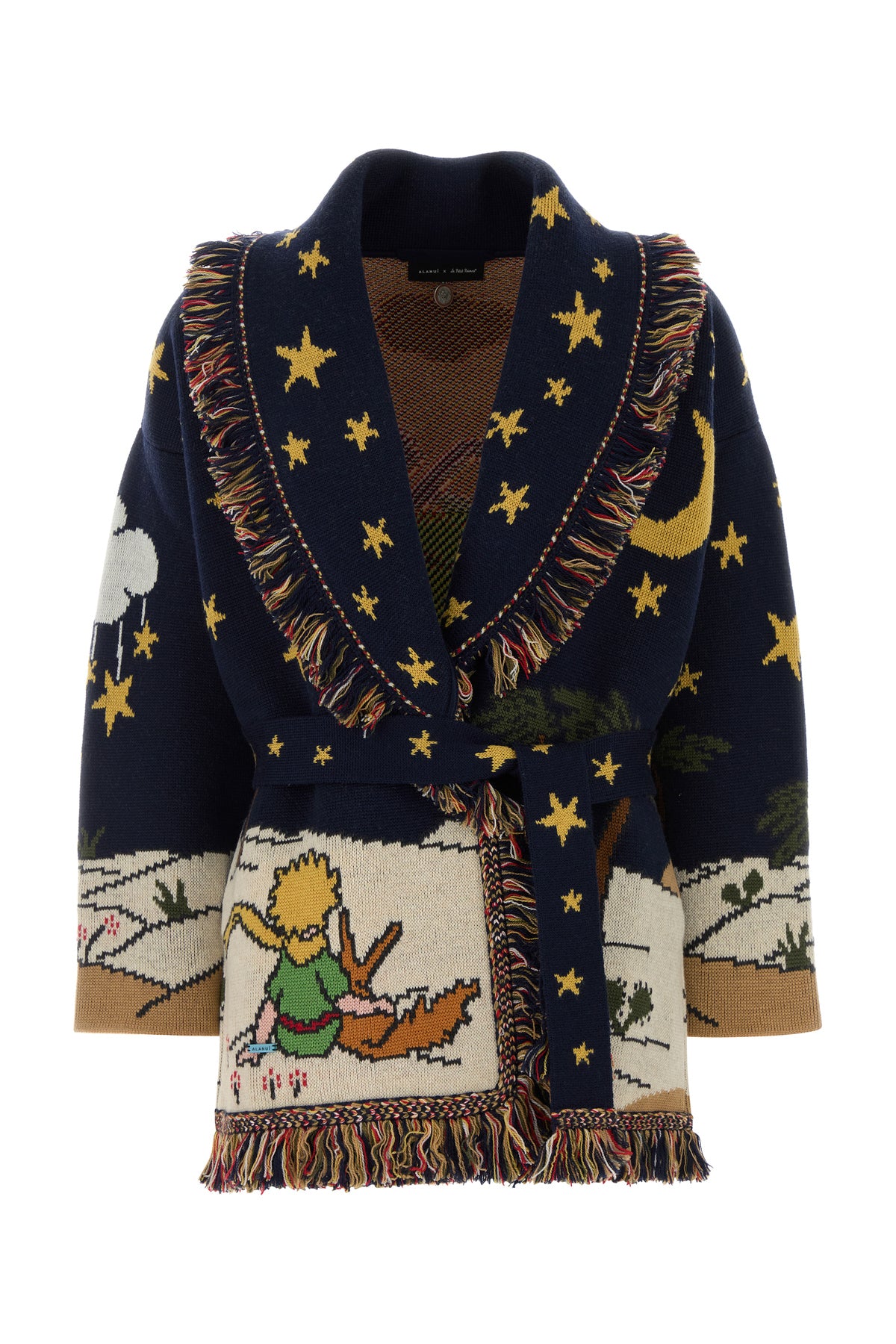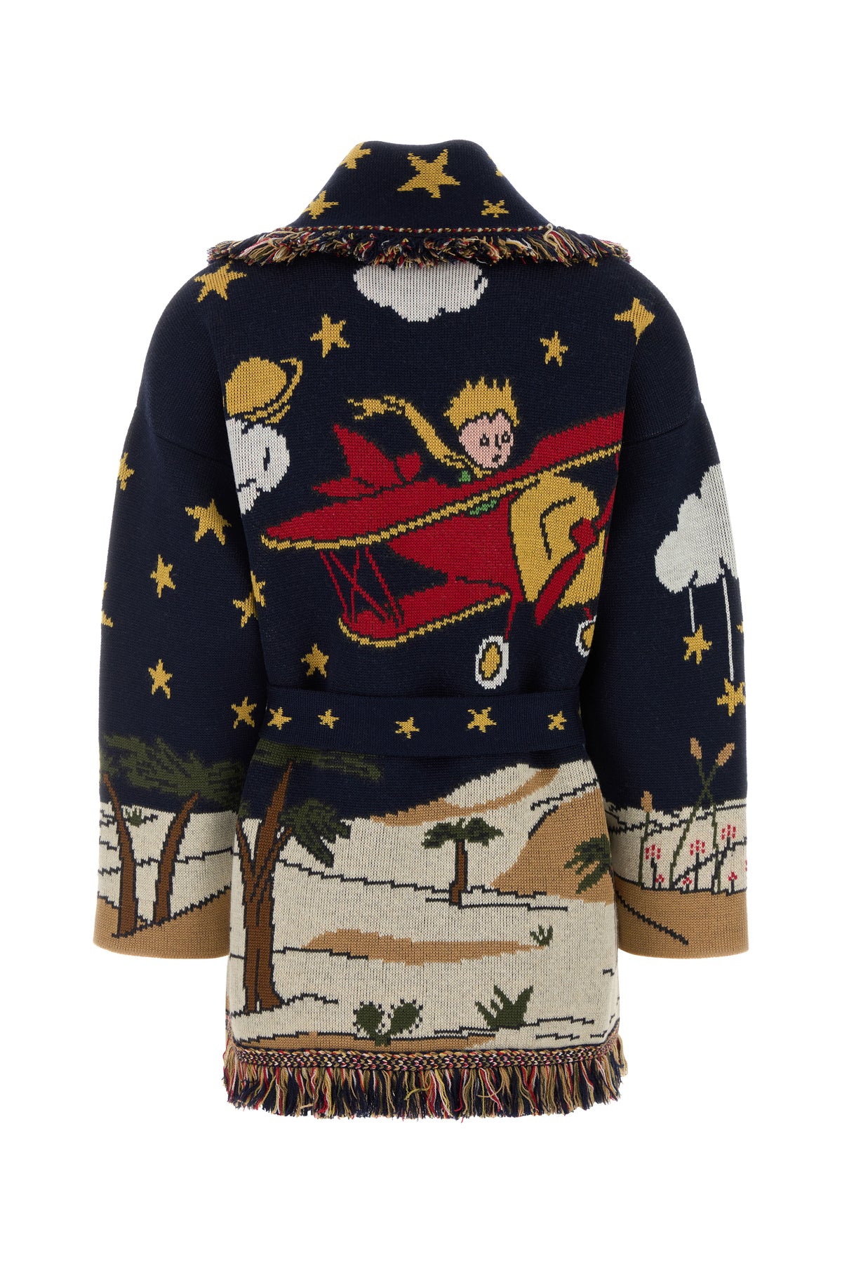 Oversize cardigan realized in pure virgin wool characterized by The Little Prince embroidery on the entire surface.