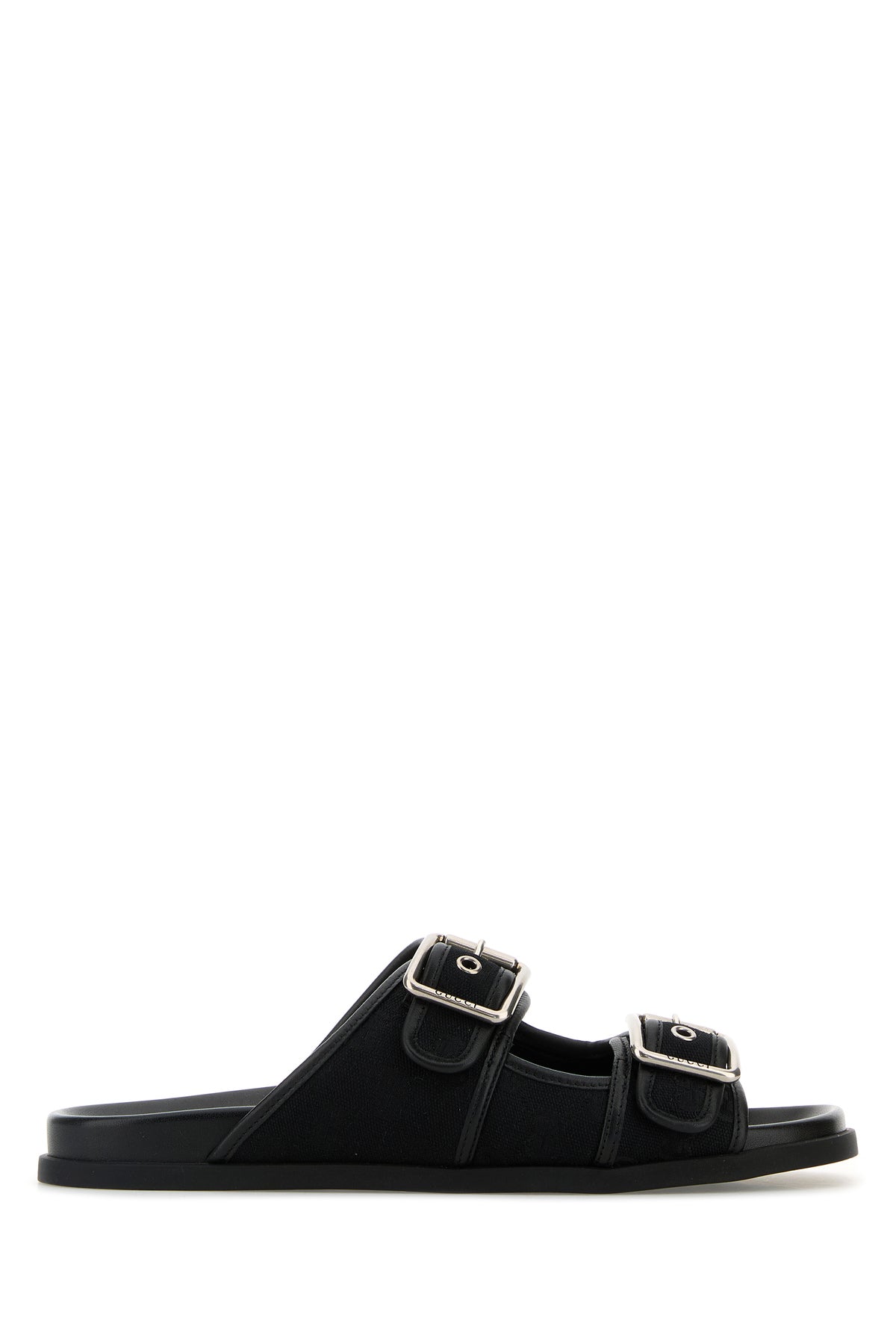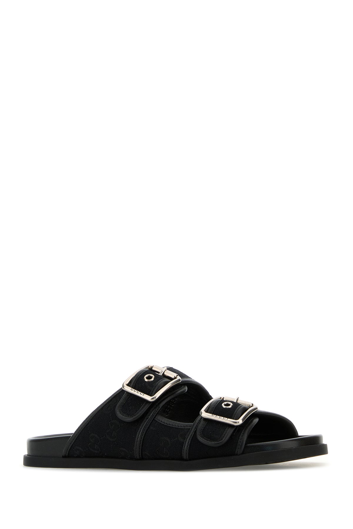 Slippers realized in GG fabric characterized by adjustable straps on the instep.