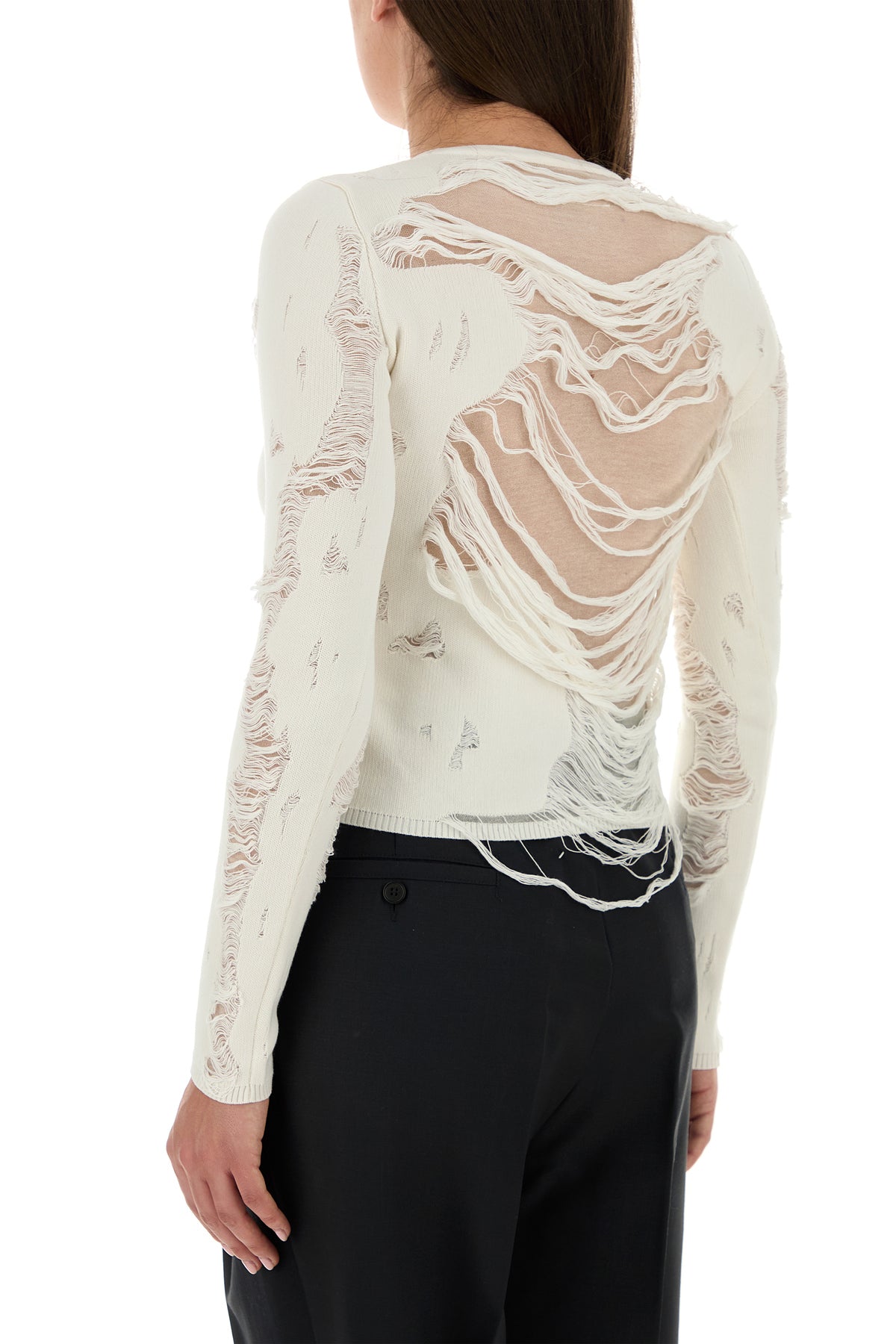 Sweater realized in distressed cotton blend with intentional rips characterized by tonal iconic stitching at the back.