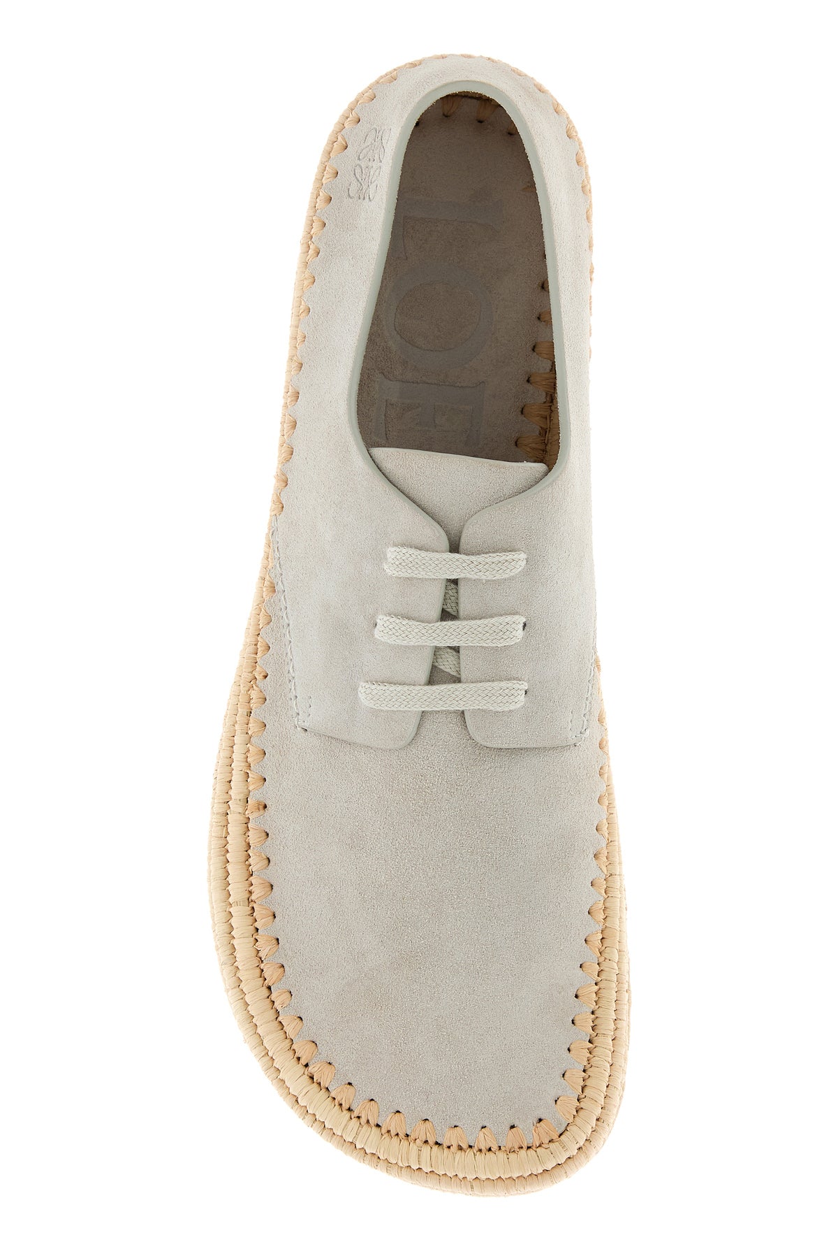 Lace-up shoes realized in suede with woven raffia insert characterized by embossed Anagram motif on the side.
