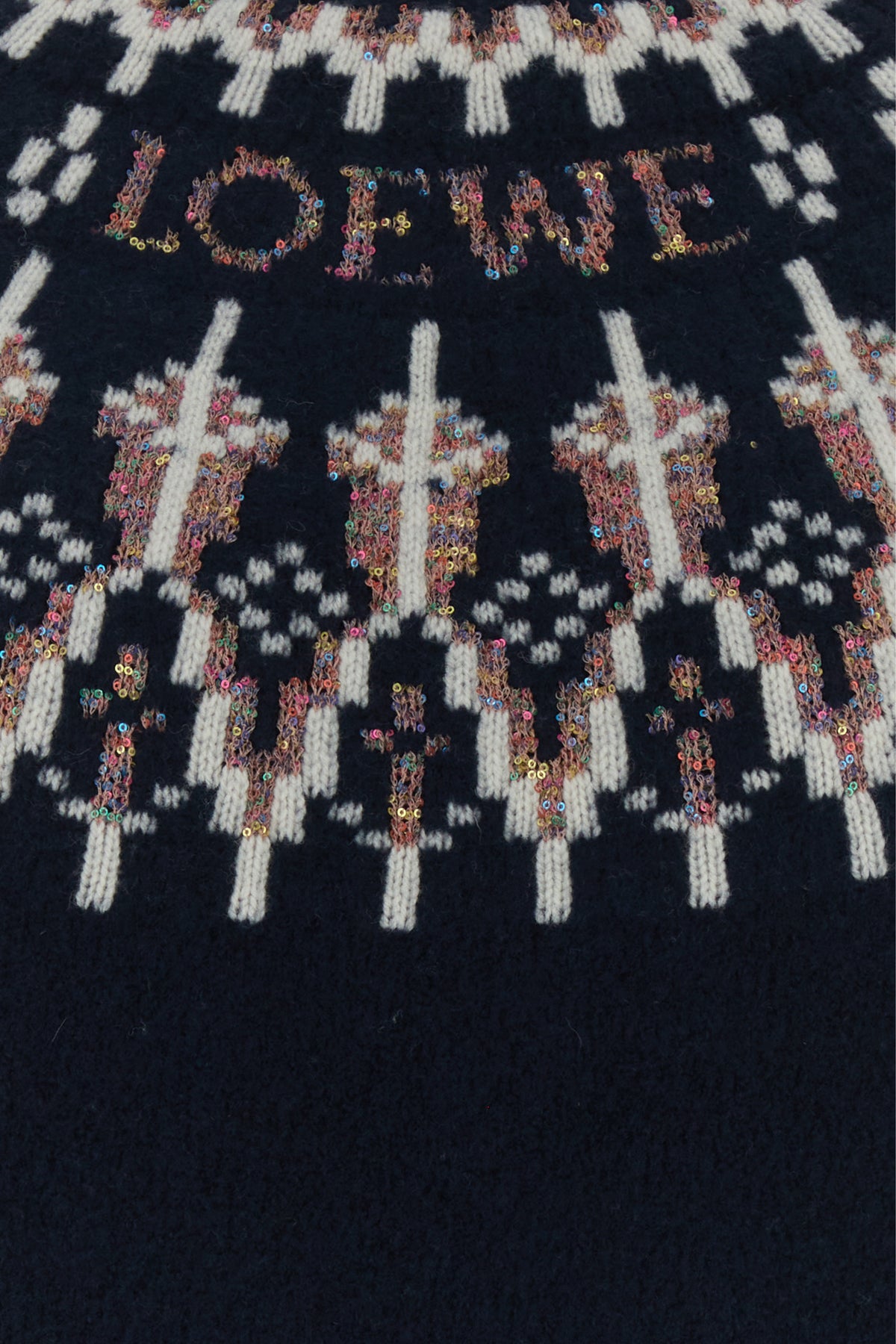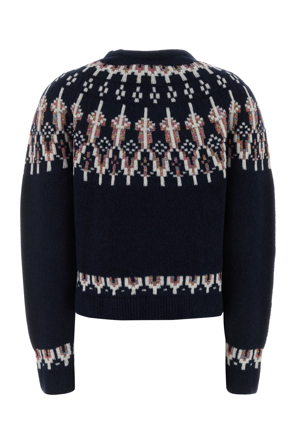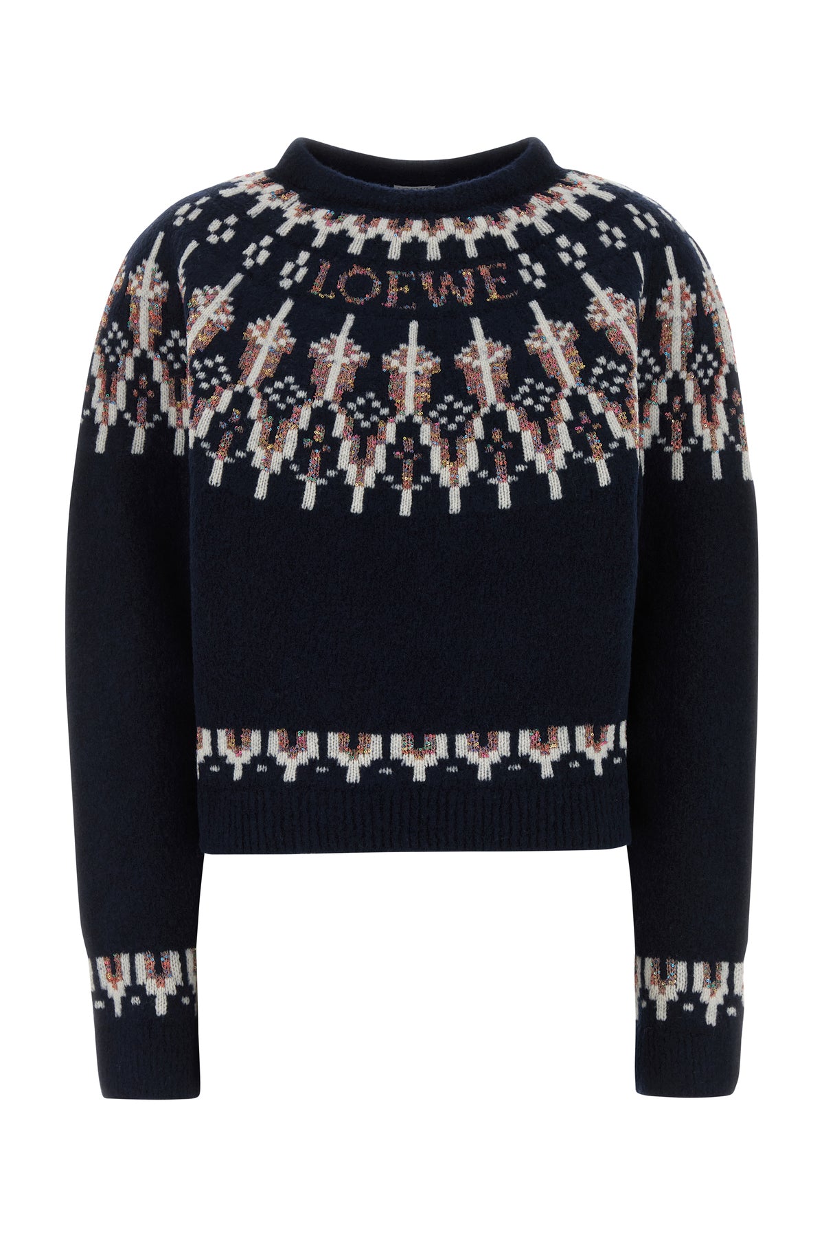 Sweater realized in stretch wool blend characterized by Fair Isle embroidery at the top and on the hemline.