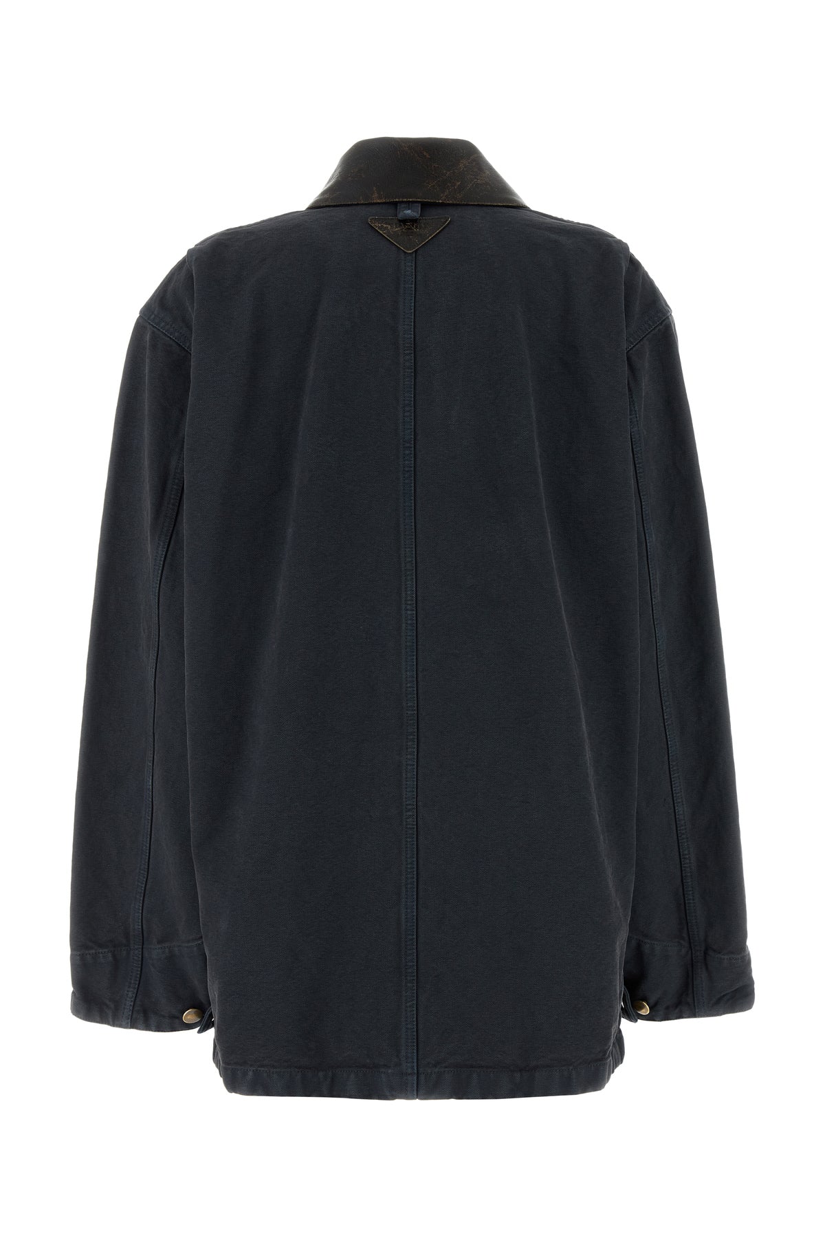 Jacket realized in stonewashed pure cotton enriched by leather iconic logoed triangle at the back.
