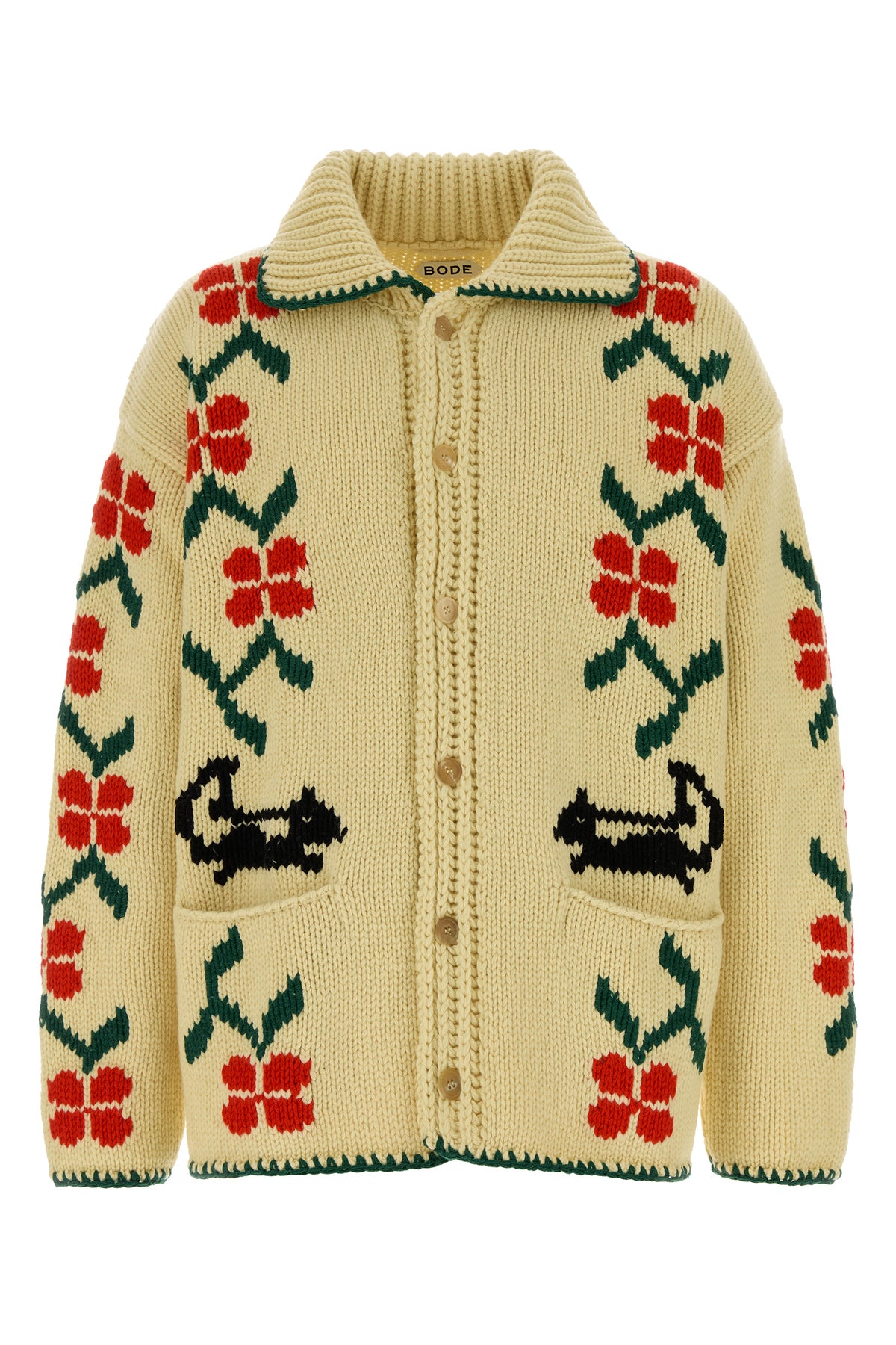 Cardigan realized in pure virgin wool characterized by peculiar embroidery on the entire surface.