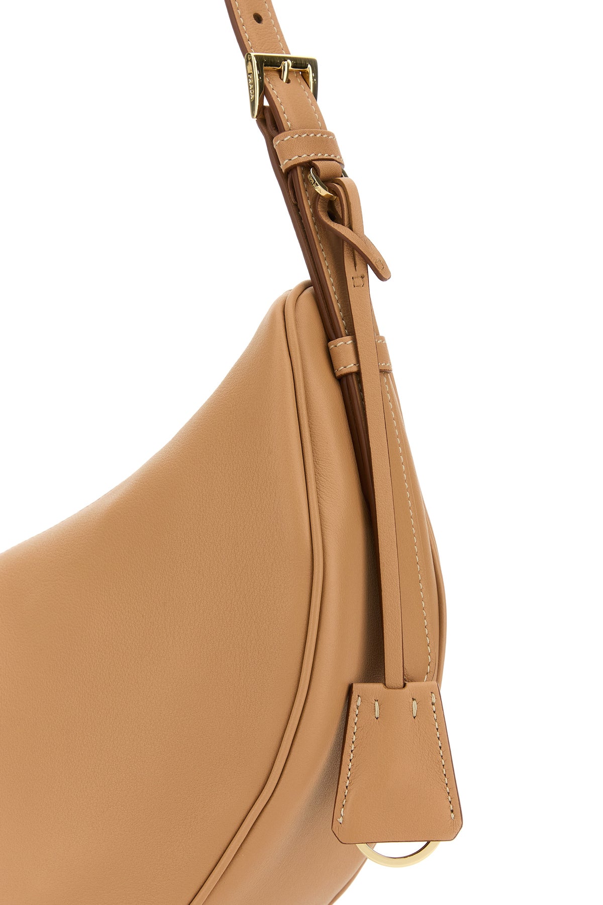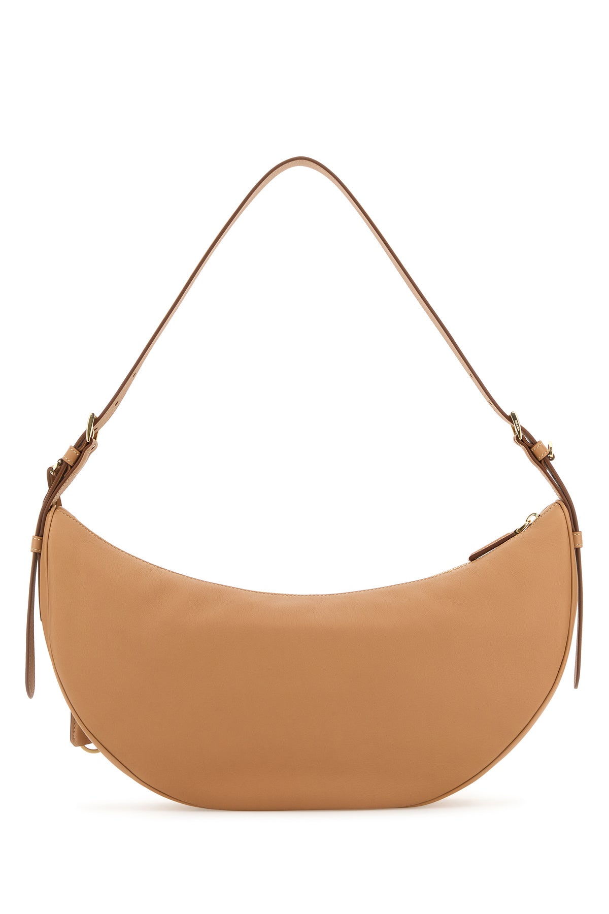 Crossbody bag realized in pebble leather enriched by iconic logoed metal triangle at the front.