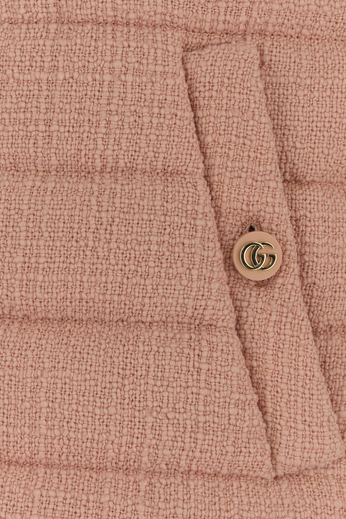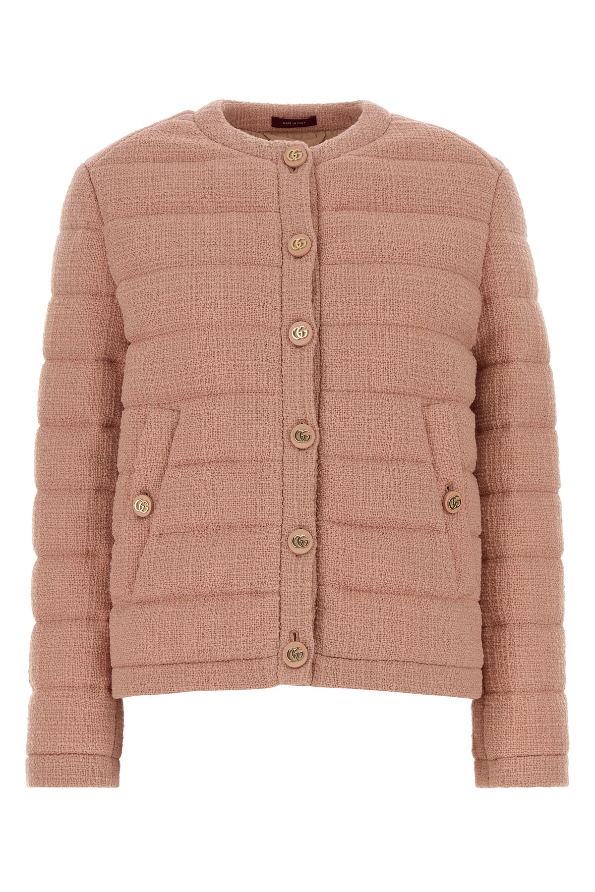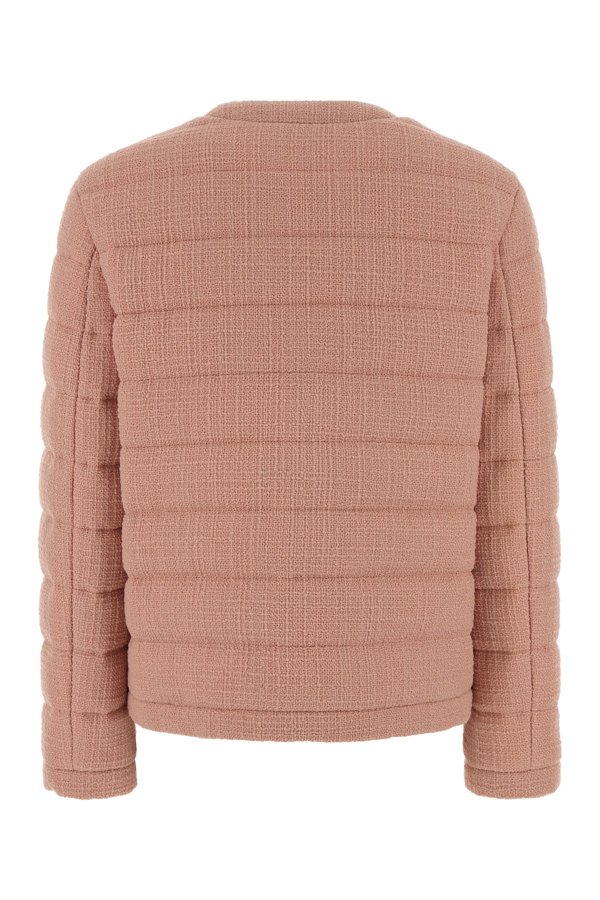 Padded jacket realized in boucle characterized by logoed buttons closure.