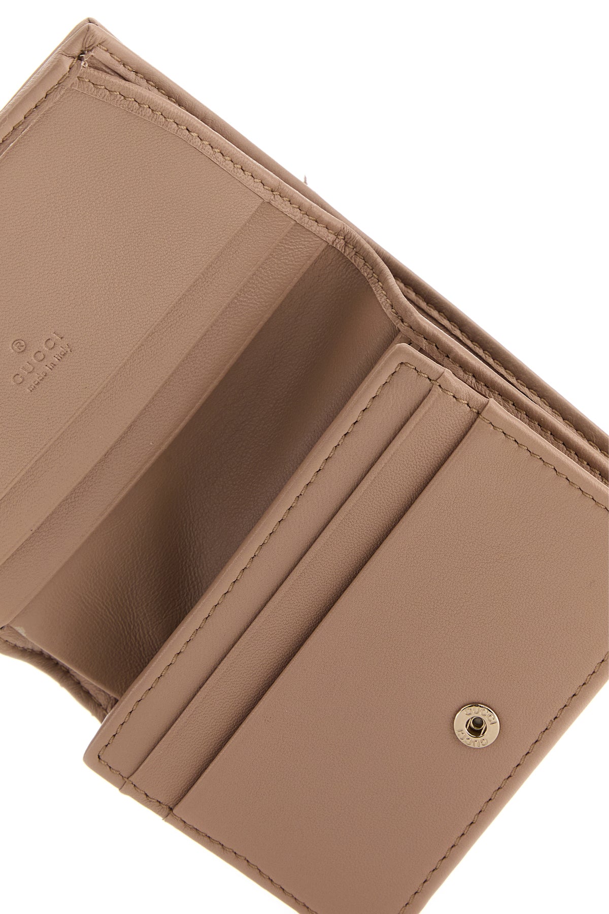 - Interior with a bill compartments, a zip pocket, a slit pocket and five credit card slots