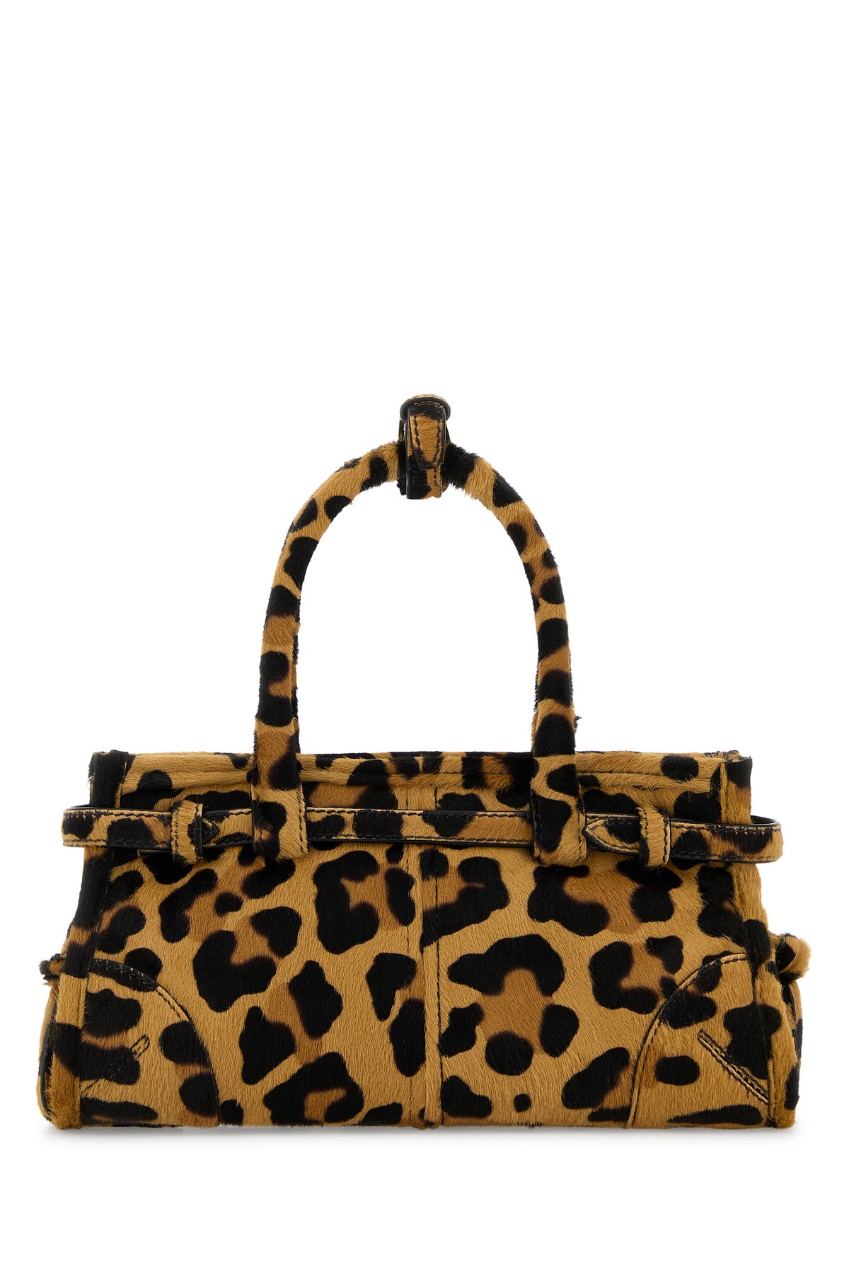 Handbag realized in calf leather characterized by animal print on the entire surface enriched by iconic logoed metal triangle at the front.