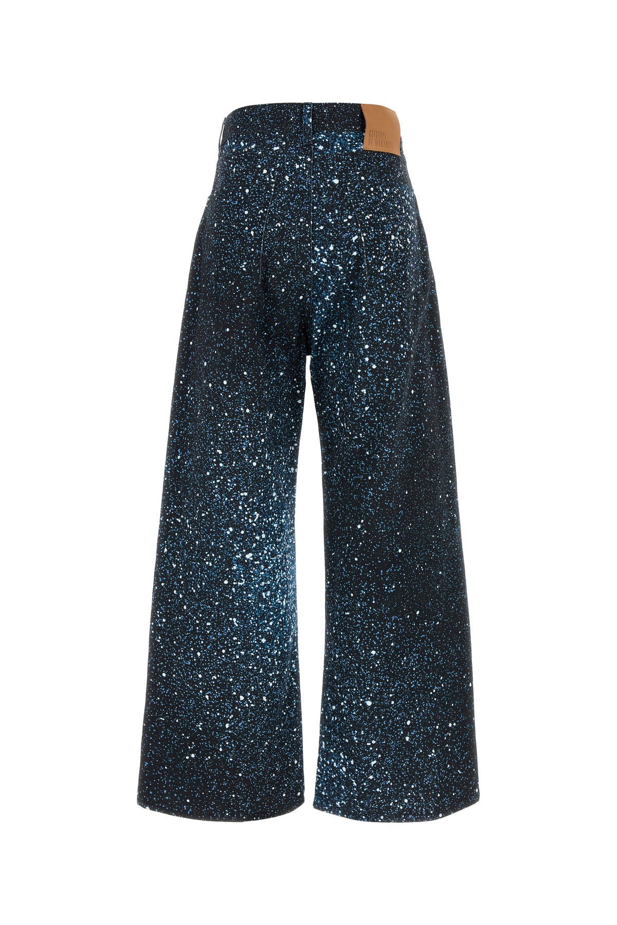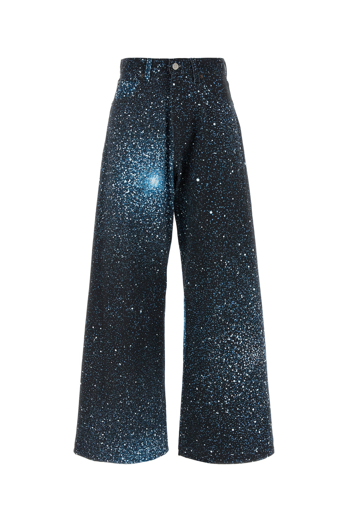Wide-leg jeans realized in stretch cotton denim characterized by peculiar print on the entire surface enriched by rhinestones at the front.
