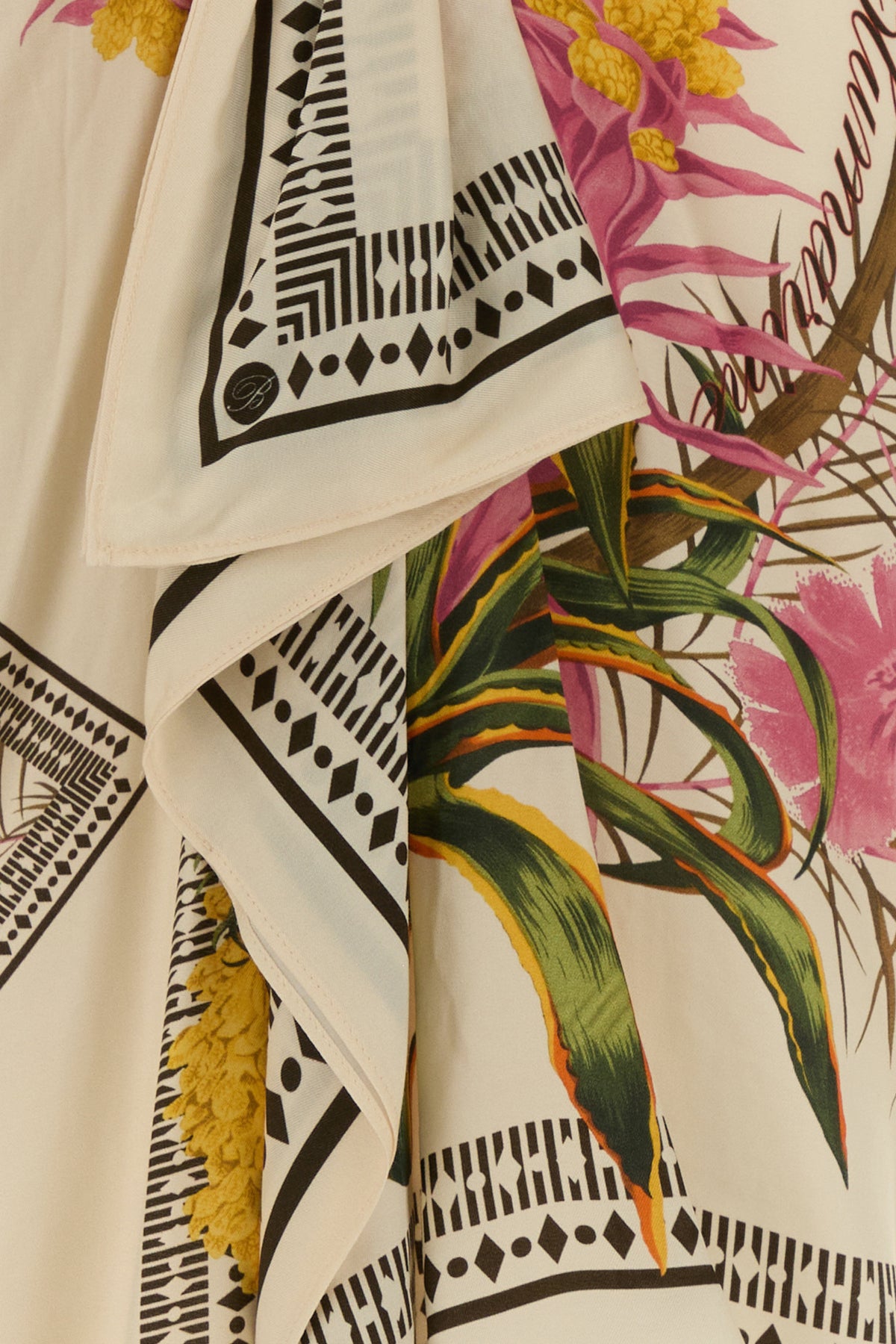 Asymmetric skirt realized in viscose twill characterized by Foulard print on the entire surface.