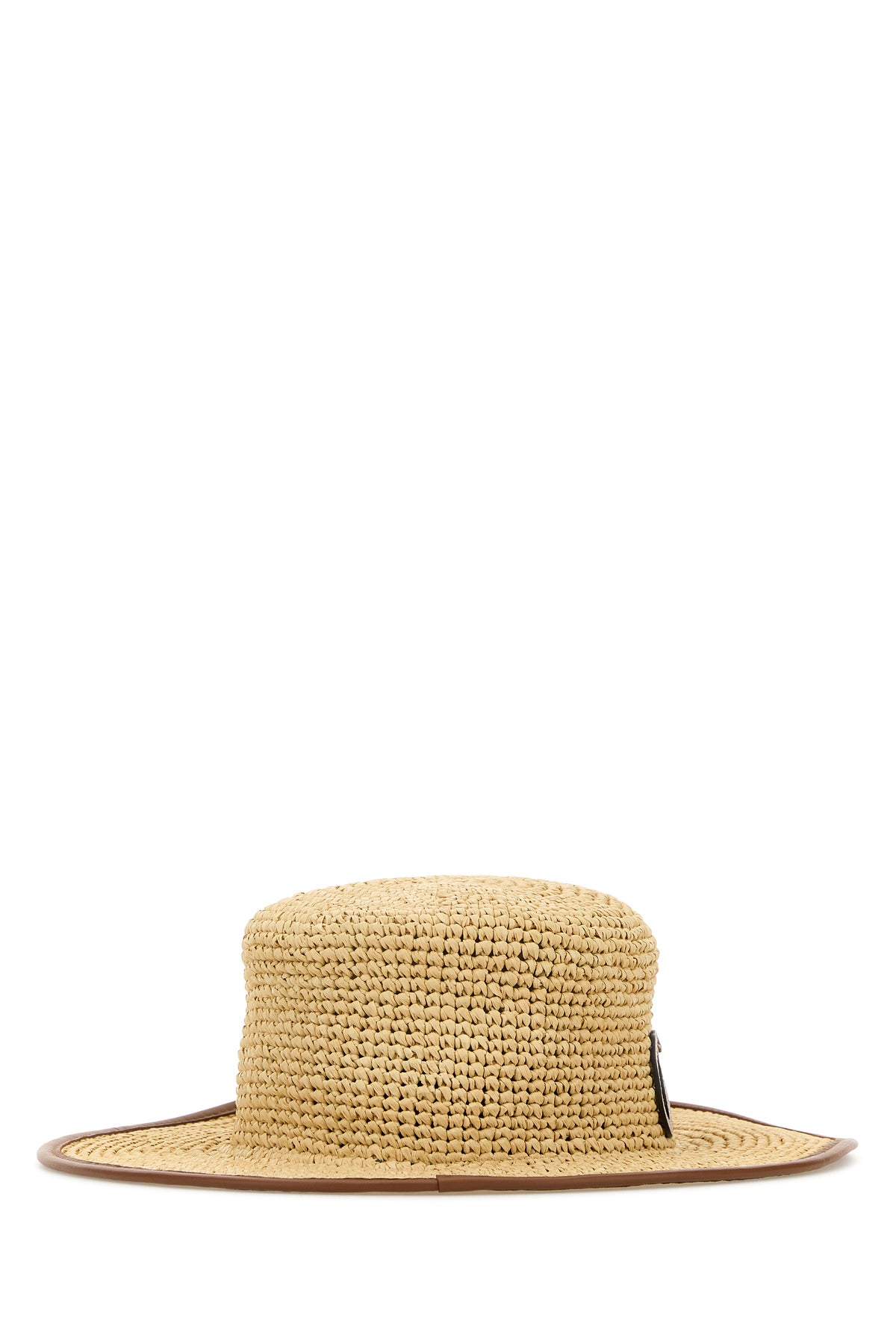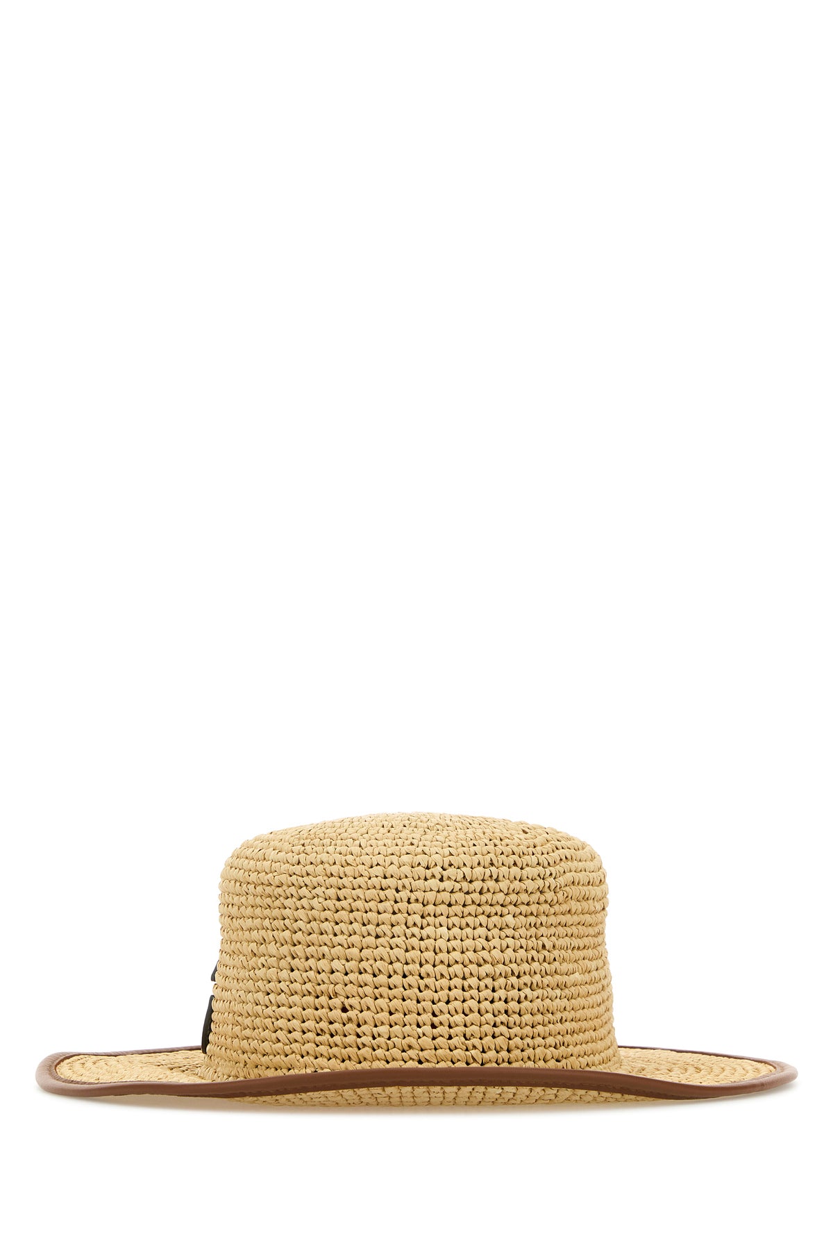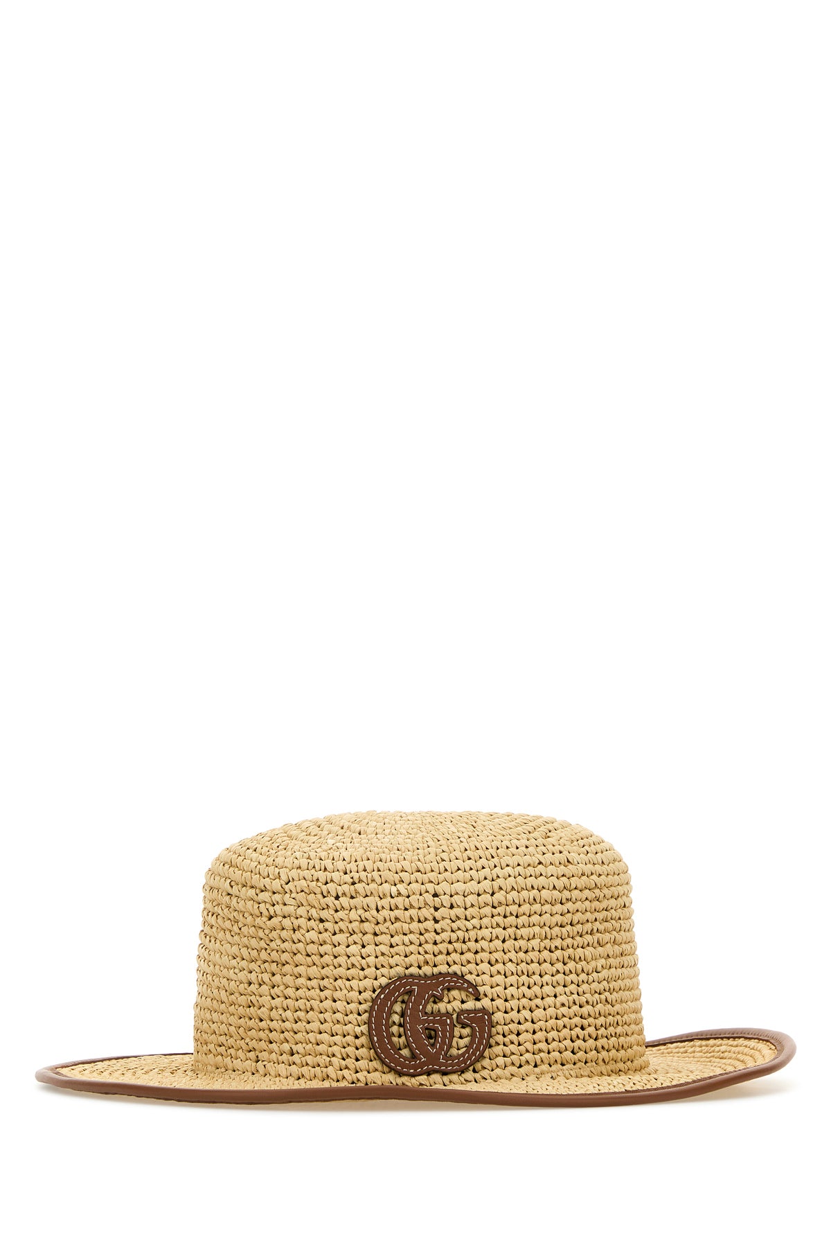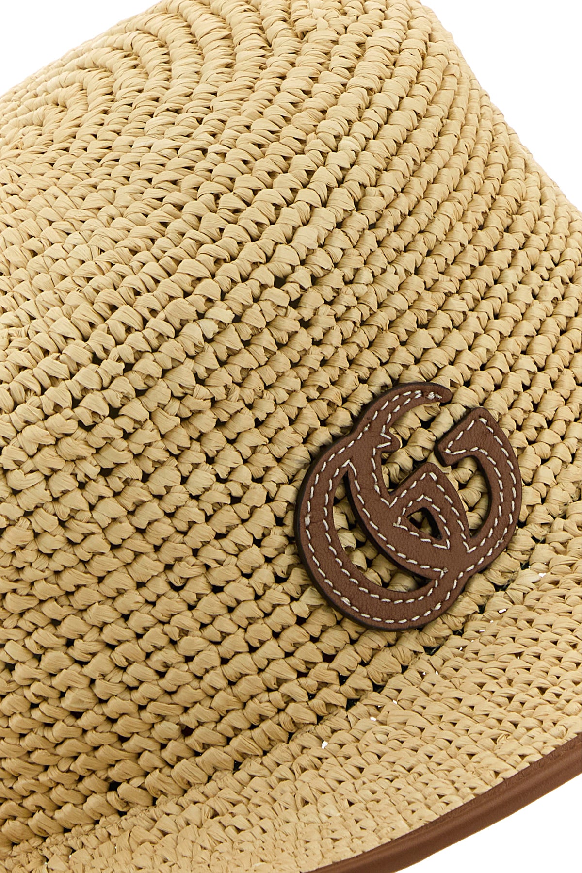 Hat realized in woven raffia with leather trimming enriched by leather GG patch on the side.