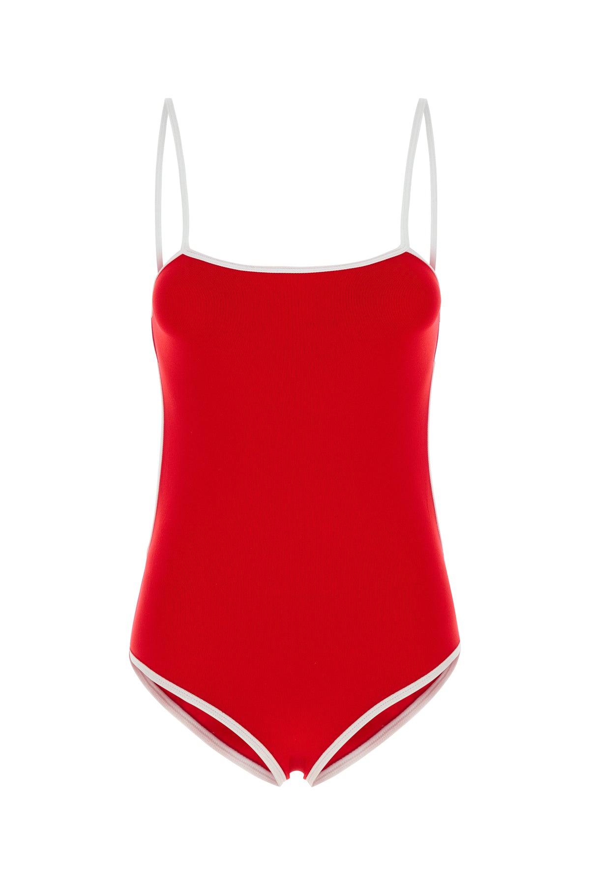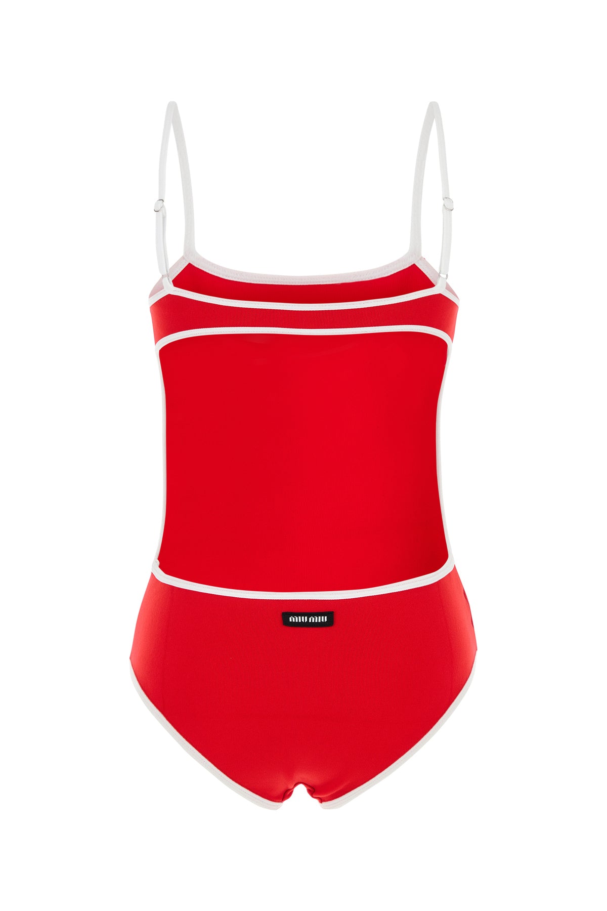 Swimsuit realized in stretch nylon enriched by contrasting logoed label at the back.