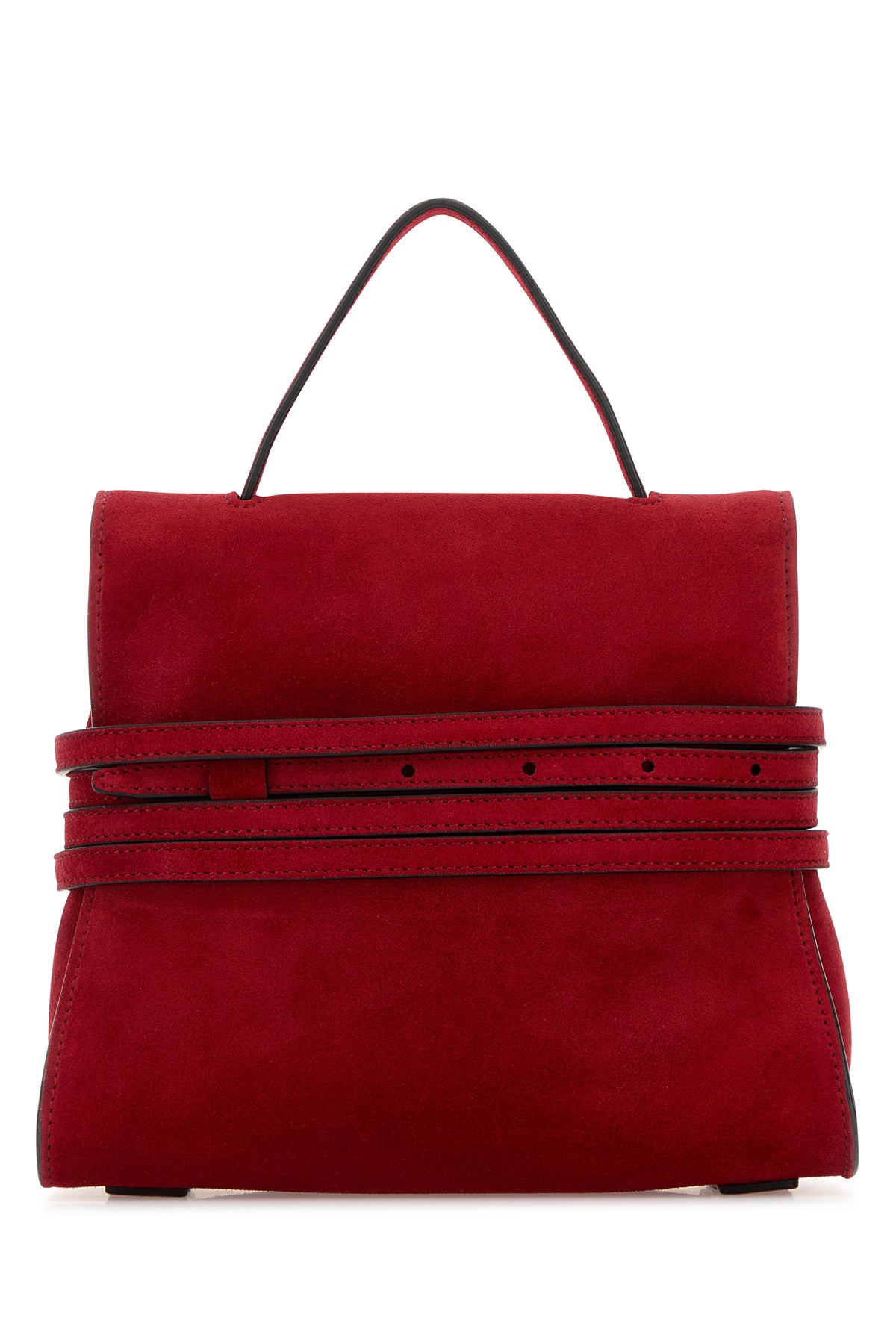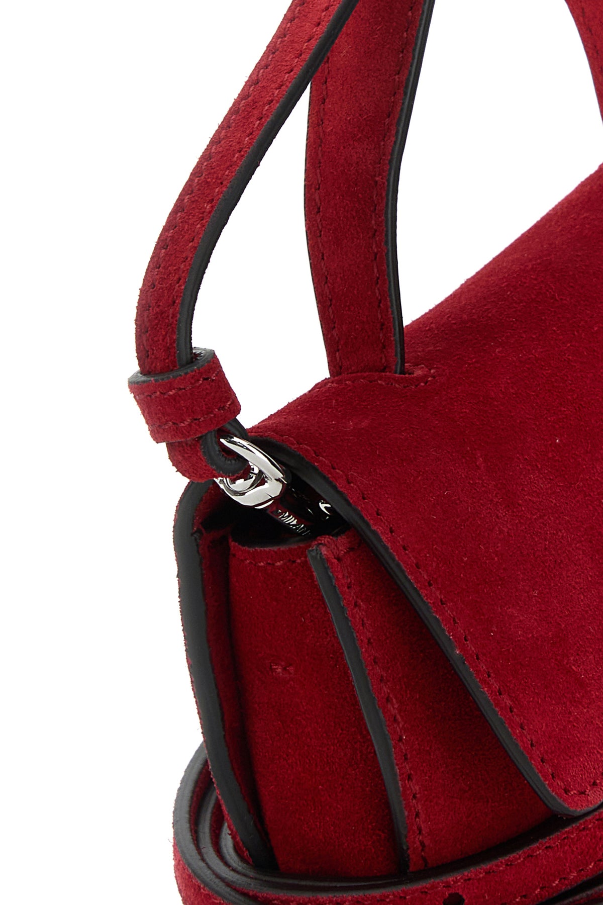 Handbag realized in suede characterized by embossed logo on the flap enriched by decorative tonal leather belt.