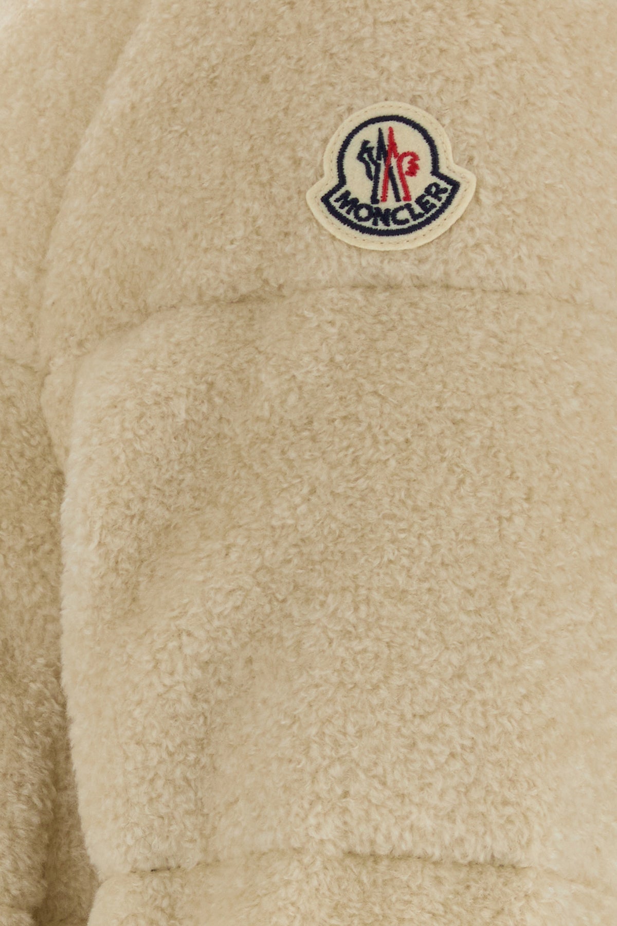 Down jacket realized in teddy fabric enriched by contrasting logoed patch on the sleeve.