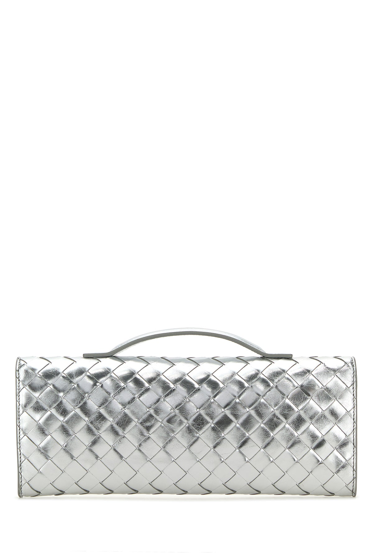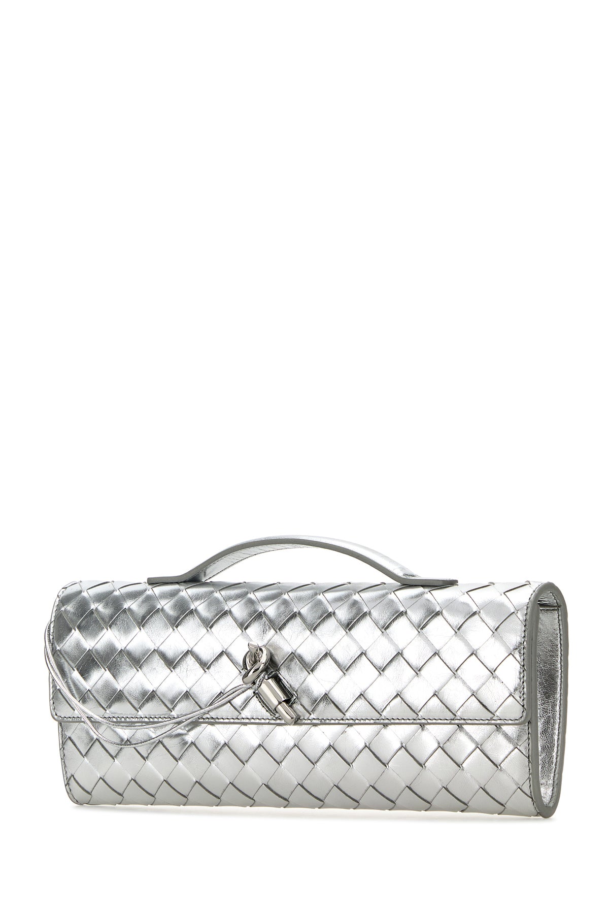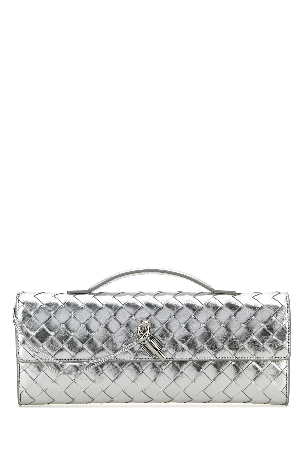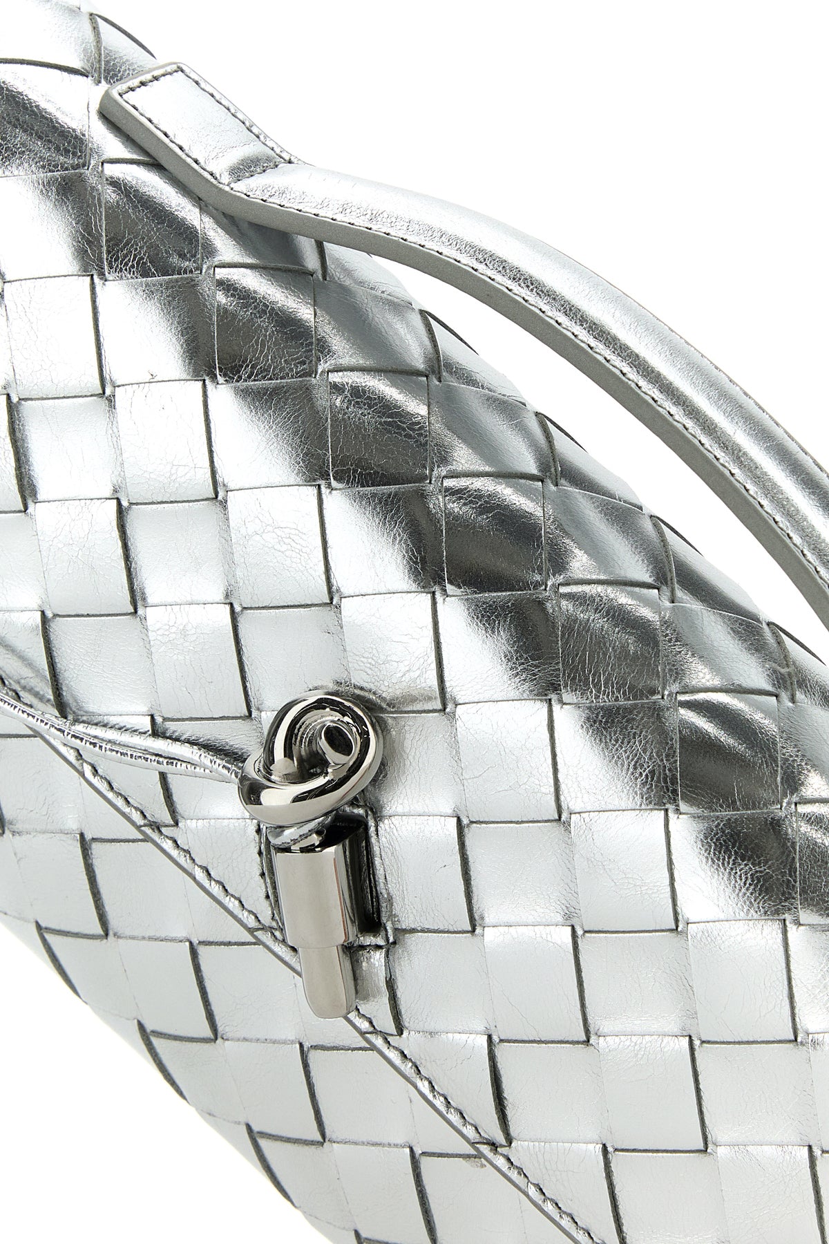 Handbag realized in laminated leather characterized by iconic Intrecciato motif on the entire surface.