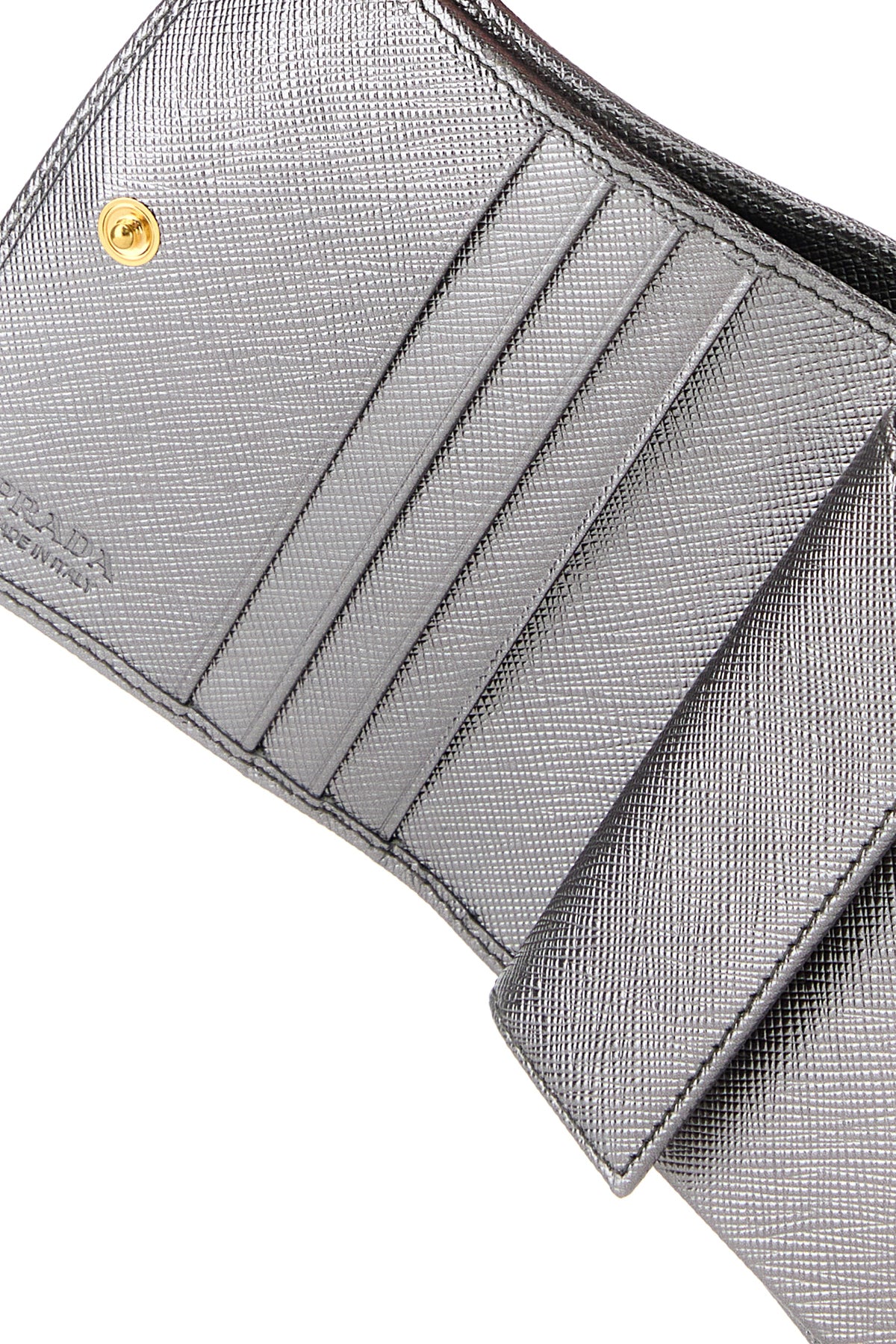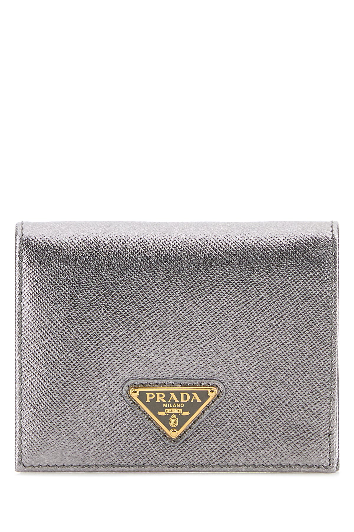Wallet realized in laminated Saffiano leather enriched by iconic logoed triangle at the front.